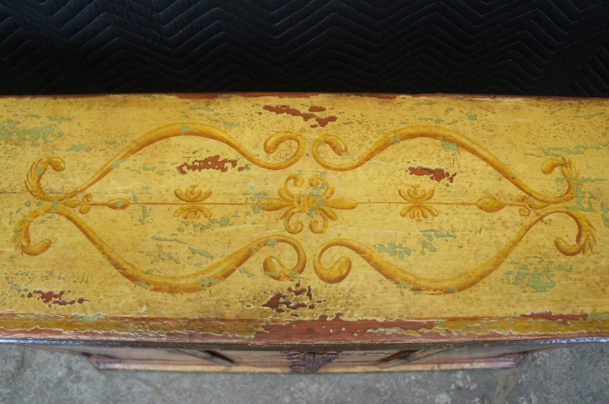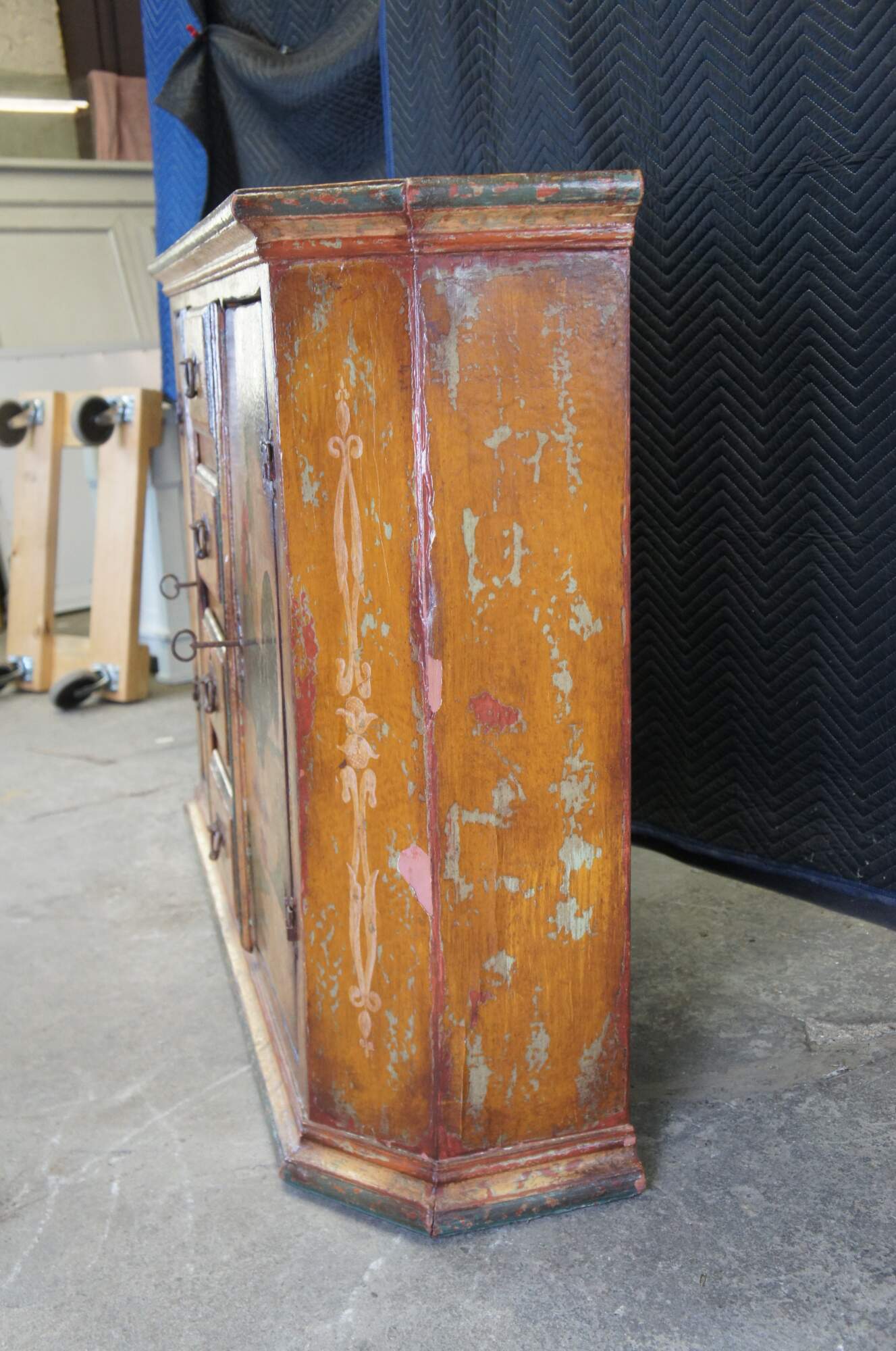 A stylish modern Tuscan farmhouse credenza, circa last quarter 20th century. Inspired by Old World French Country styling. The slender case is made from heavy hardwood featuring 4 central drawers flanked by outer cabinets. Outer doors open to a single shelf with scalloped front apron. Finish is a polychrome, hand painted with colorful motifs and farmhouse scenes with facing roosters Great for use as a credenza, console or sideboard. Includes ornate skeleton keys for each door. Naturally distressed giving the appearance of an antique.