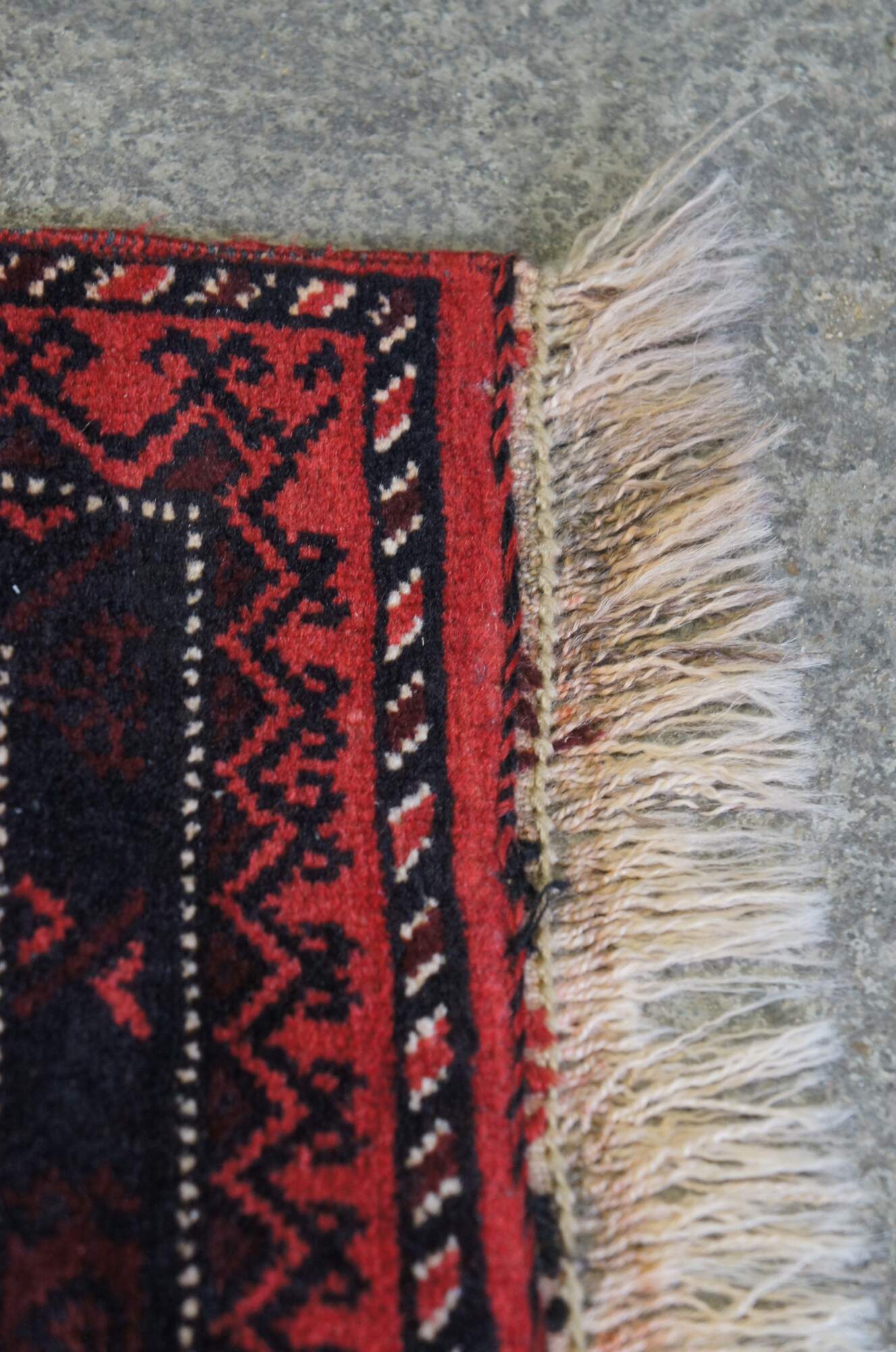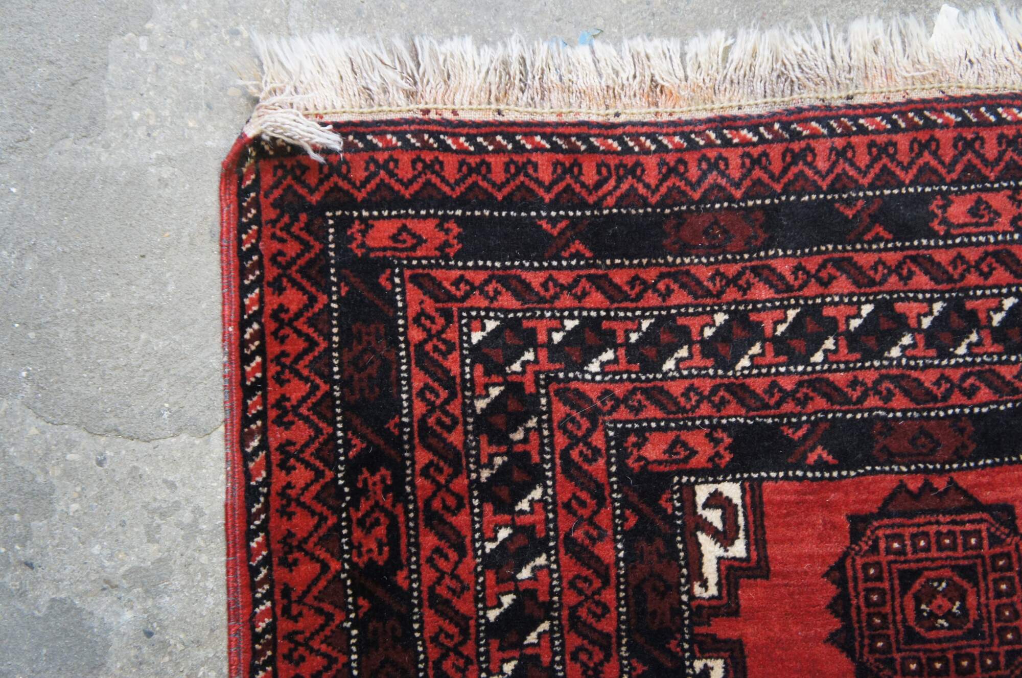 A beautiful hand knotted wool geometric area rug. Features reds and beige