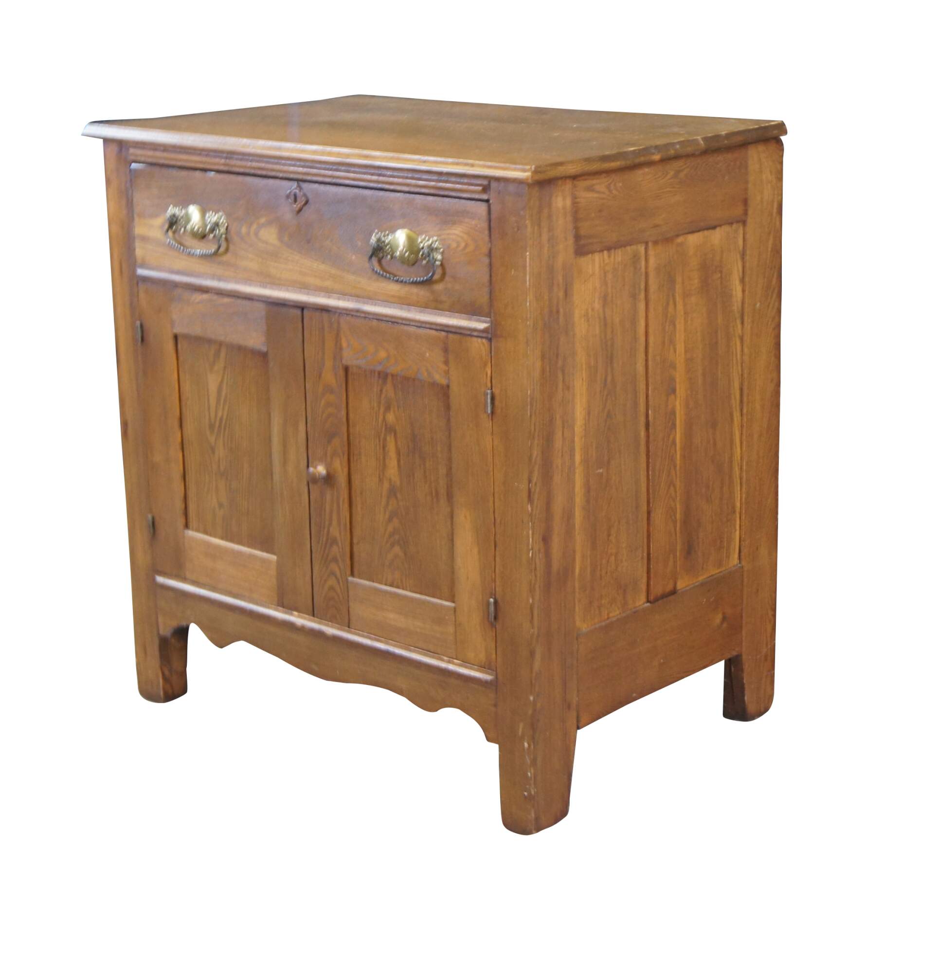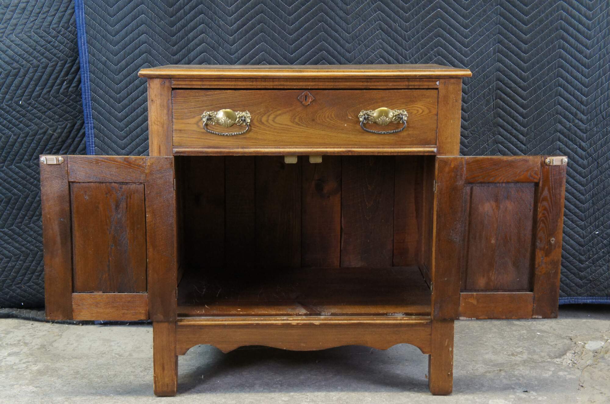 A quaint Victorian Era Washstand. Made from oak with one dovetailed drawer featuring ornate brass hardware and lower cabinet for storage. The drawer has a neat diamond carved key escutcheon