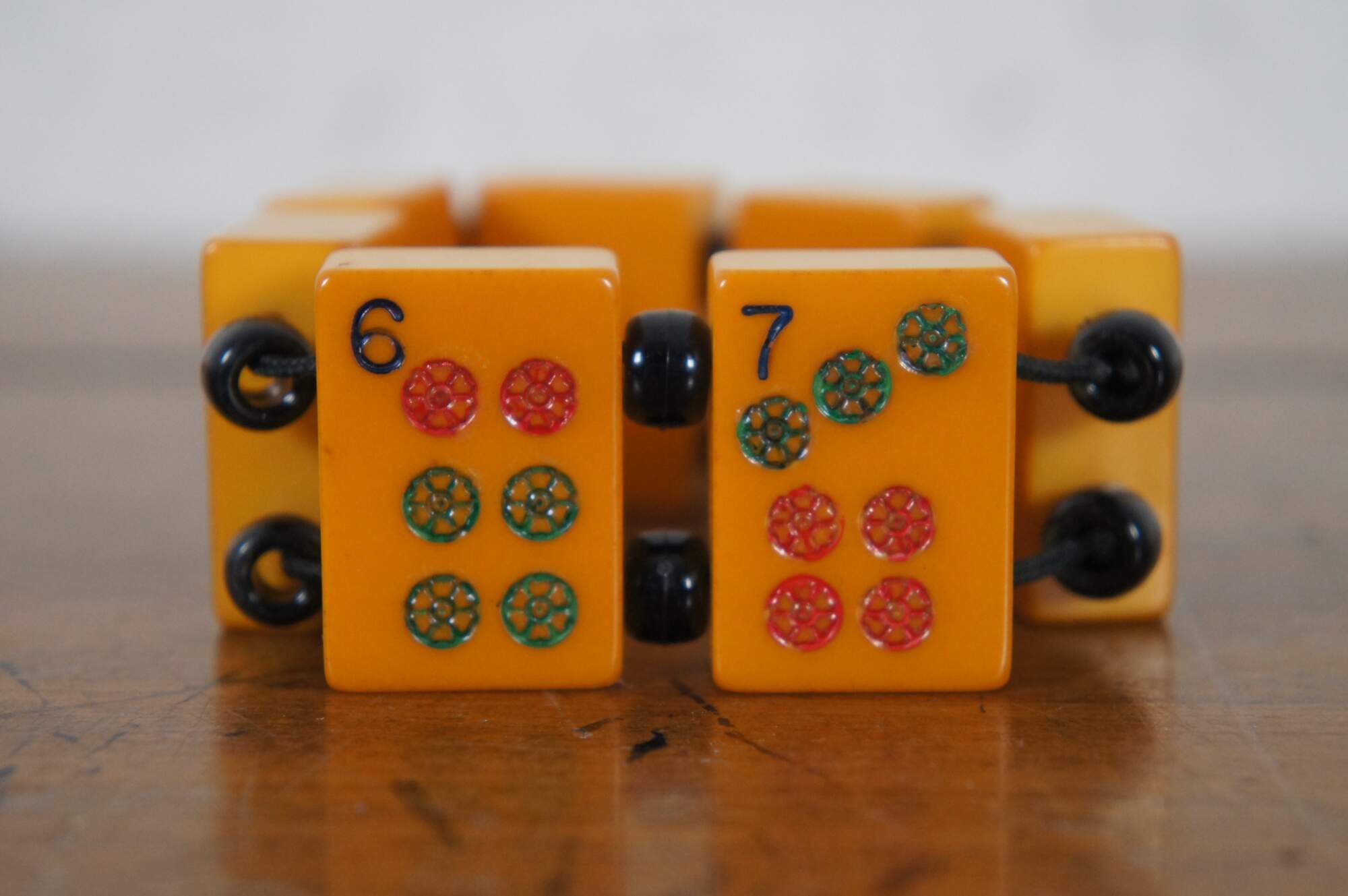 Pair of early to mid 20th century butterscotch Bakelite stretch bracelets featuring seven carved and painted mah jong tiles divided by black pony beads. Slightly different shades. The lighter one features Chinese characters and Arabic numerals. The darker one features flower shaped pips and Arabic numerals. Swab tested.