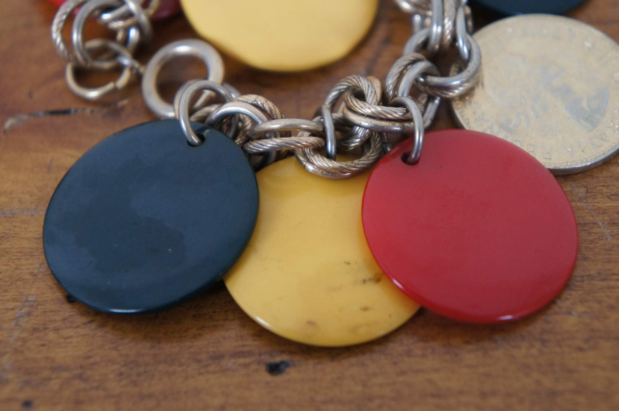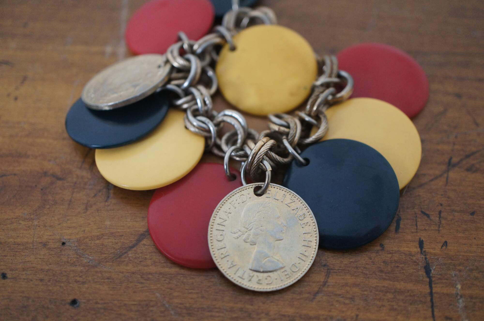 Mid 20th century bracelet featuring round /disc shaped Bakelite charms in red, yellow and navy blue, and two 1960 British half penny coins featuring Queen Elizabeth II, on a double layered curb chain with rope twist texture and spring ring clasp. Clasp marked Germany. Swab tested.