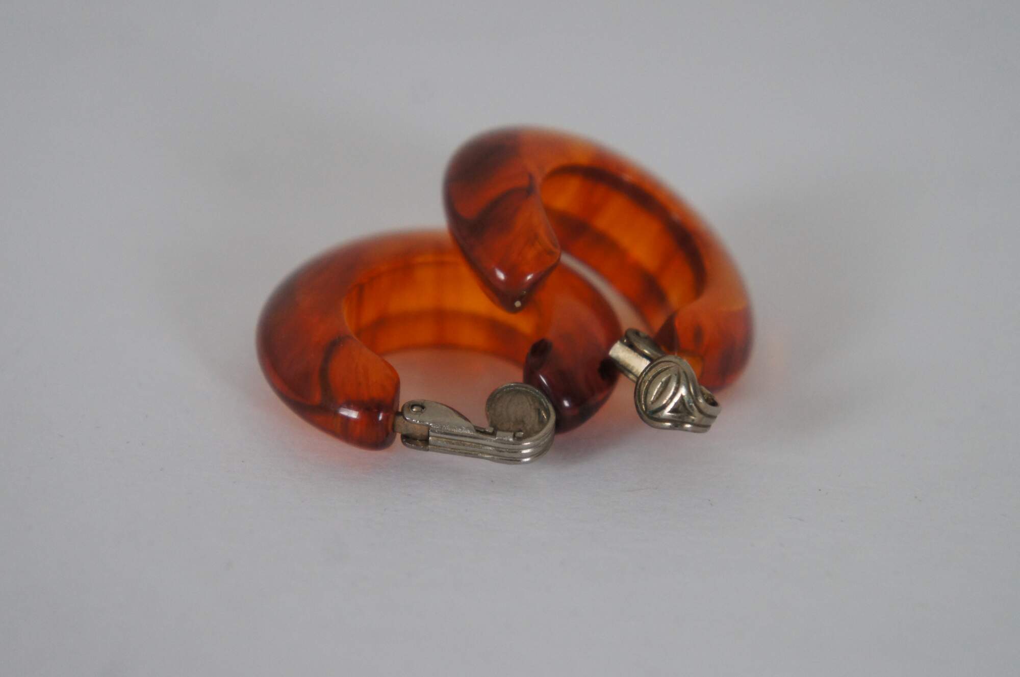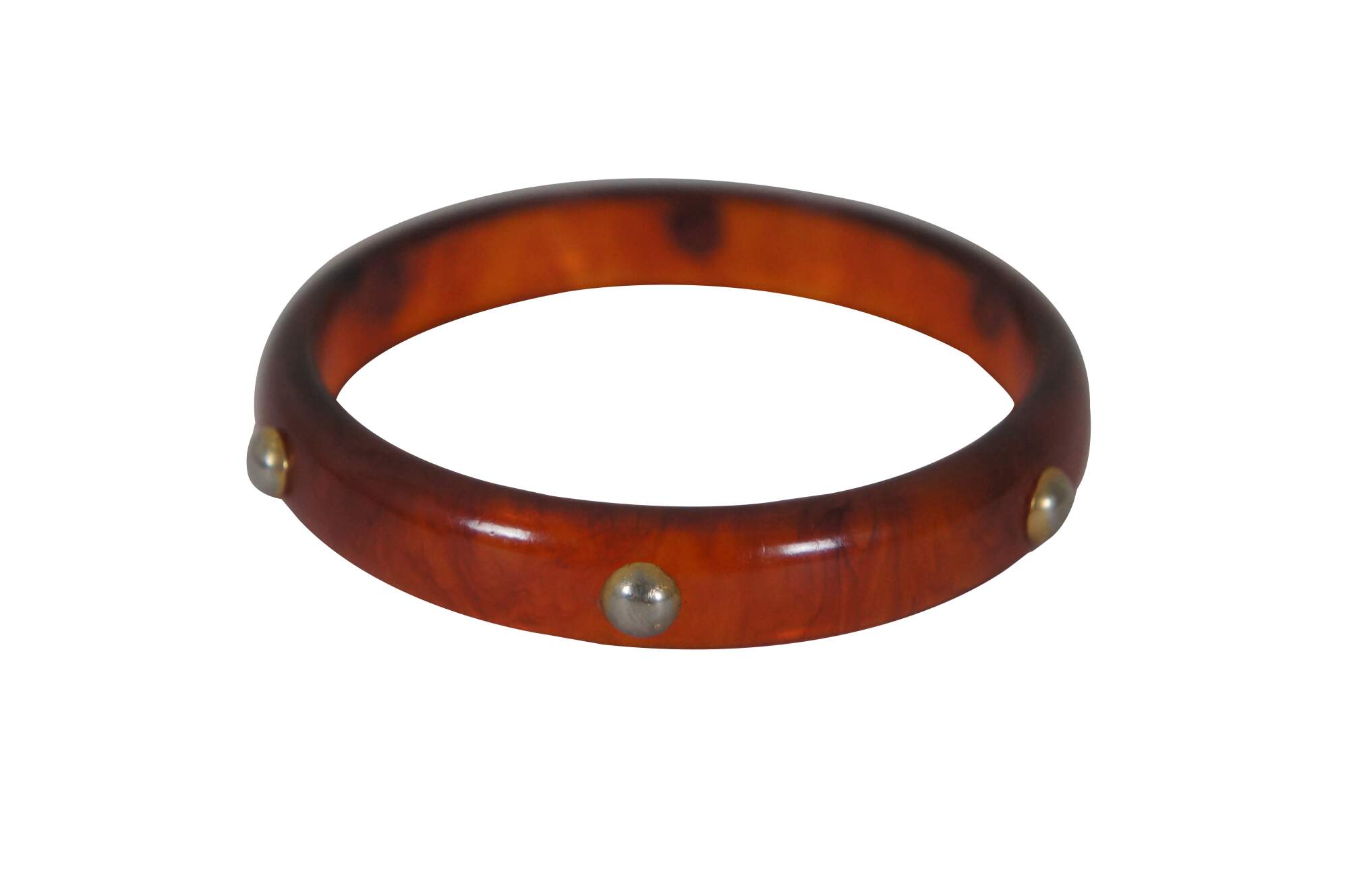 Four piece set of mid 20th century marbled root beer / translucent amber Bakelite jewelry including a pair of clip on hoop earrings, bangle bracelet with silver tone studs, and a large, heavy fish shaped pendant with white rhinestone eye (no chain). Swab tested by previous owner.