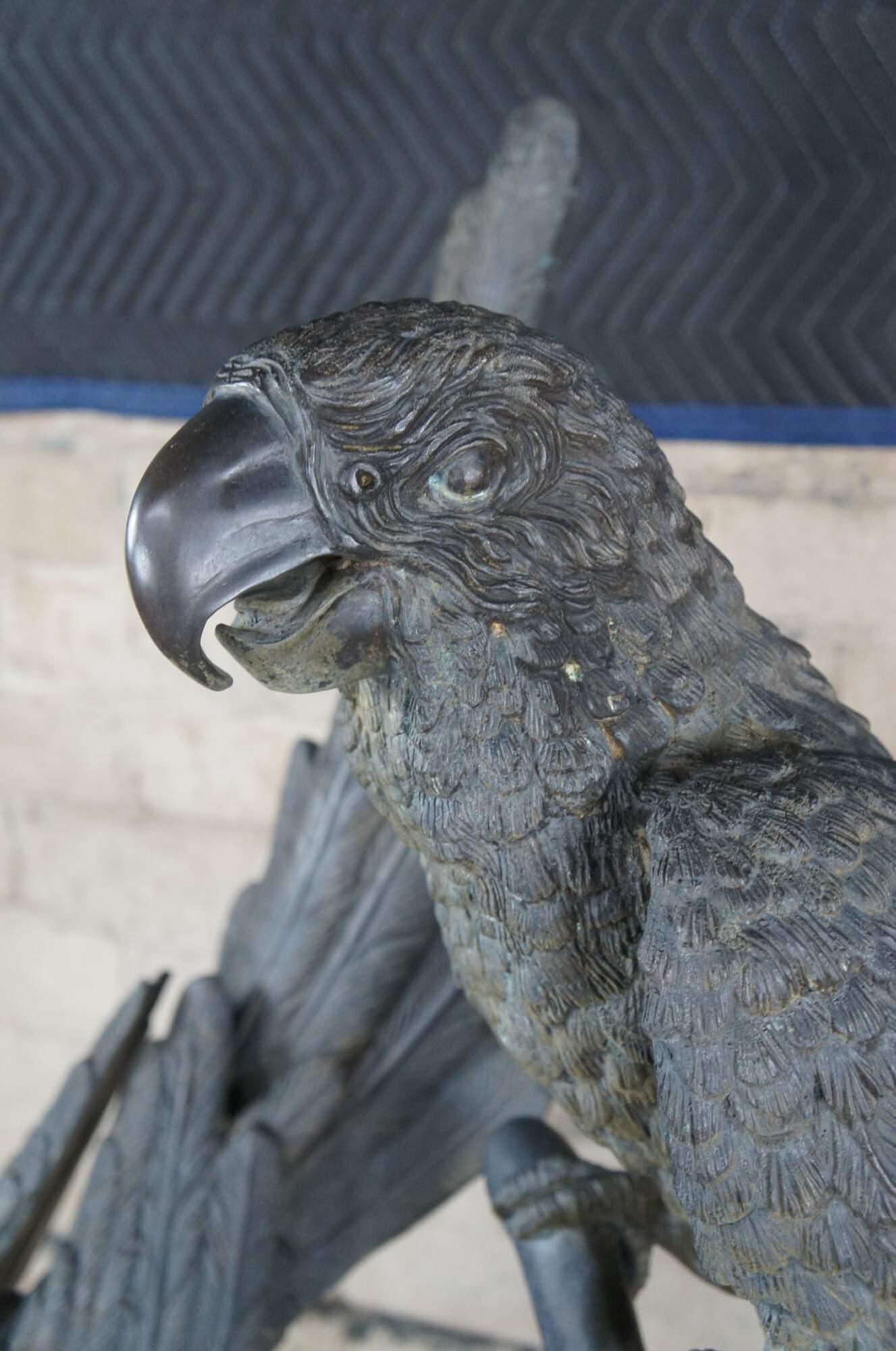 Exquisite Antique Pair of French Art Deco bronze oversized Macaw Parrots or birds perched on stands with nice patina, circa 1920s. These monumental art sculptures feature a realistic tree trunk that supports each parrot rendered in explicit details. The parrots are shown with impressive life like design to the feathers, beaks and eyes, each with a unique expression and pose.