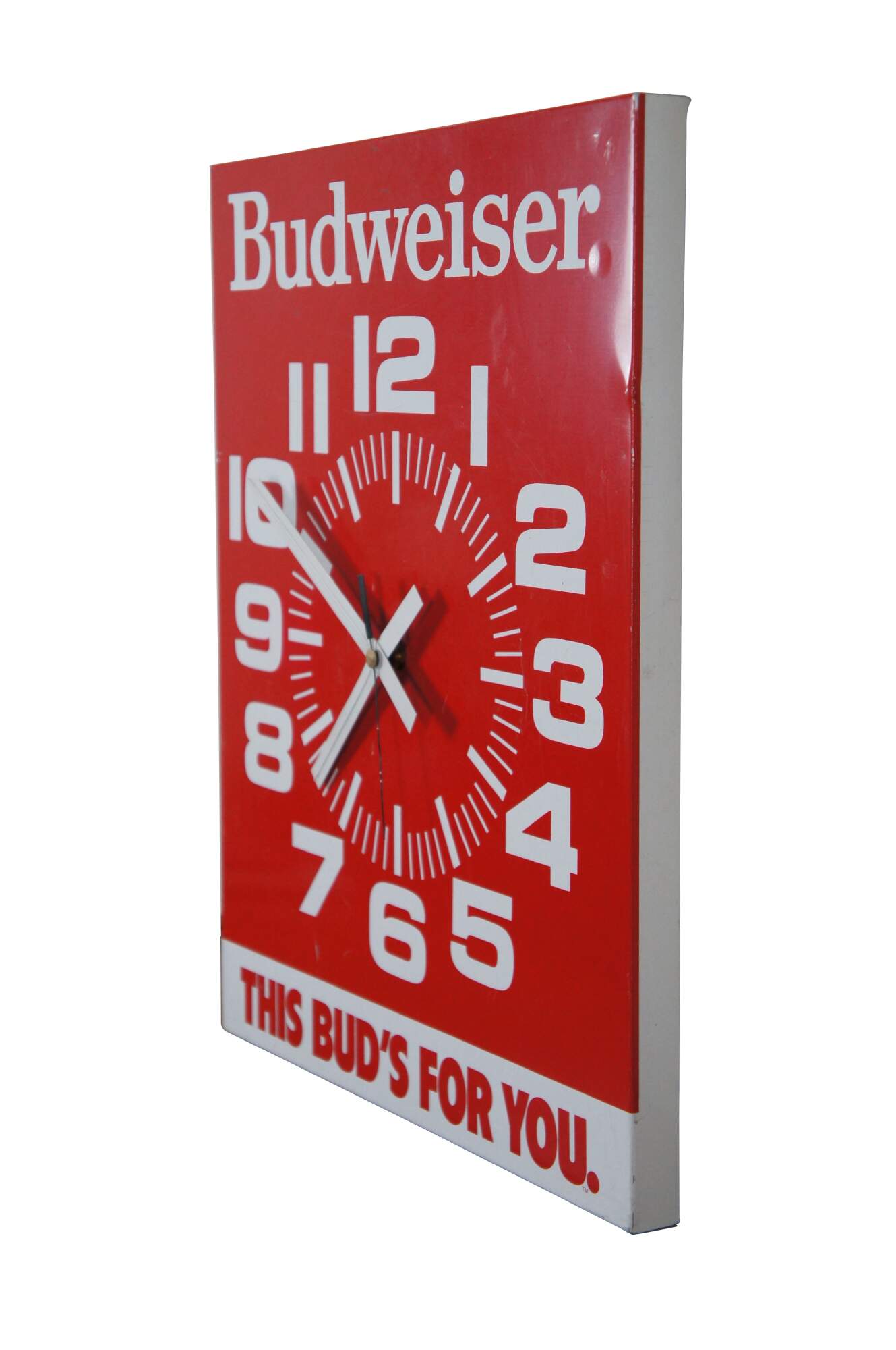 Vintage Budweiser metal / tin bar sign / clock. Rectangular form with “Budweiser” at the top and a sans serif clock face in white on a red background. White band along the bottom reading “This Bud’s For You” in red. Battery operated. Manufactured by Signet Graphic Products Inc, July 1986. Budweiser Beer is produced by Anheuser-Busch Inc.