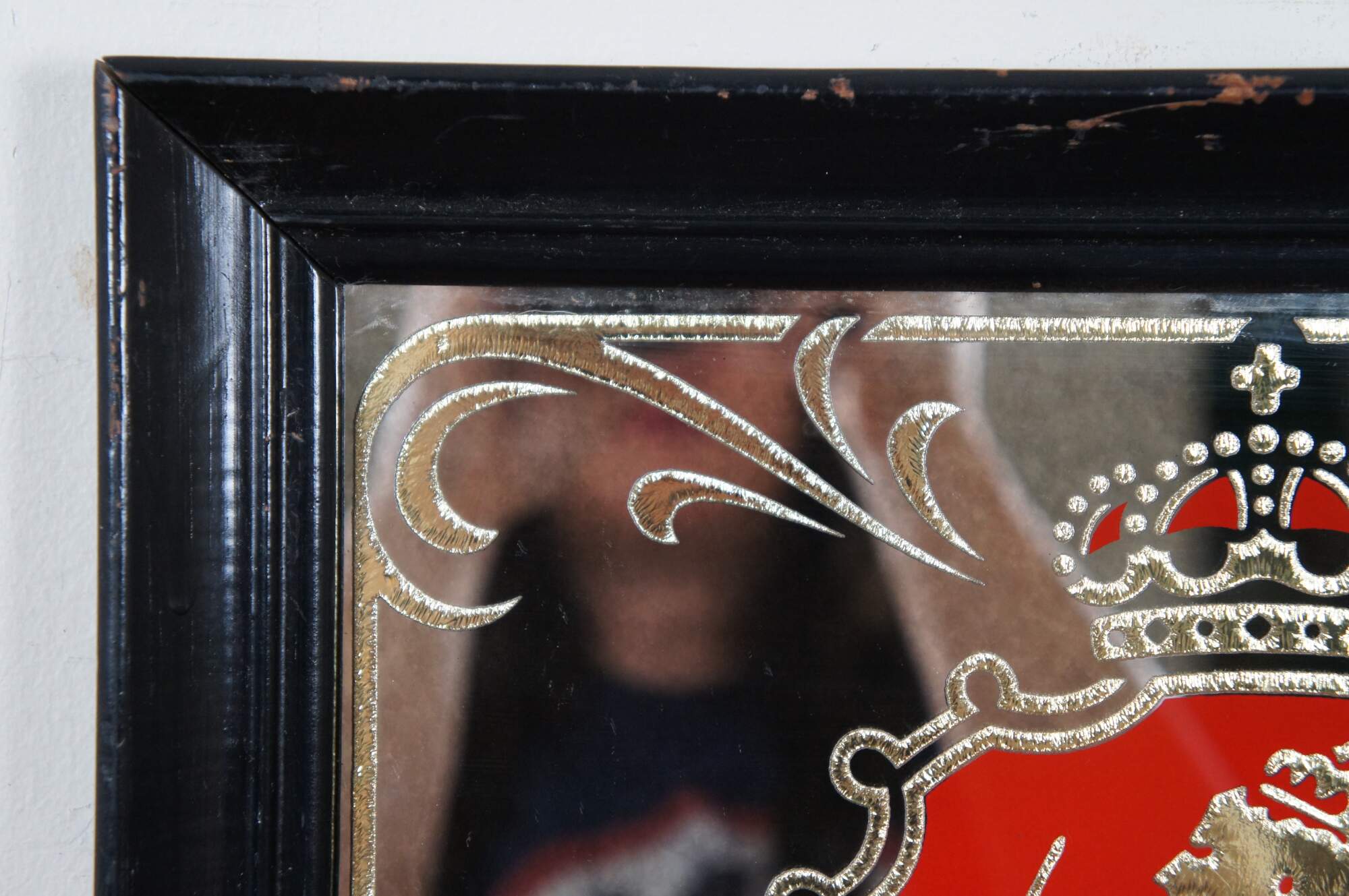 Vintage Stroh’s bar mirror / advertising sign stenciled with a golden border around the Stroh’s crowned lion coat of arms / crest and brand name in red with the words “For Real Beer Lovers” below. Framed in a black painted beveled wood frame. Stroh’s Beer produced by The Stroh Brewery Co. Item number 8182-18A.