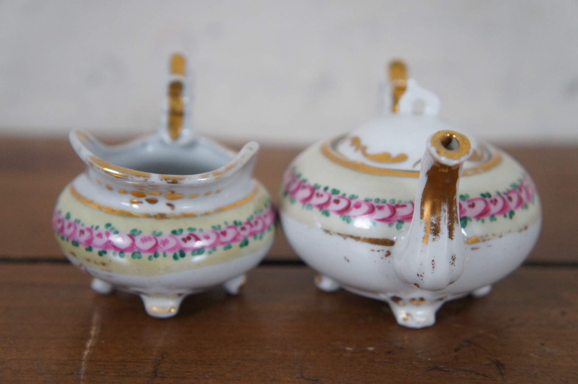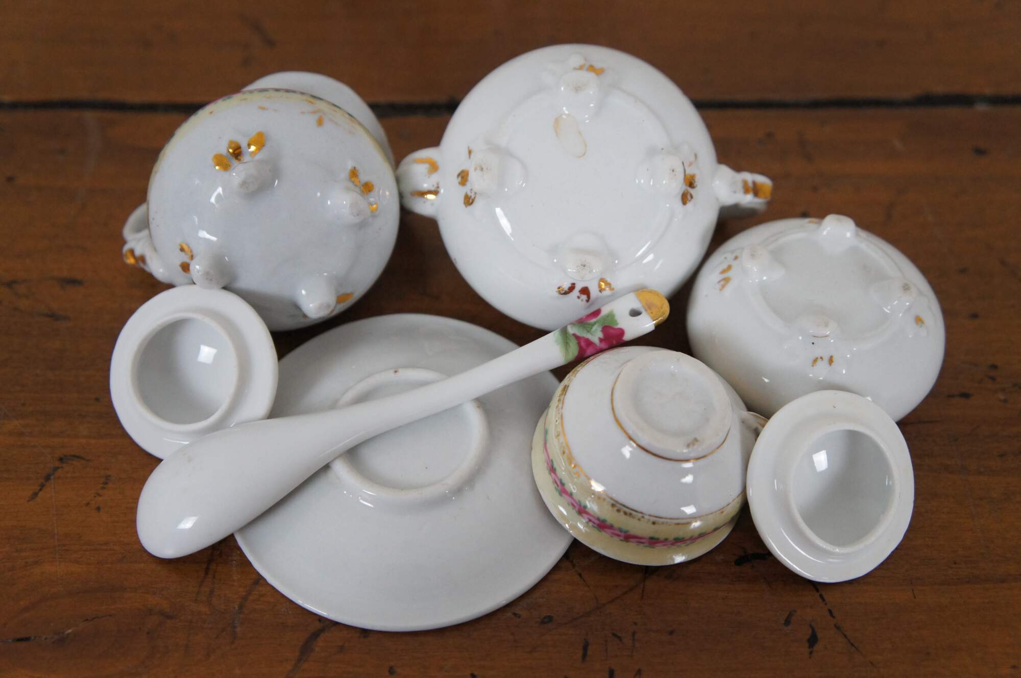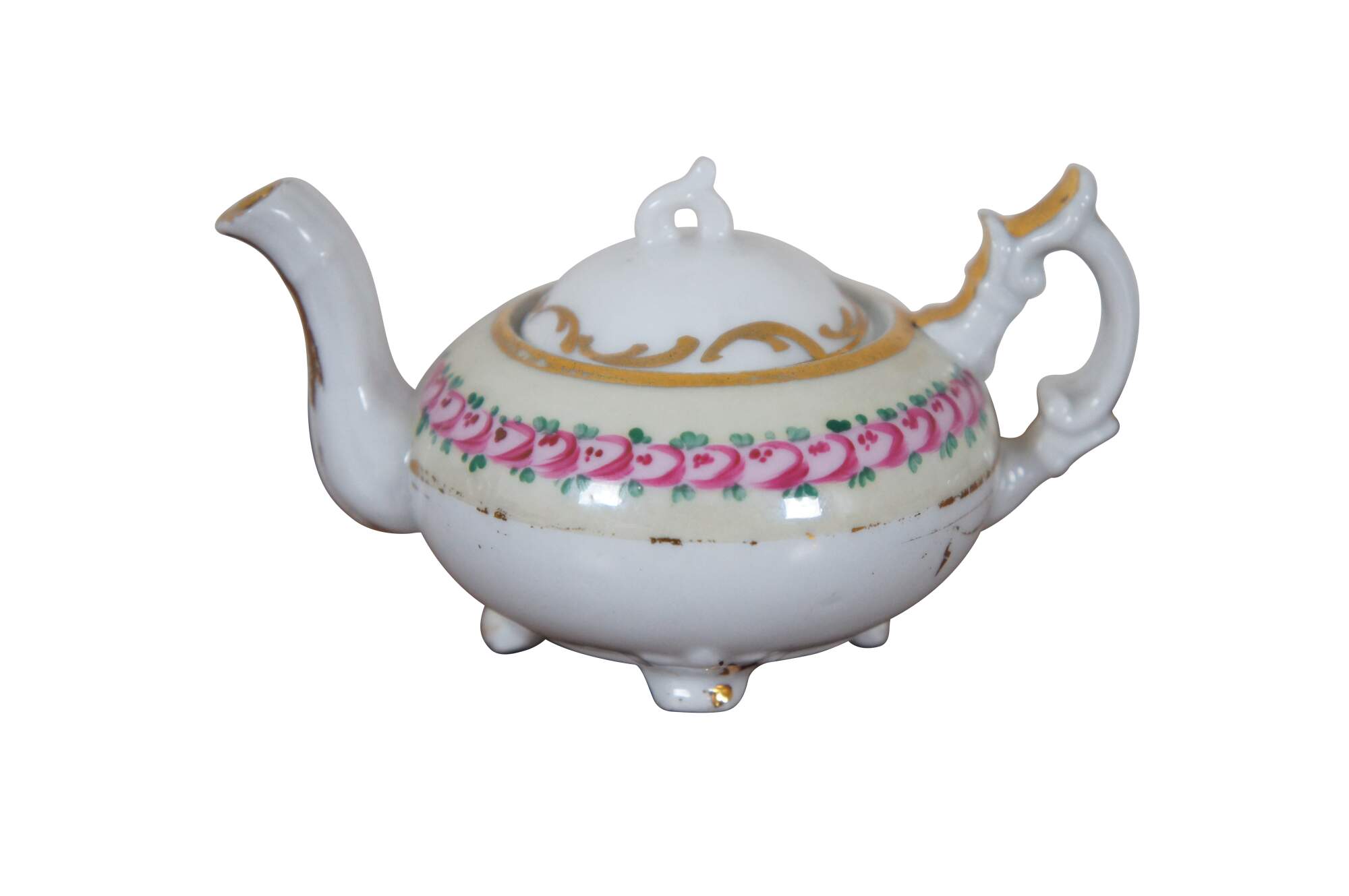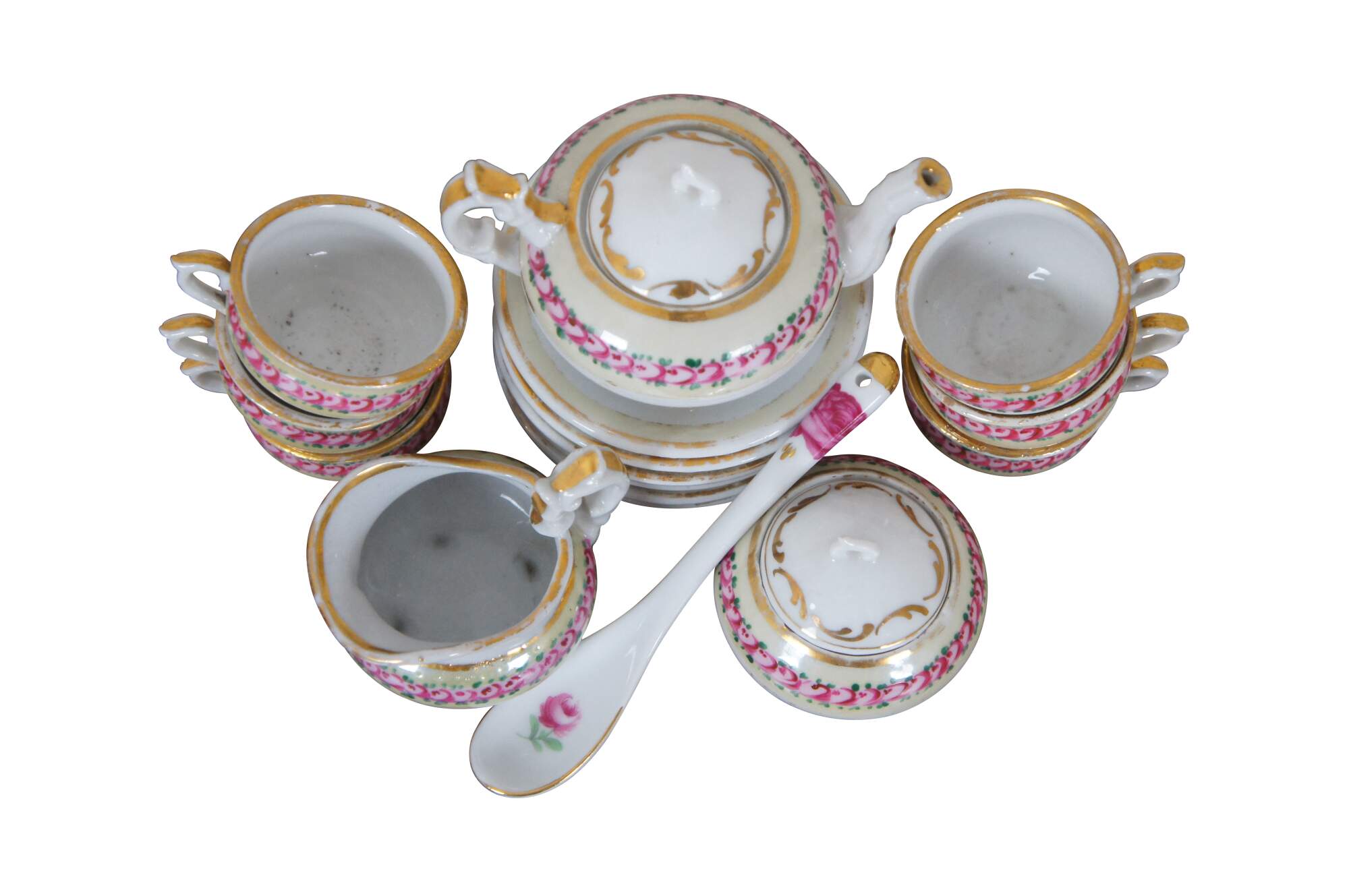 Antique 18 piece child’s miniature / doll sized porcelain tea set, hand painted with pink roses on a cream border with gilded accents. Set includes 6 teacups, 6 saucers, teapot with lid, sugar bowl with lid, creamer, and one coffee spoon. No makers mark.