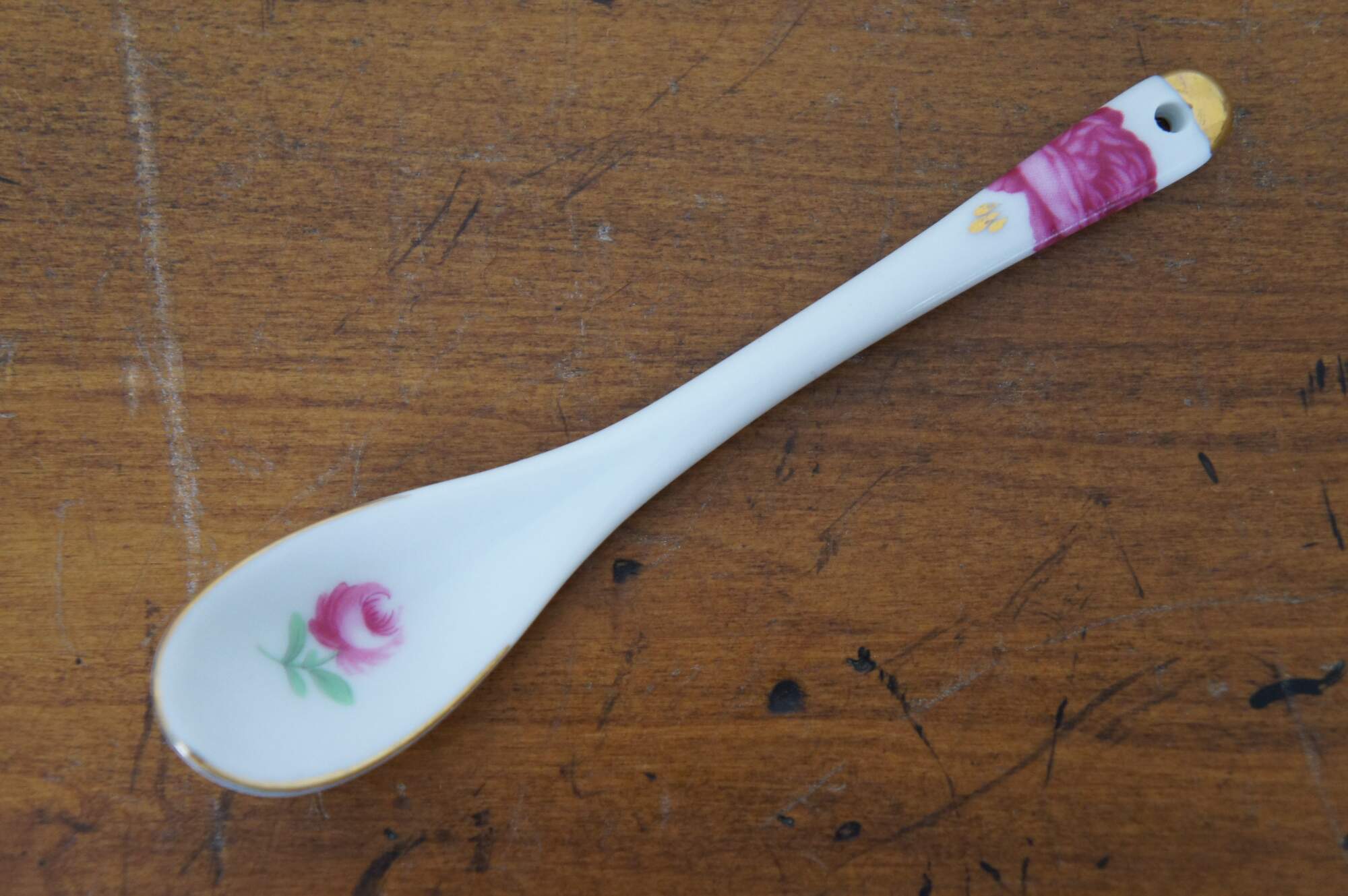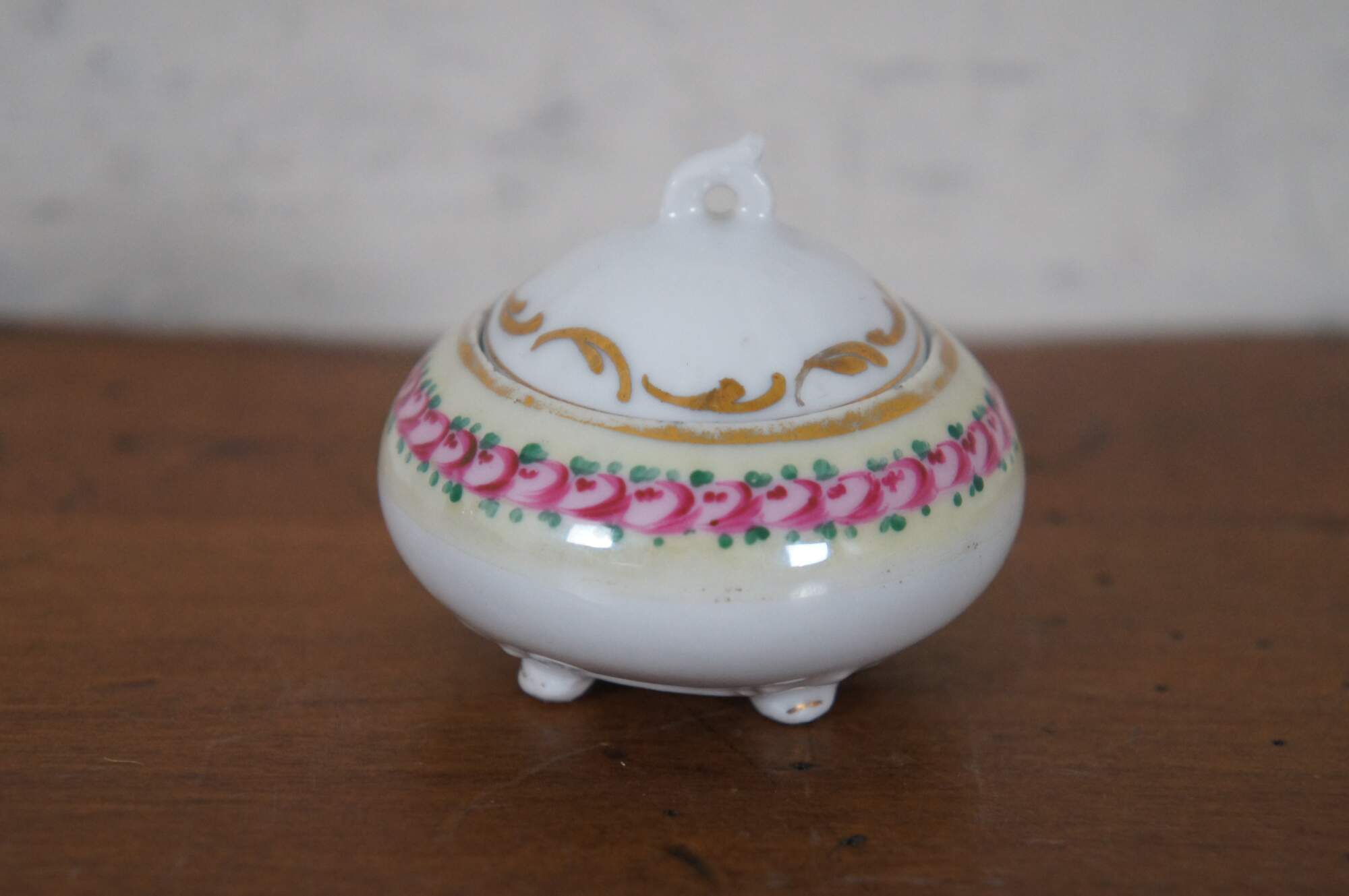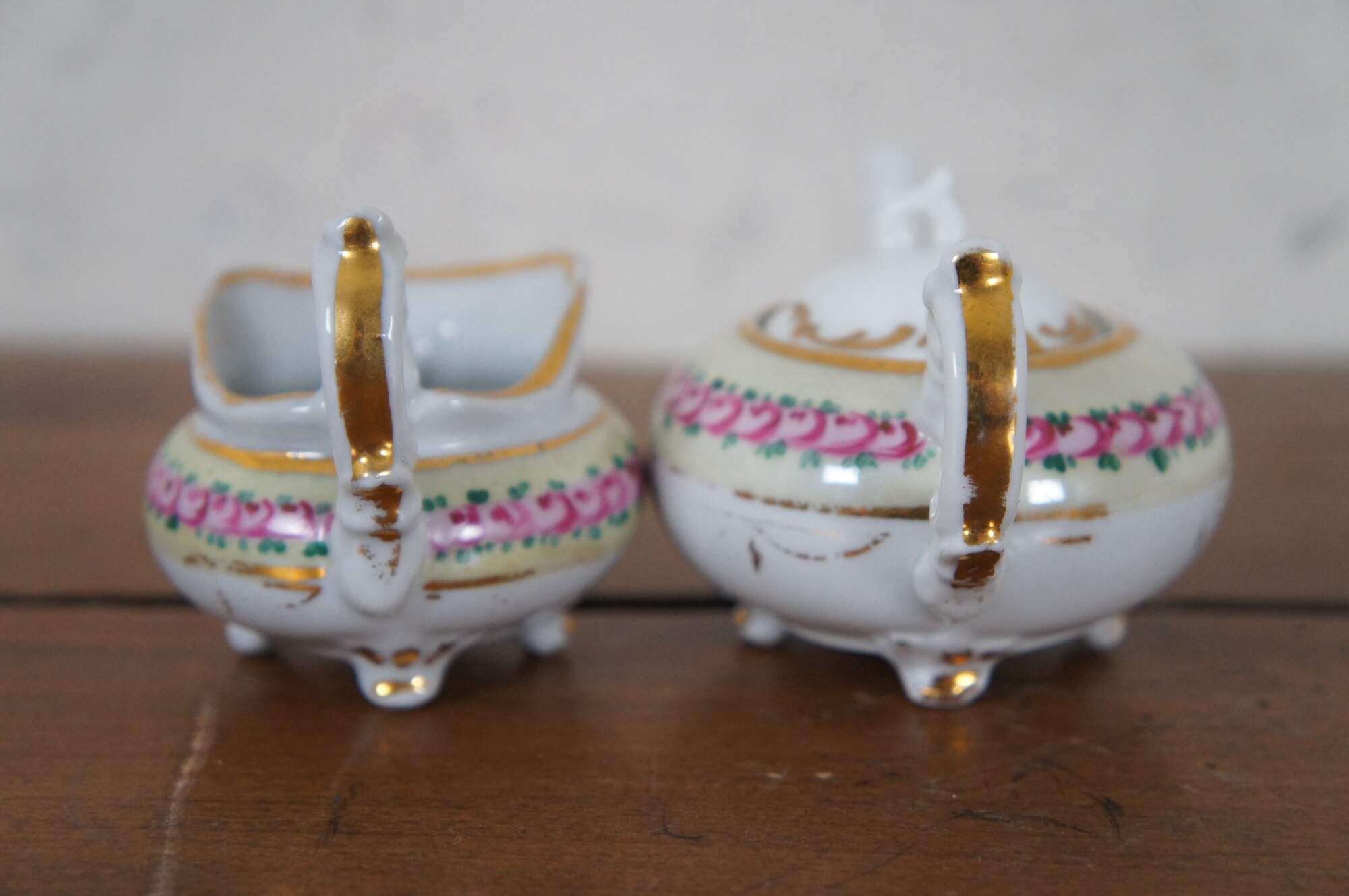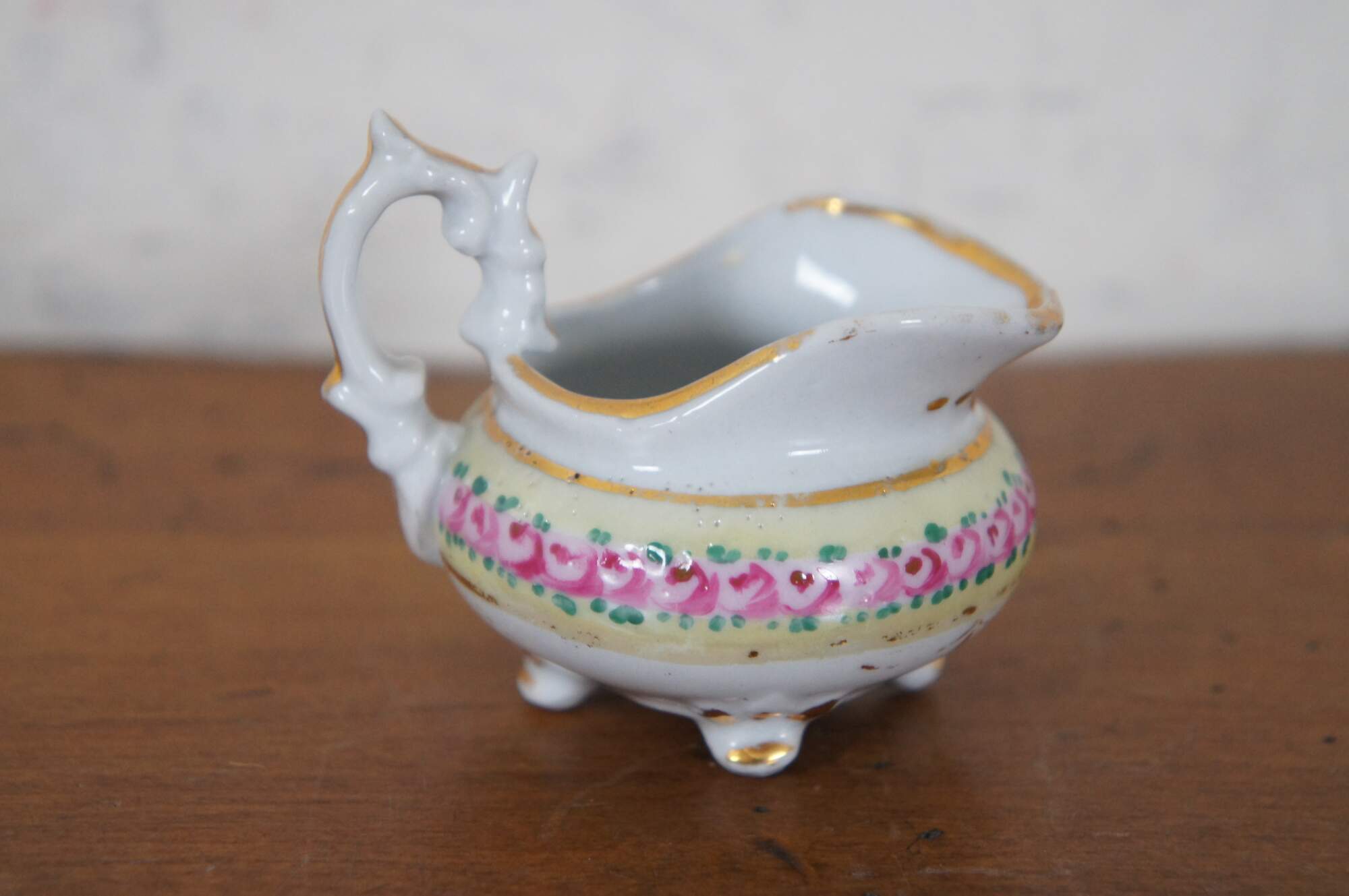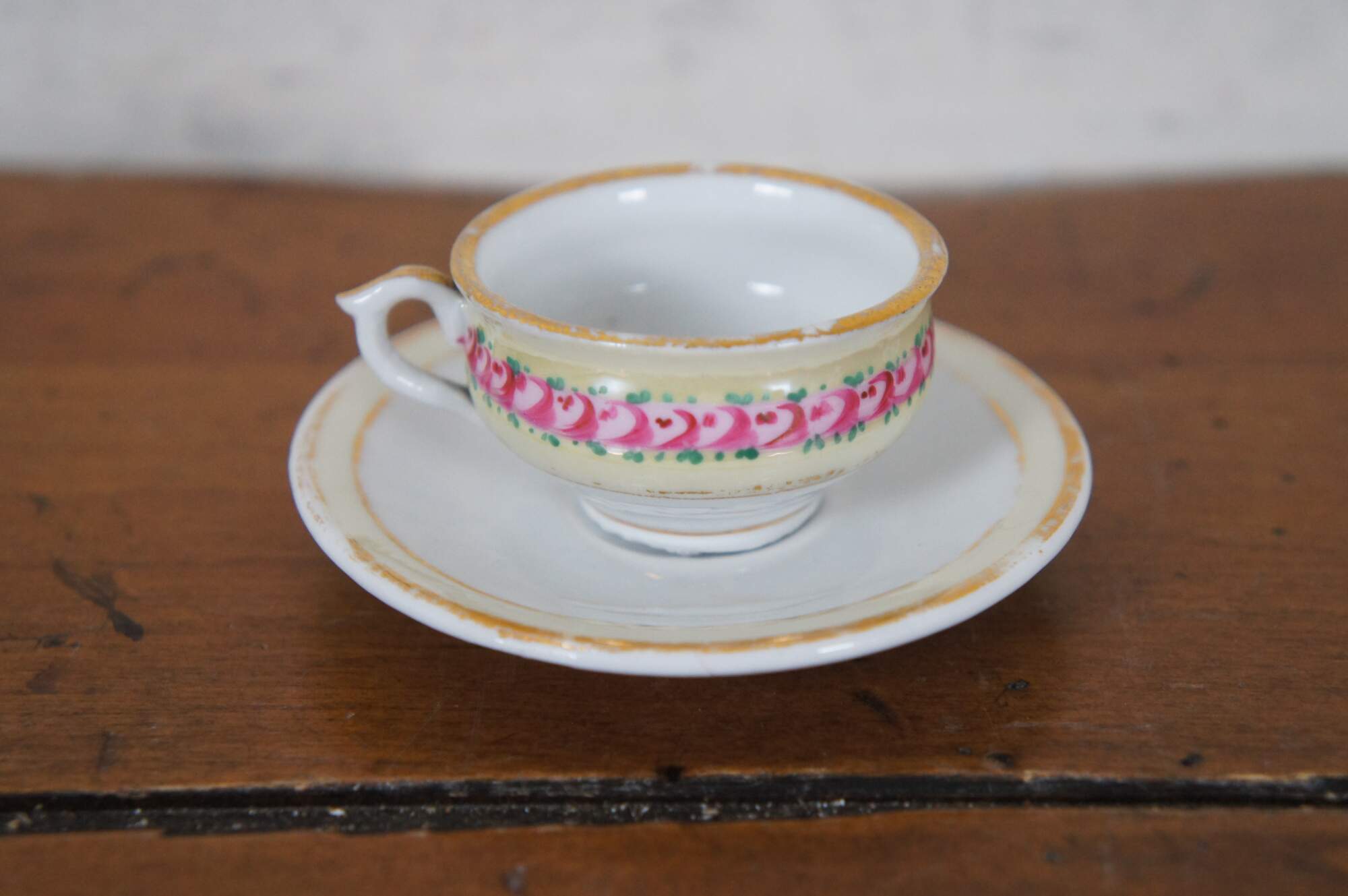 Antique 18 piece child’s miniature / doll sized porcelain tea set, hand painted with pink roses on a cream border with gilded accents. Set includes 6 teacups, 6 saucers, teapot with lid, sugar bowl with lid, creamer, and one coffee spoon. No makers mark.