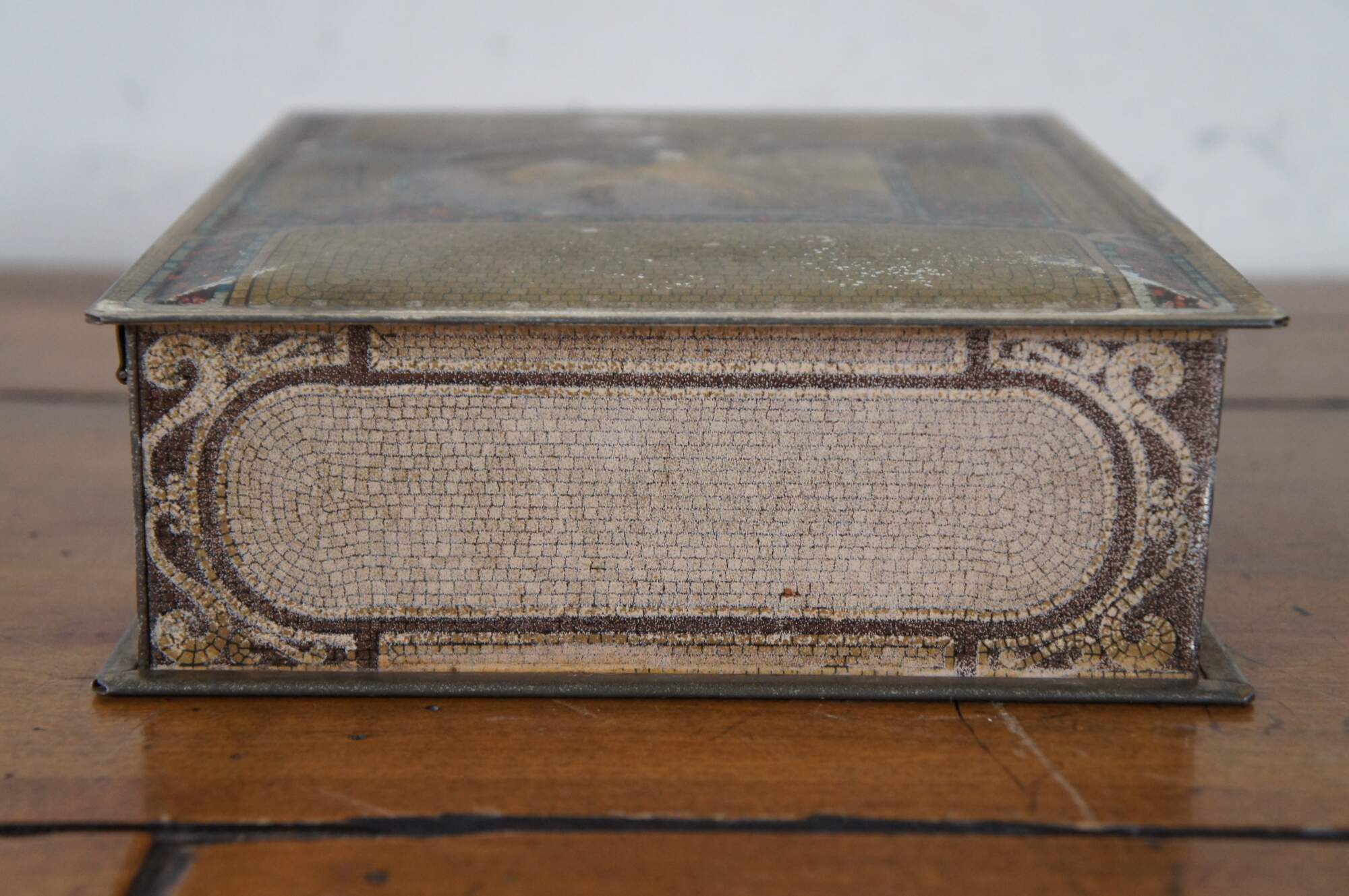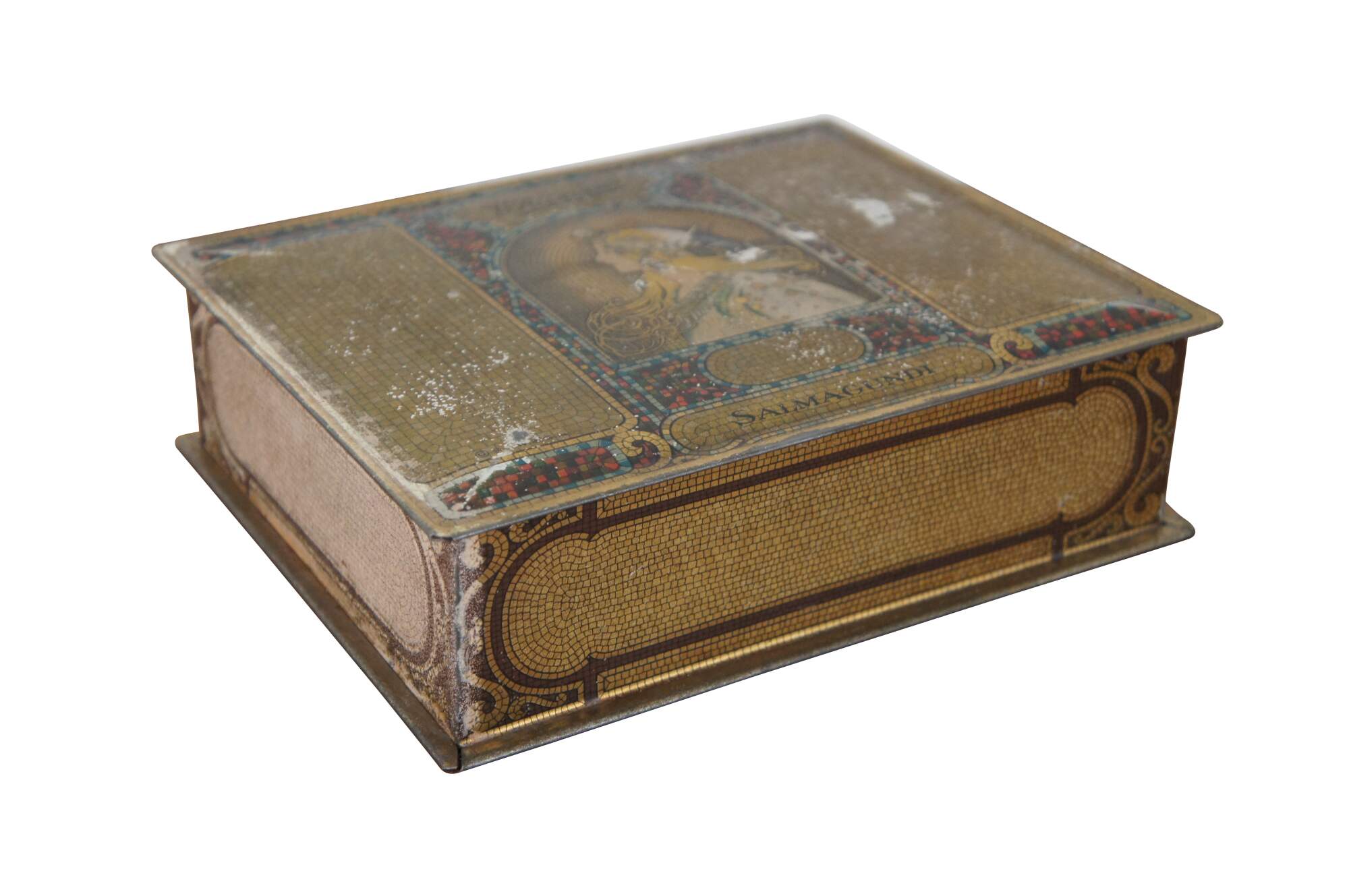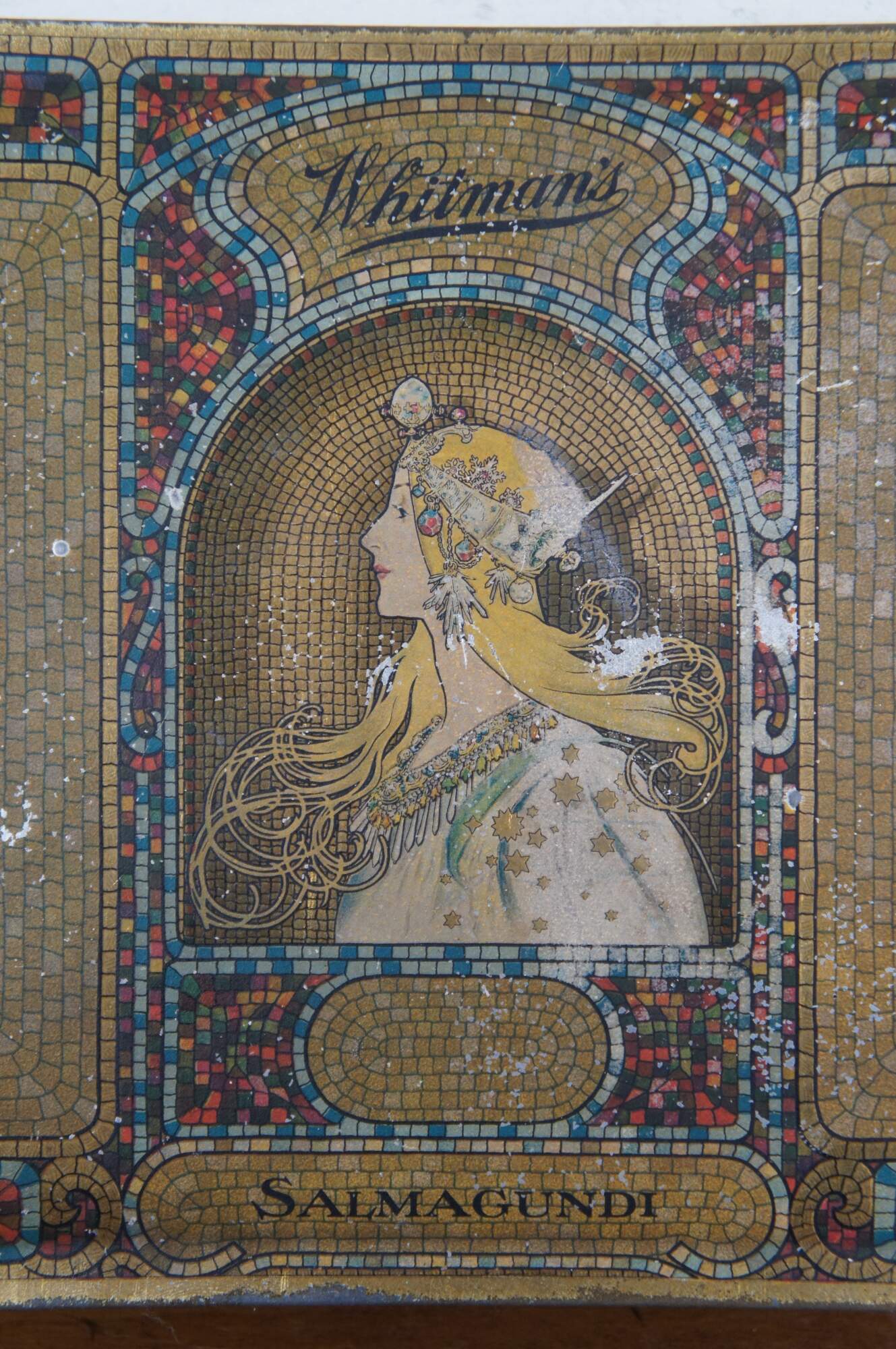 1920’s Whitman’s Salmagundi 2 lb candy / chocolate advertising tin featuring a litho printed gilded mosaic design and art nouveau portrait of a blonde woman by Alphonse Mucha. Copyright S.F.W. & S. Inc.