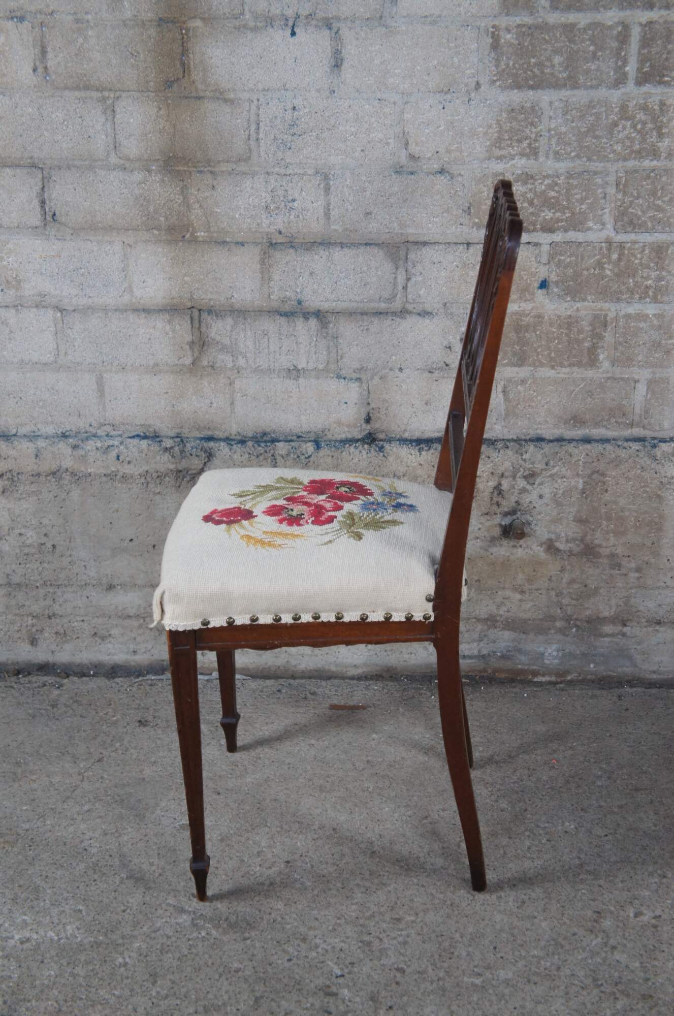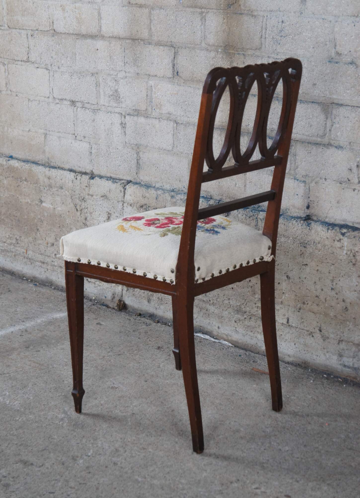 Antique Hepplewhite Hoop Back accent chair. Made of mahogany featuring pierced reticulated design with floral rose needlepoint seat with nailhead trim over tapered front legs.
