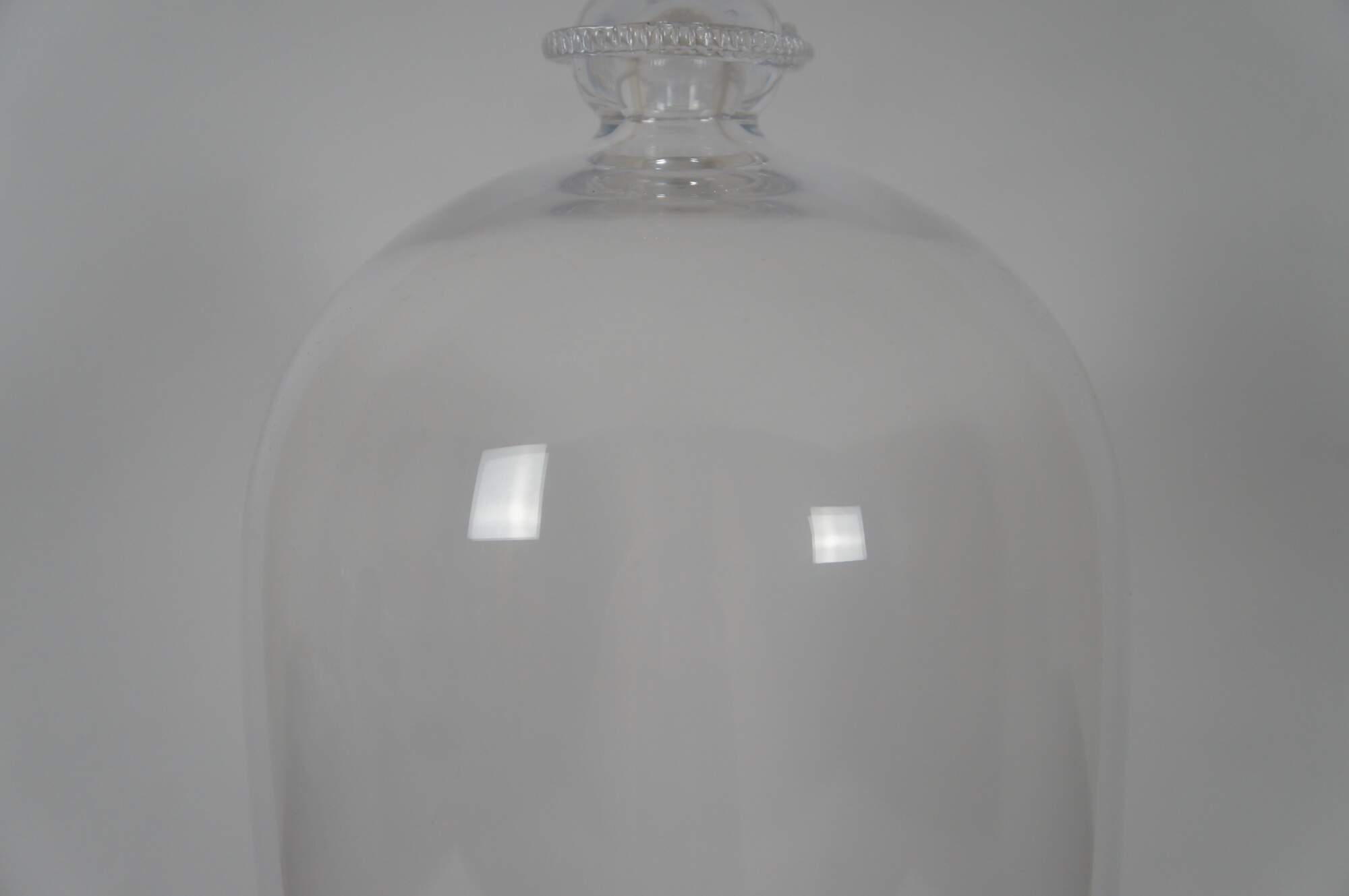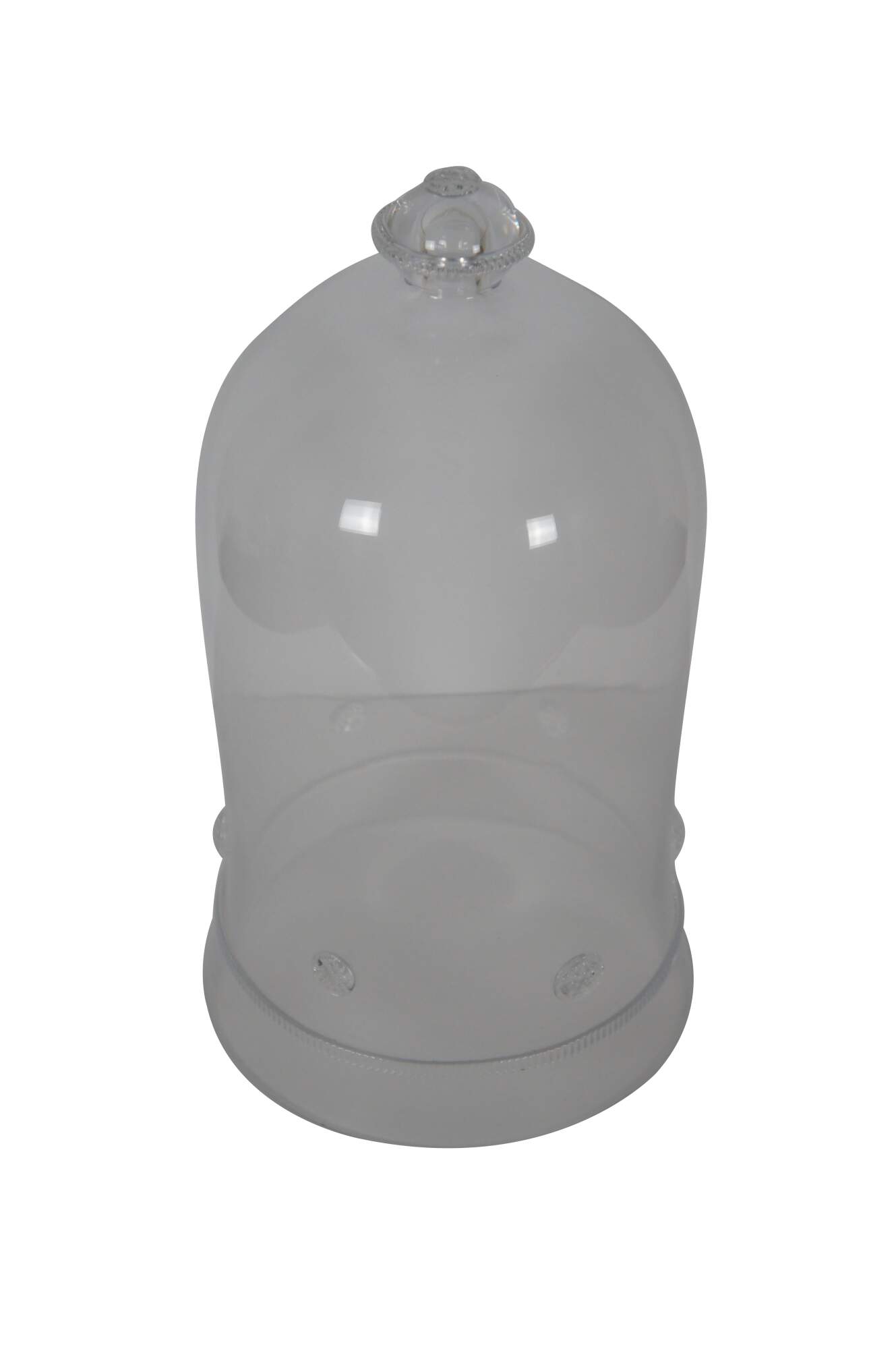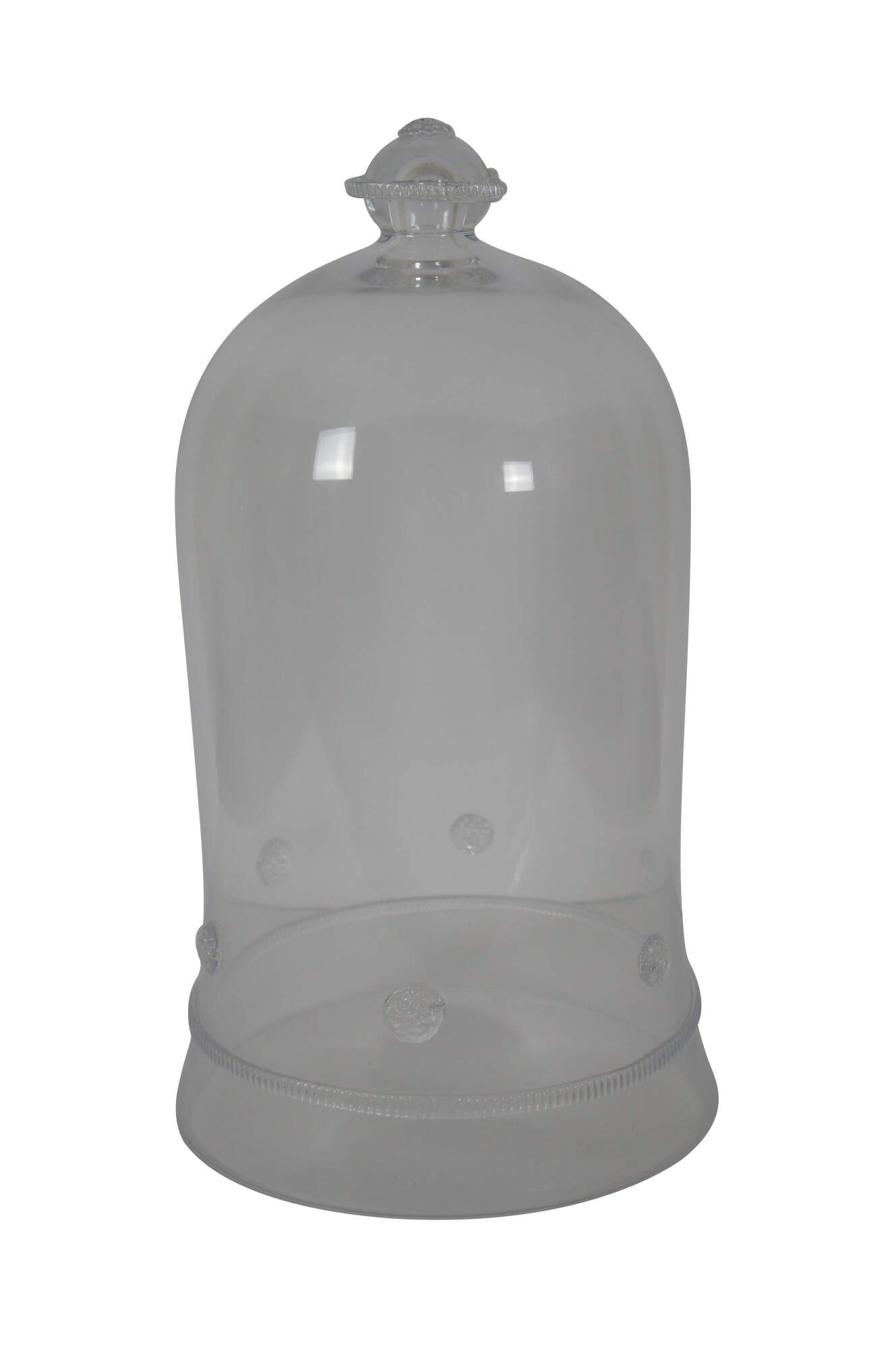 Juliska clear art glass tall dome comver / cloche / bell jar in the Isabella pattern, featuring a ridged band around the base and studded with six beaded medallions. Brand hand etched at base.