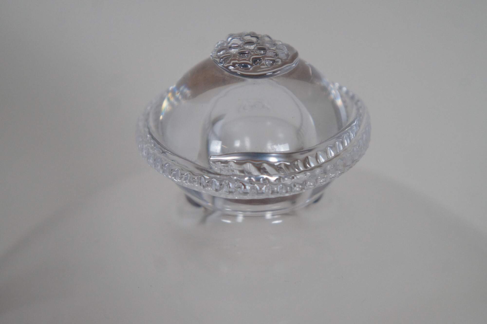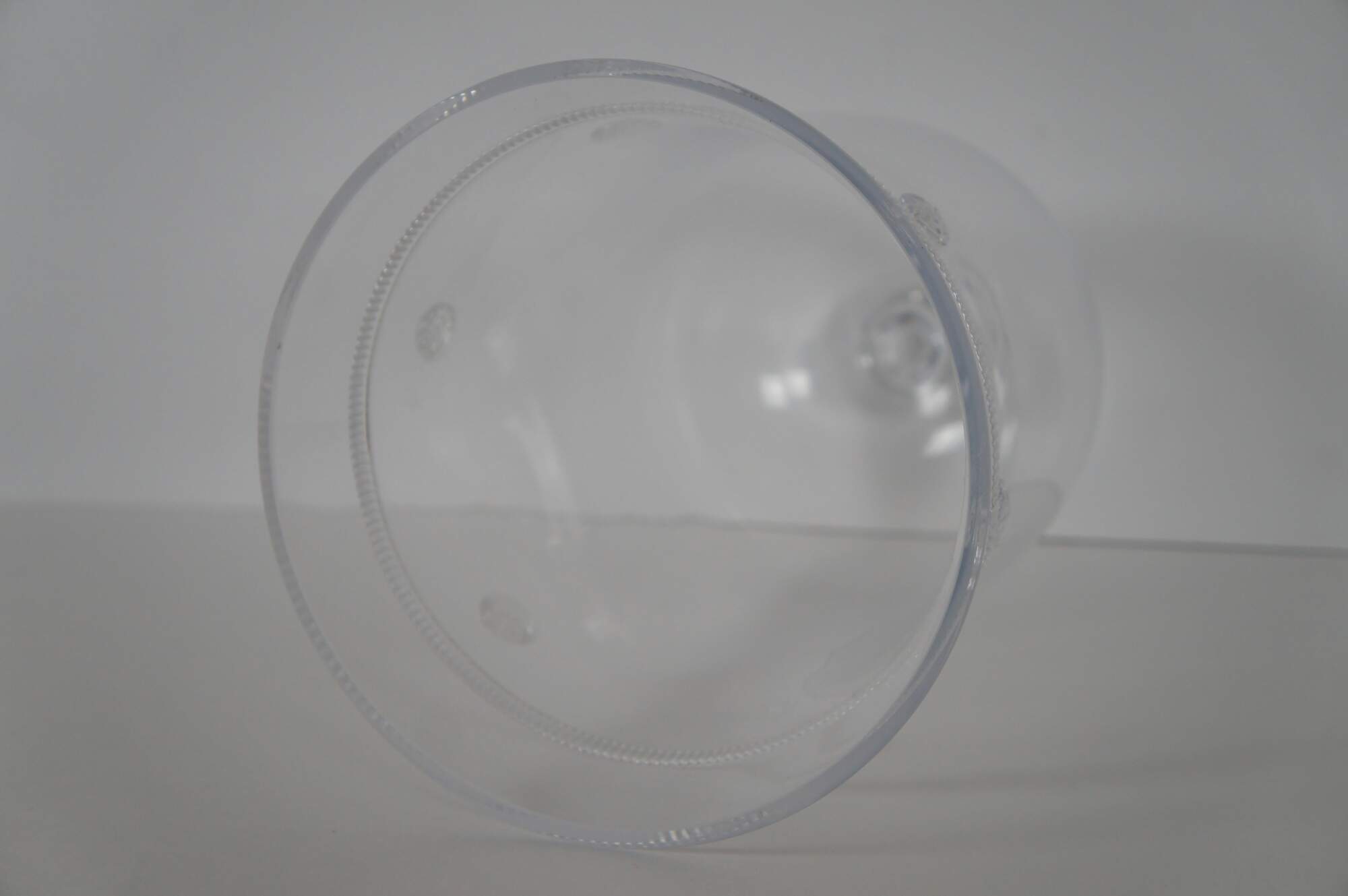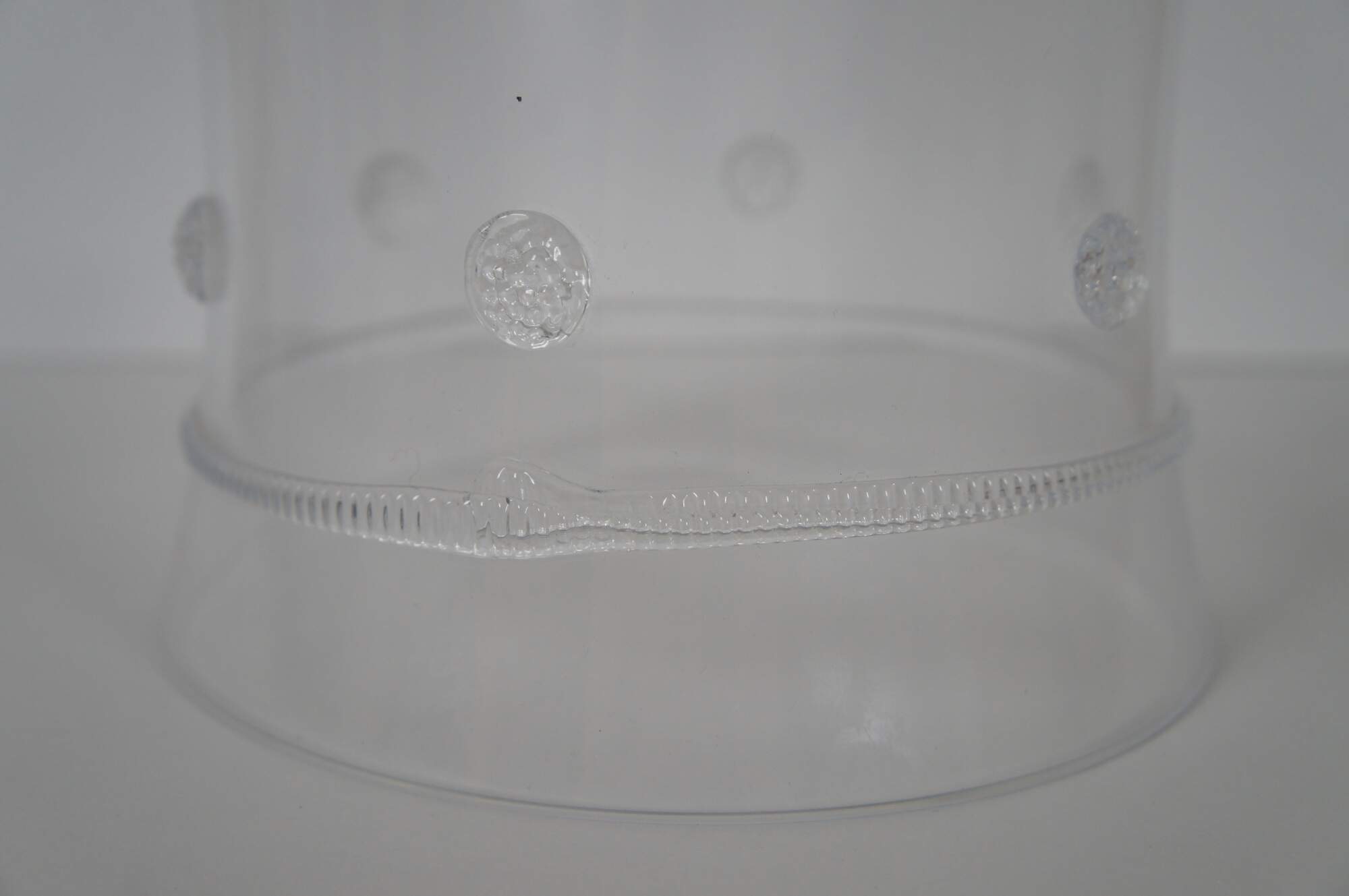 Juliska clear art glass tall dome comver / cloche / bell jar in the Isabella pattern, featuring a ridged band around the base and studded with six beaded medallions. Brand hand etched at base.
