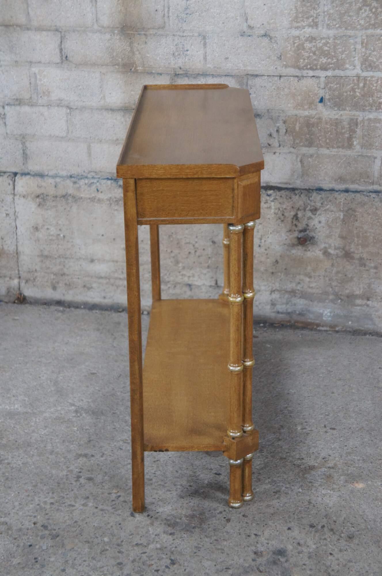 Vintage Campaign style tiered console or entry table featuring a slender profile with upper gallery over two drawers with Neoclassical brass hardware, supported by faux bamboo legs.