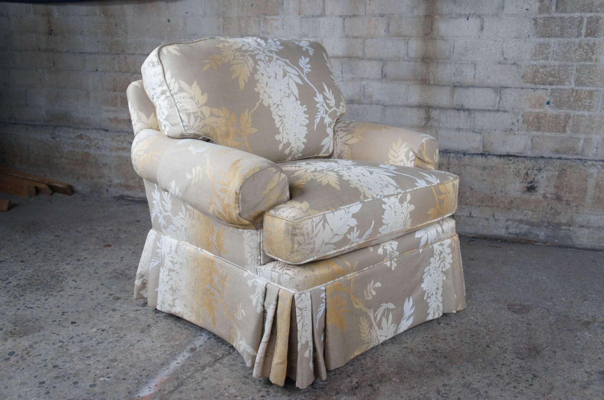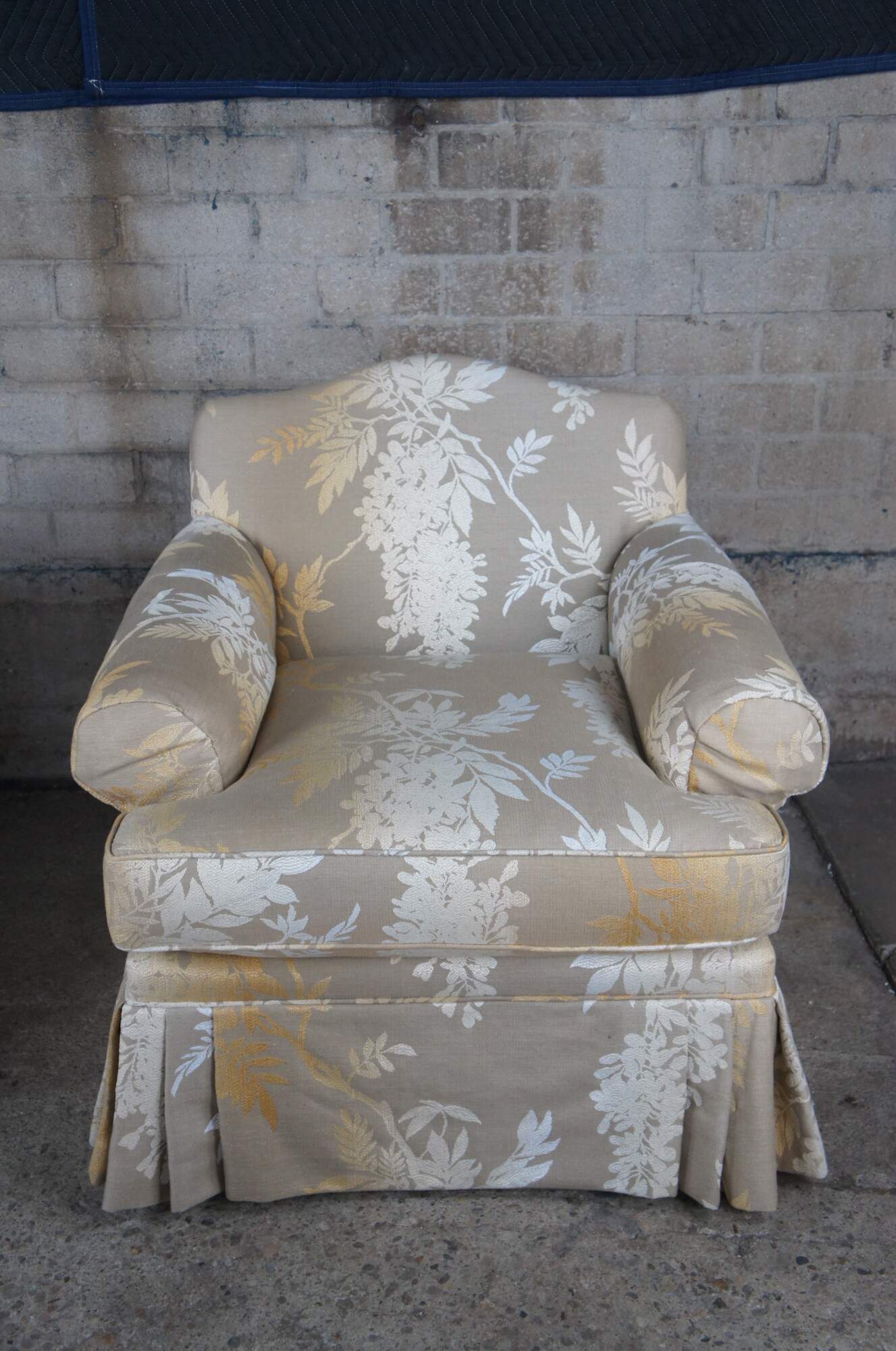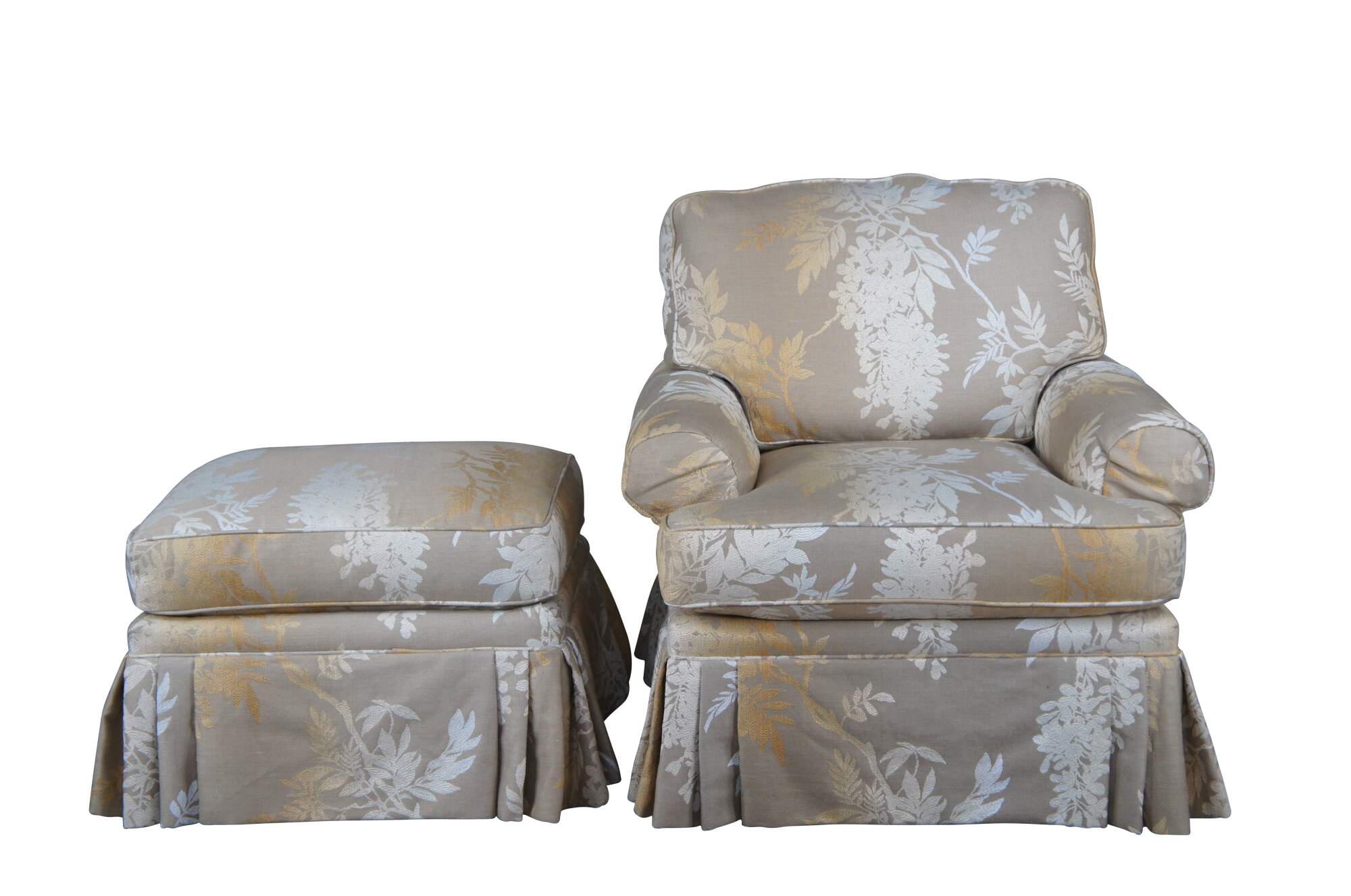 Vintage Lynch Chair & Ottoman by Taylor King, #5316-01, 5316-00. featuring rolled arms with beige / gold / whitish silver floral skirted upholstery.