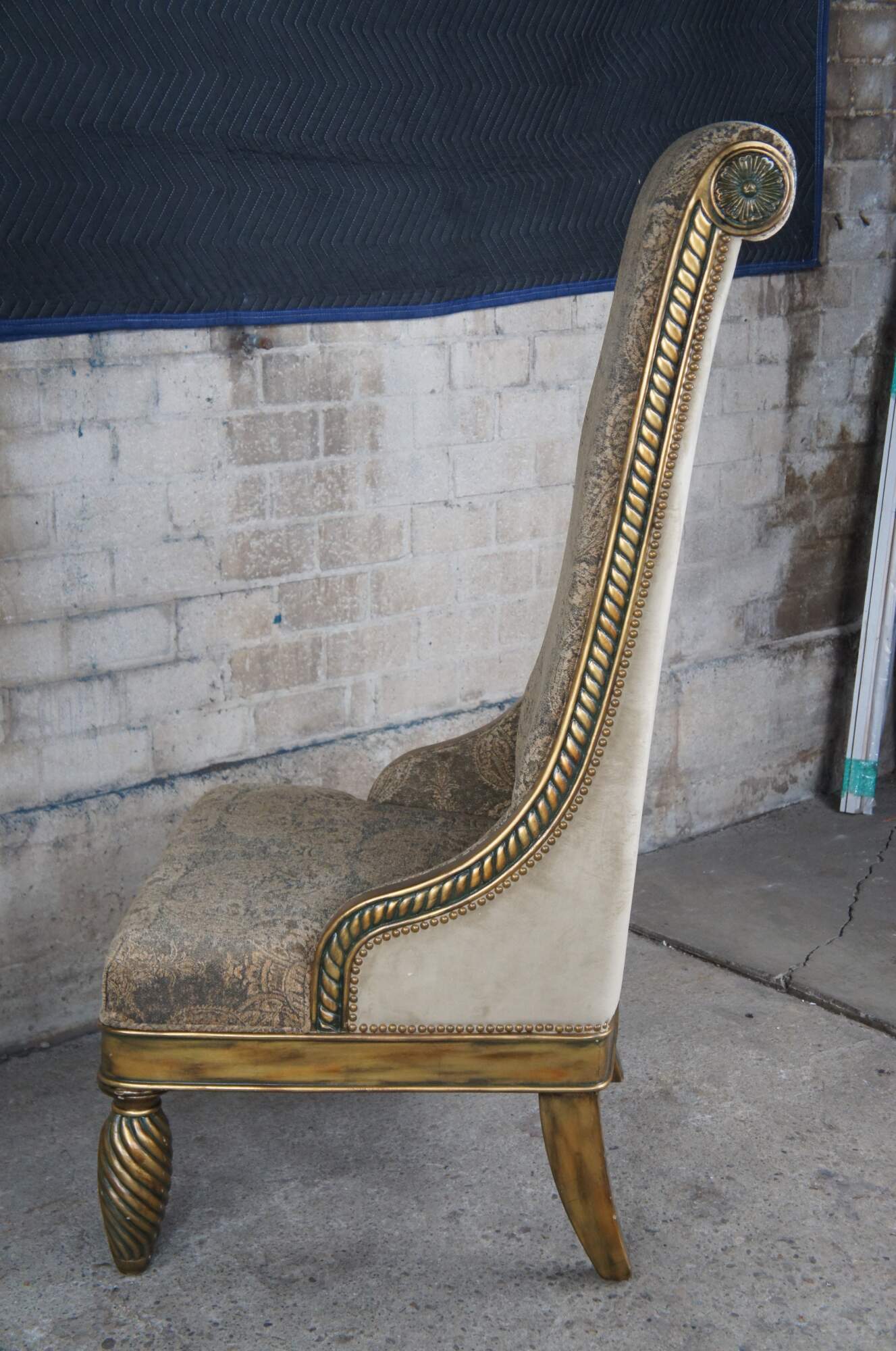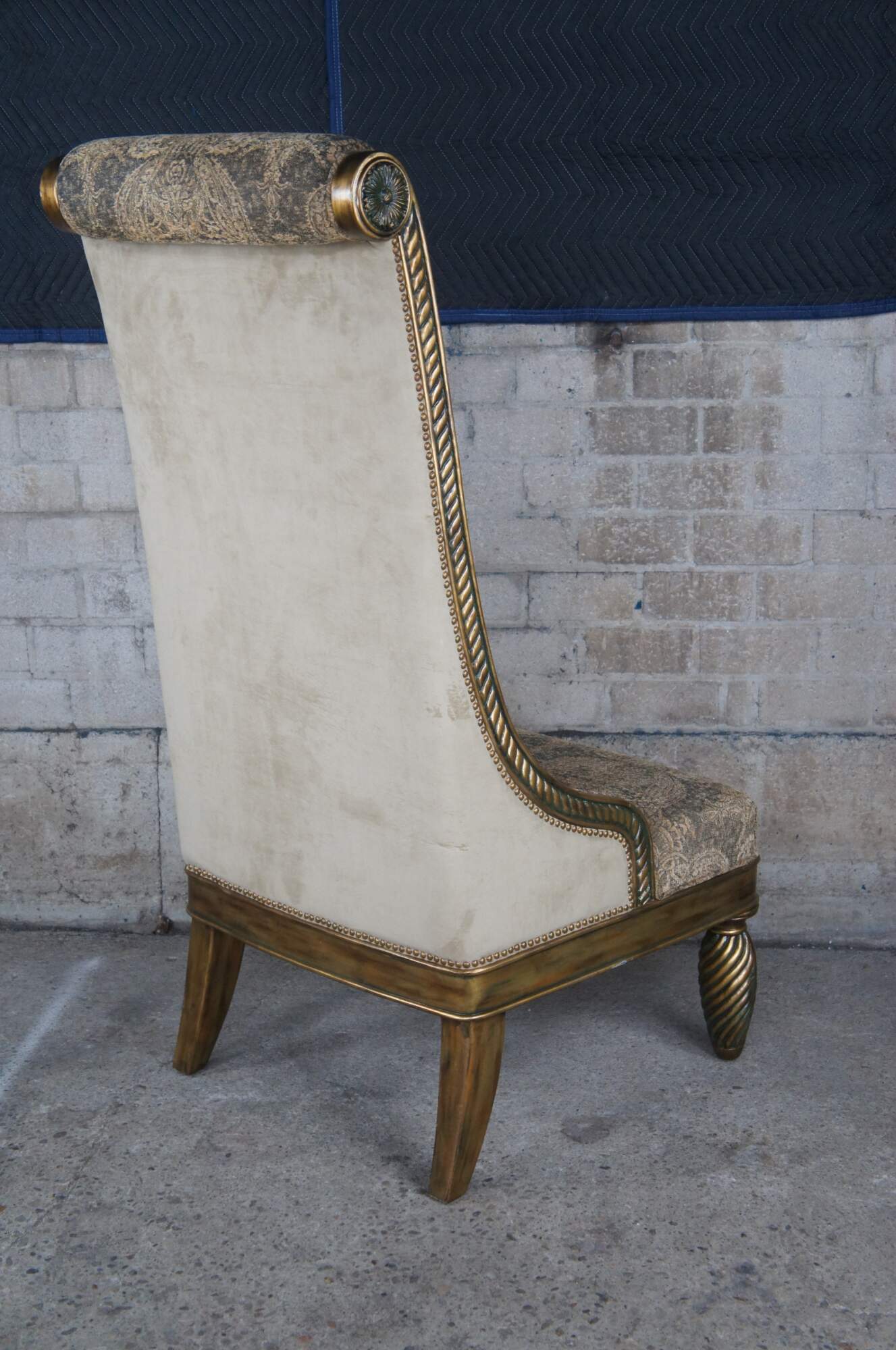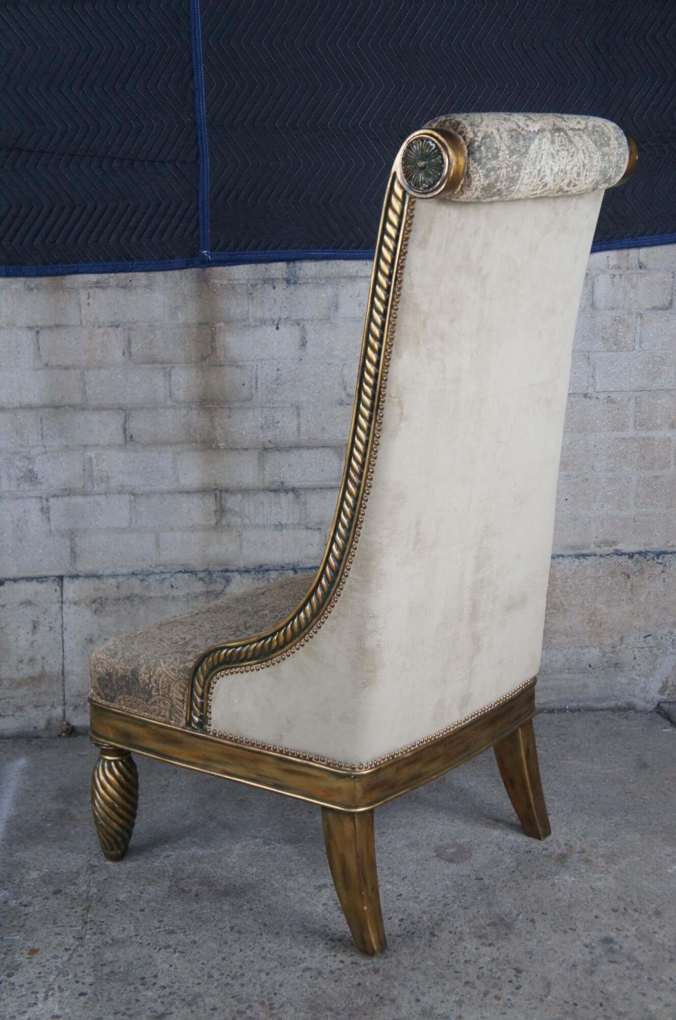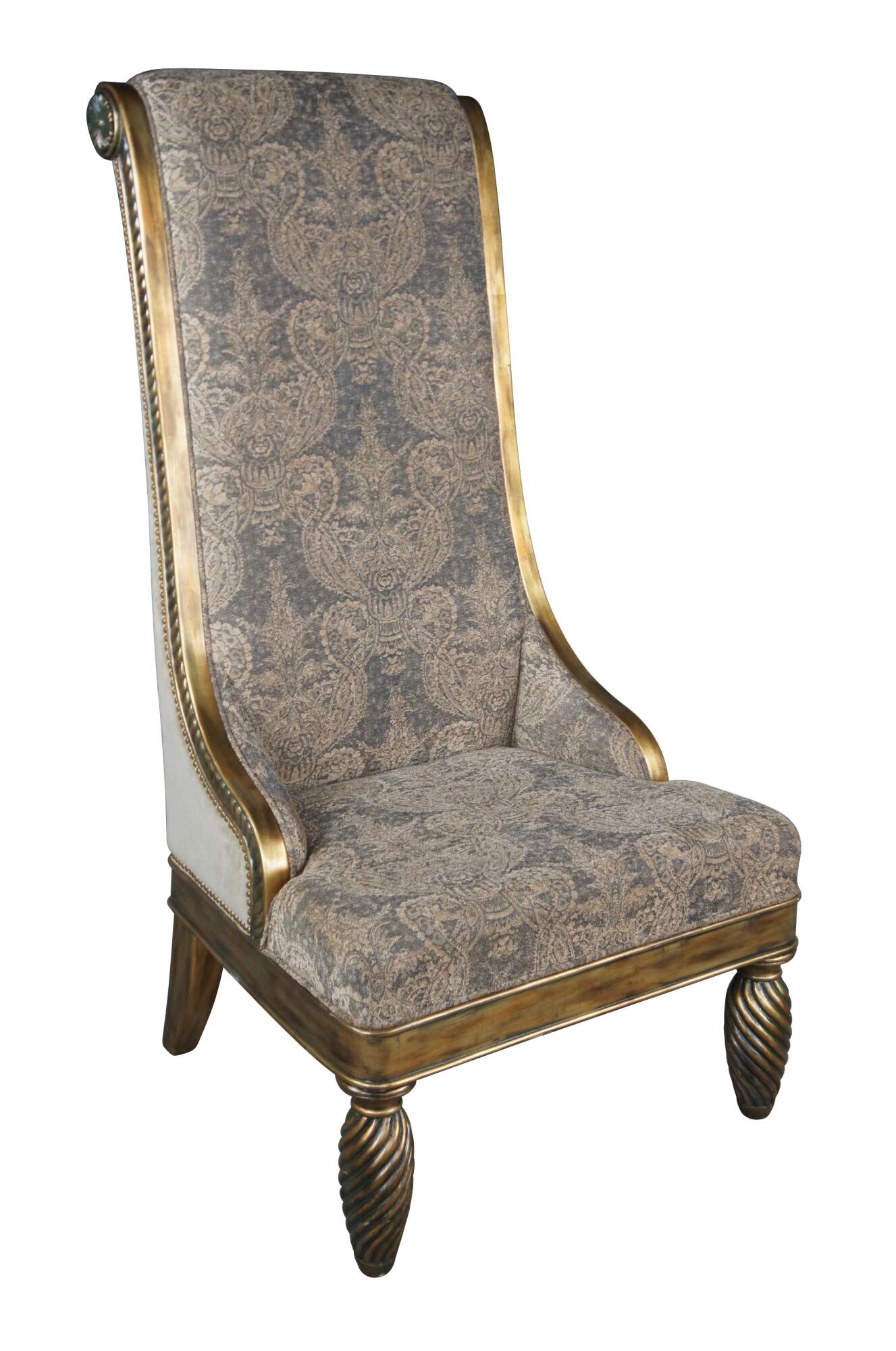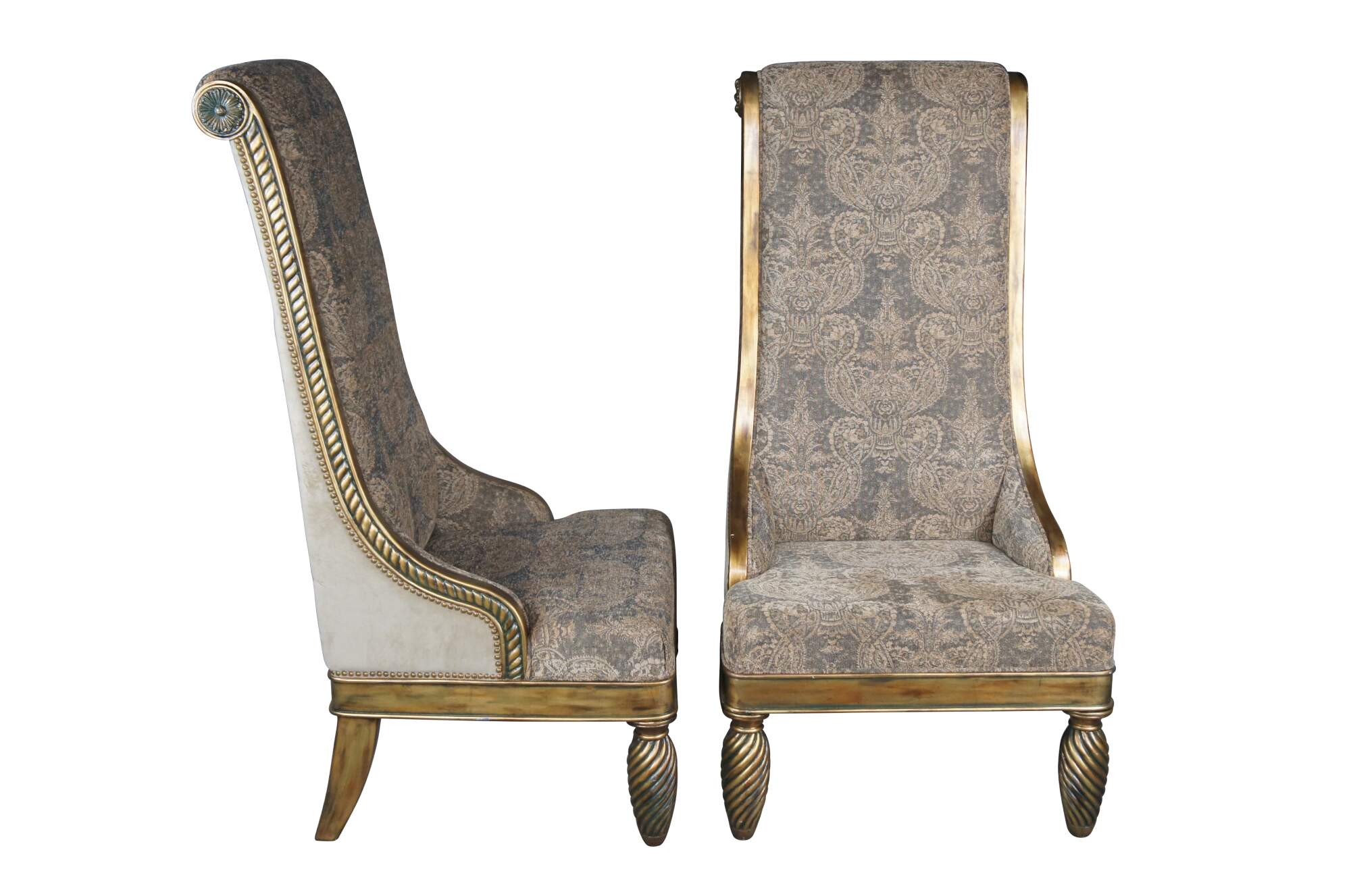 Pair of Hollywood Regency throne chairs featuring oversized gold frames with high rolled backs, accented with medallions and notched design, supported by twisted and flared legs, and upholstered with a velvet / suede nailhead back.