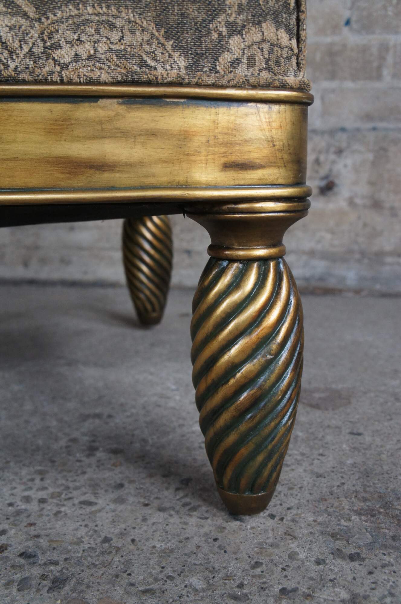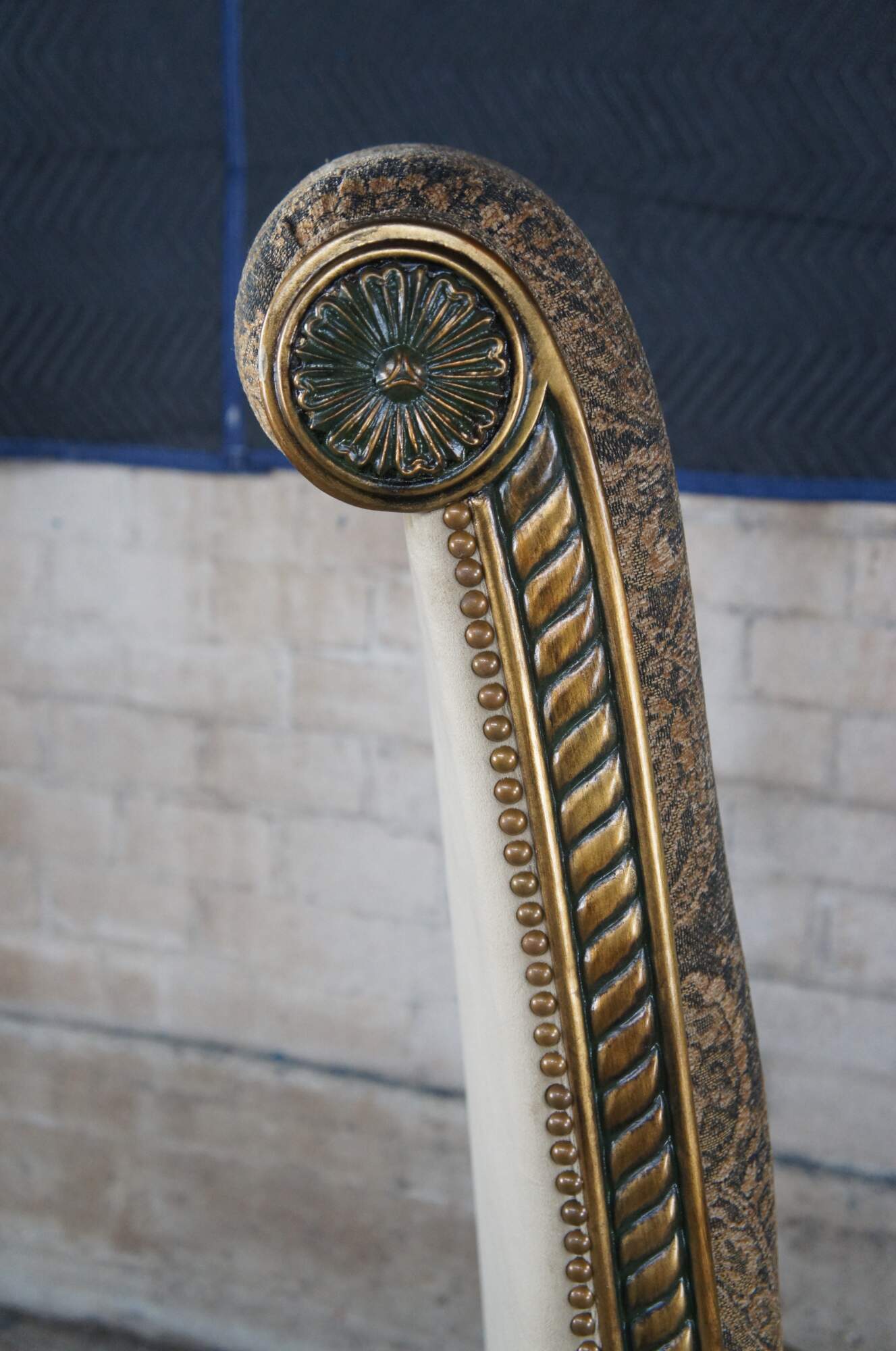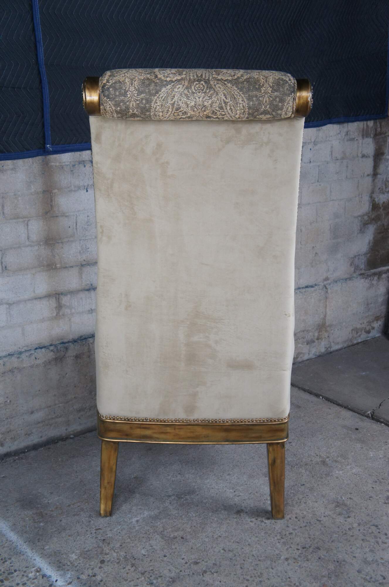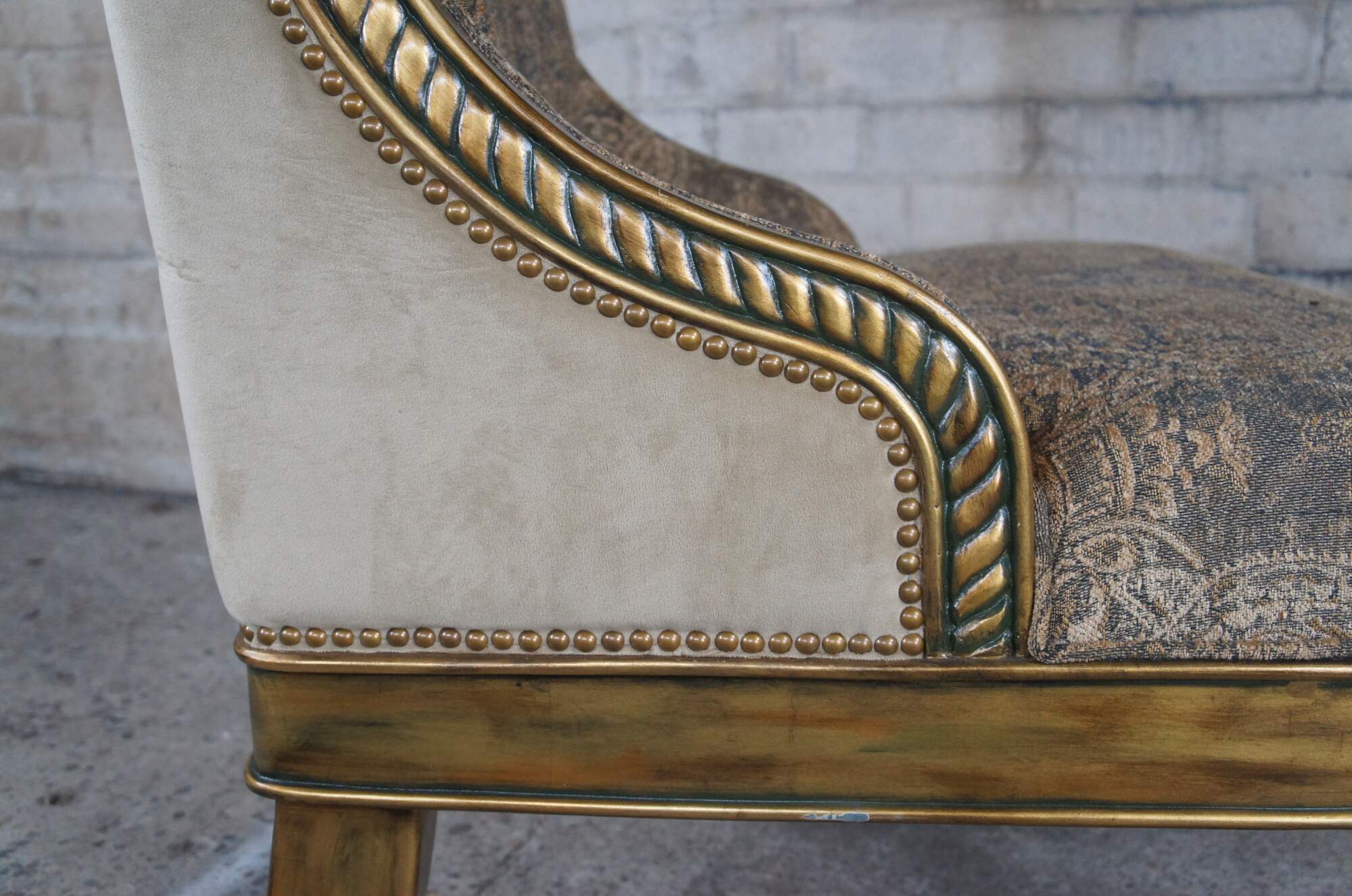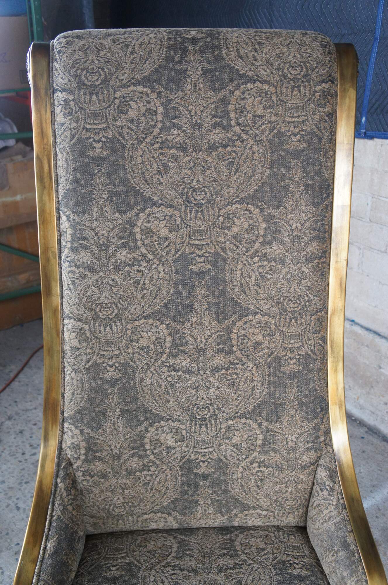 Pair of Hollywood Regency throne chairs featuring oversized gold frames with high rolled backs, accented with medallions and notched design, supported by twisted and flared legs, and upholstered with a velvet / suede nailhead back.