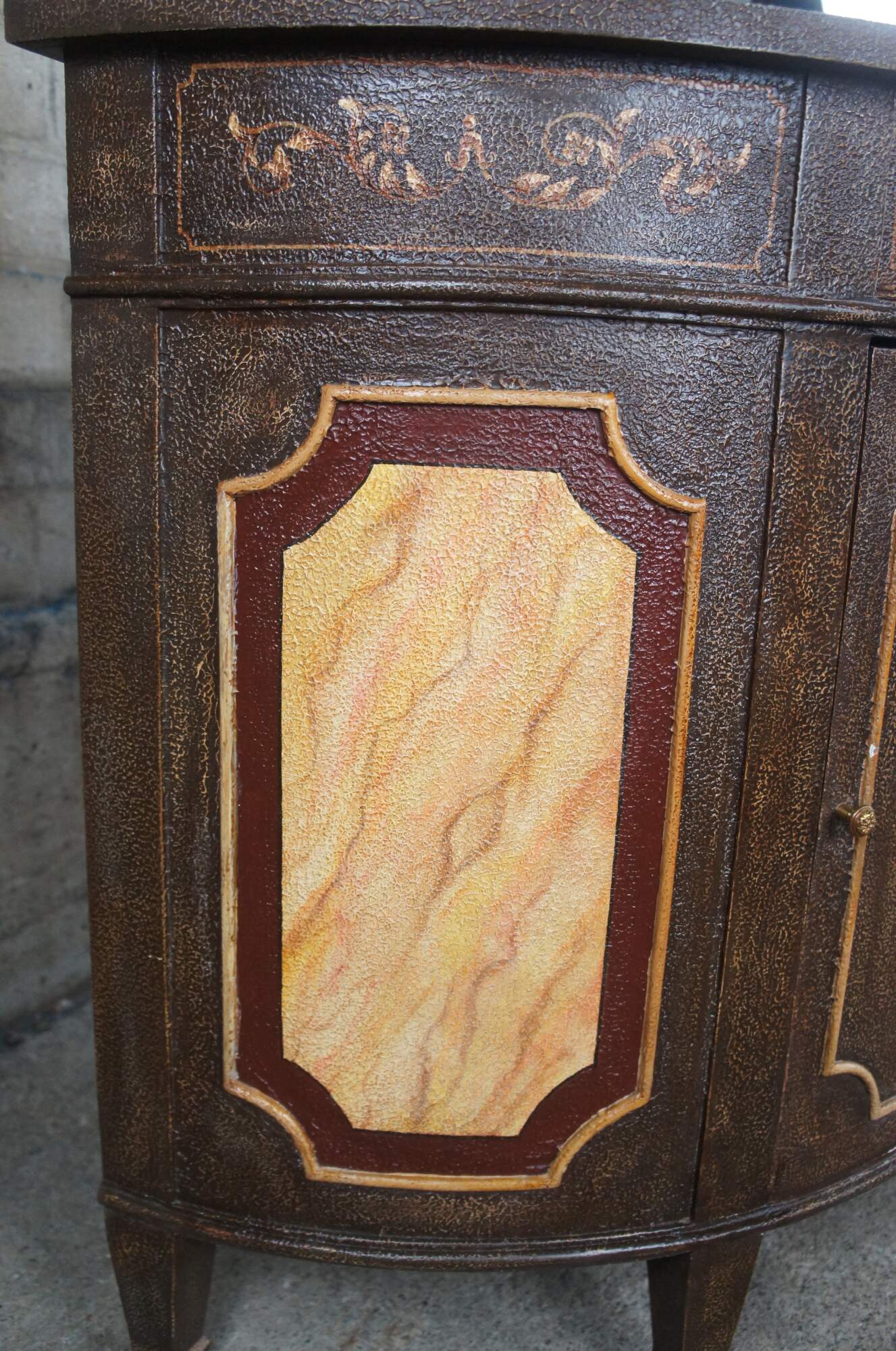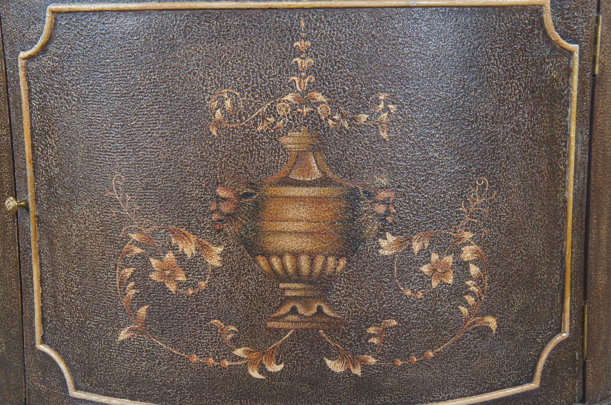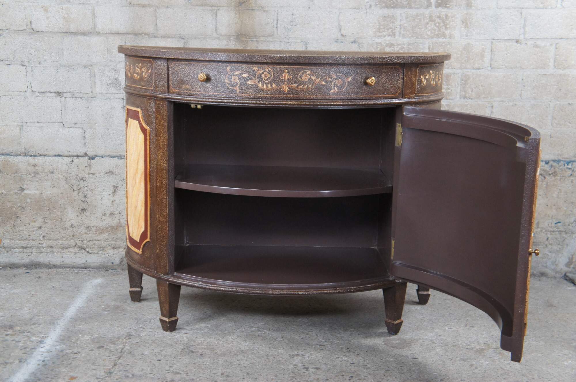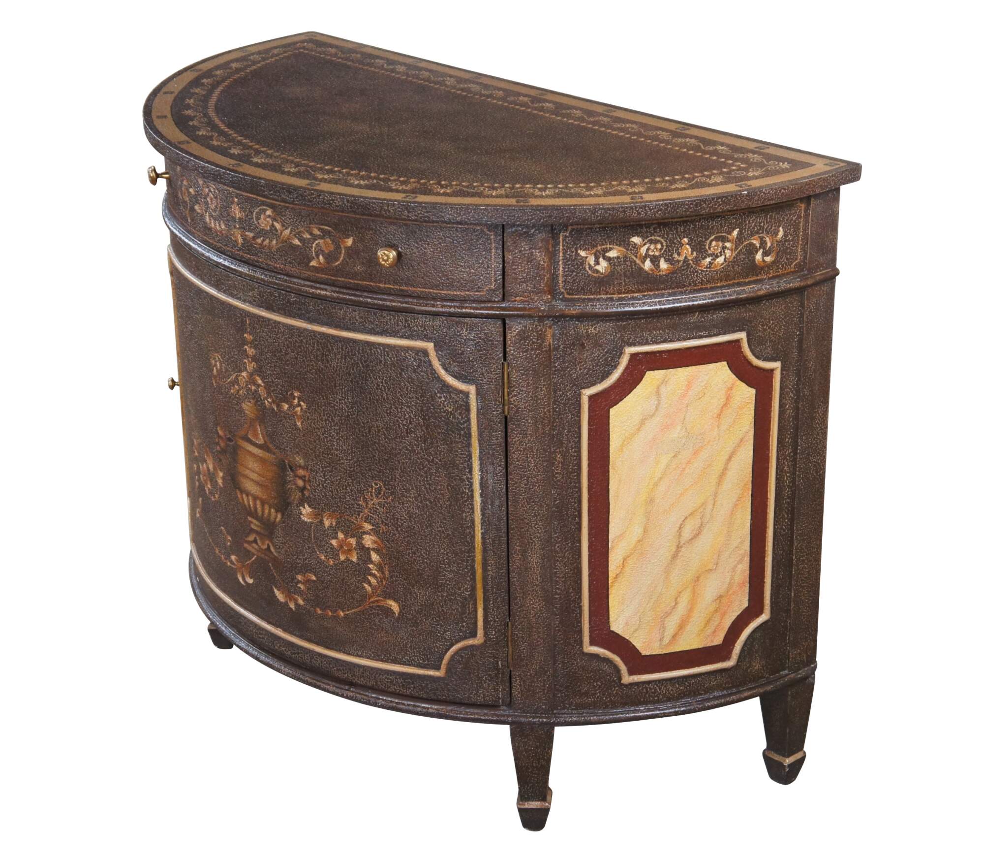 Pair of two Maitland Smith Poise Chiffonier sideboard cabinets, console tables or commodes featuring demilune / half round form with upper drawer, lower cabinet and textured hand painted finish of a Neoclassical urn with lion heads surrounded by scrolled floral / acanthus accents.