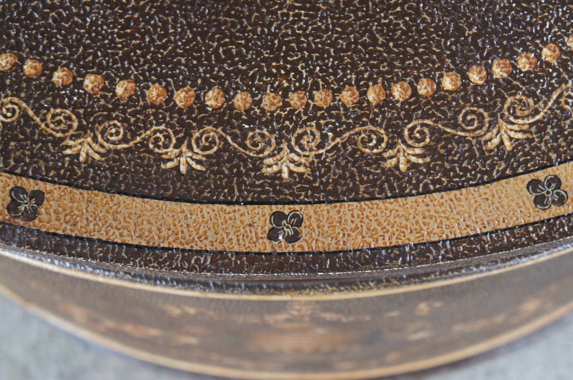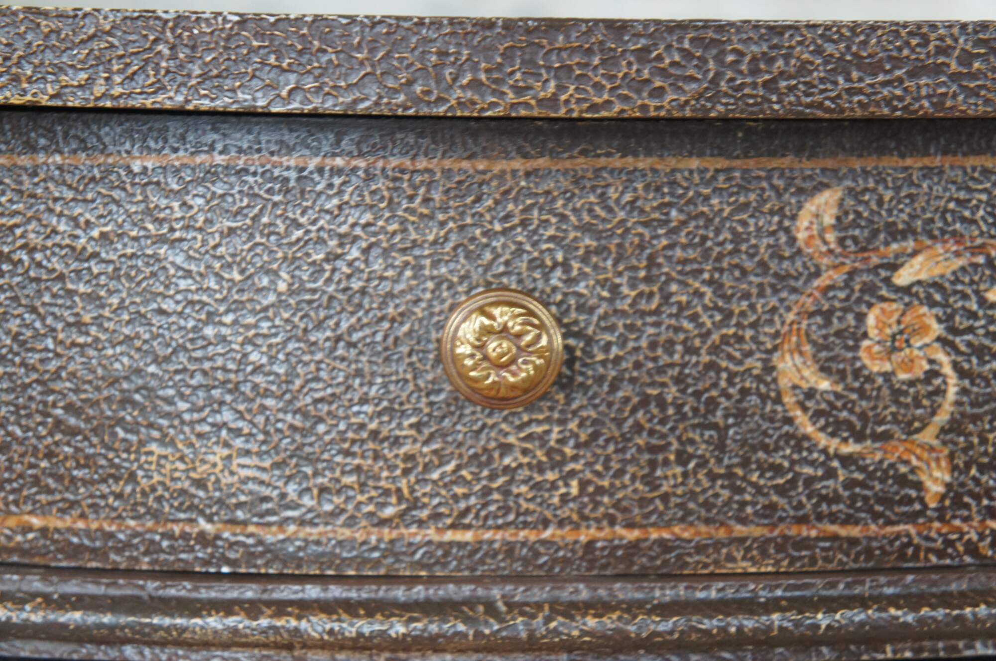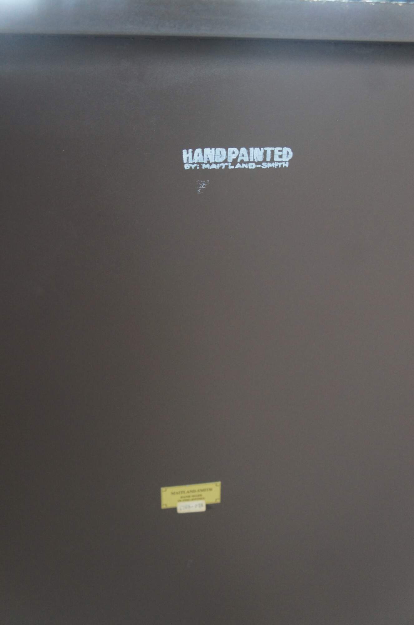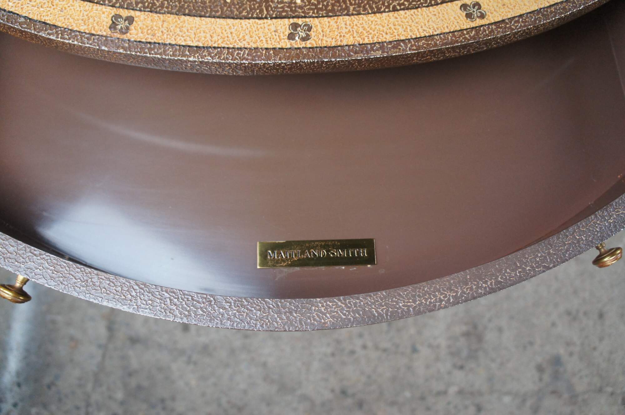 Pair of two Maitland Smith Poise Chiffonier sideboard cabinets, console tables or commodes featuring demilune / half round form with upper drawer, lower cabinet and textured hand painted finish of a Neoclassical urn with lion heads surrounded by scrolled floral / acanthus accents.