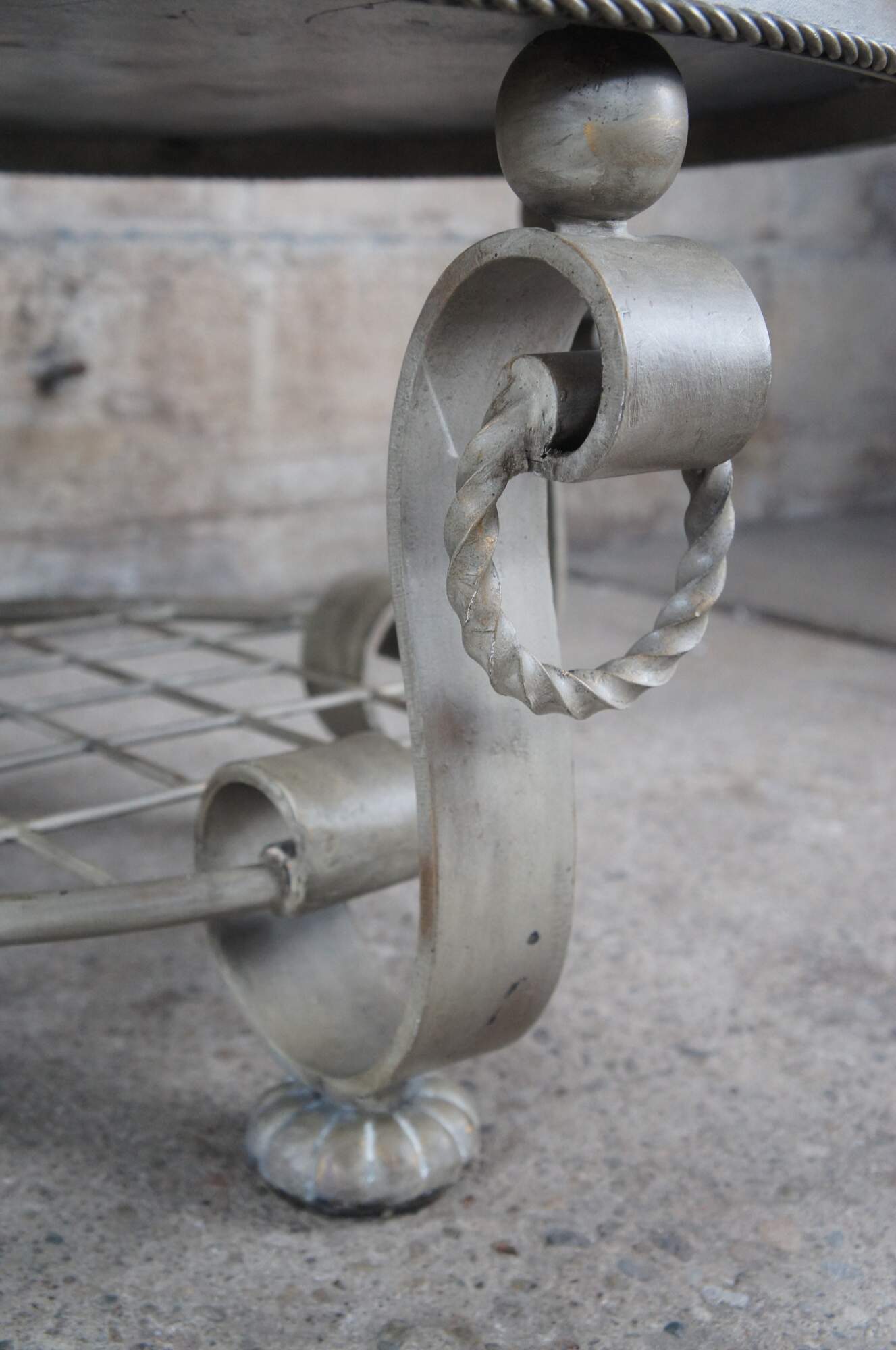 Vintage Maitland Smith coffee or cocktail table featuring round form with tessellated stone top supported by heavy tiered iron base with twisted and scrolled accents.