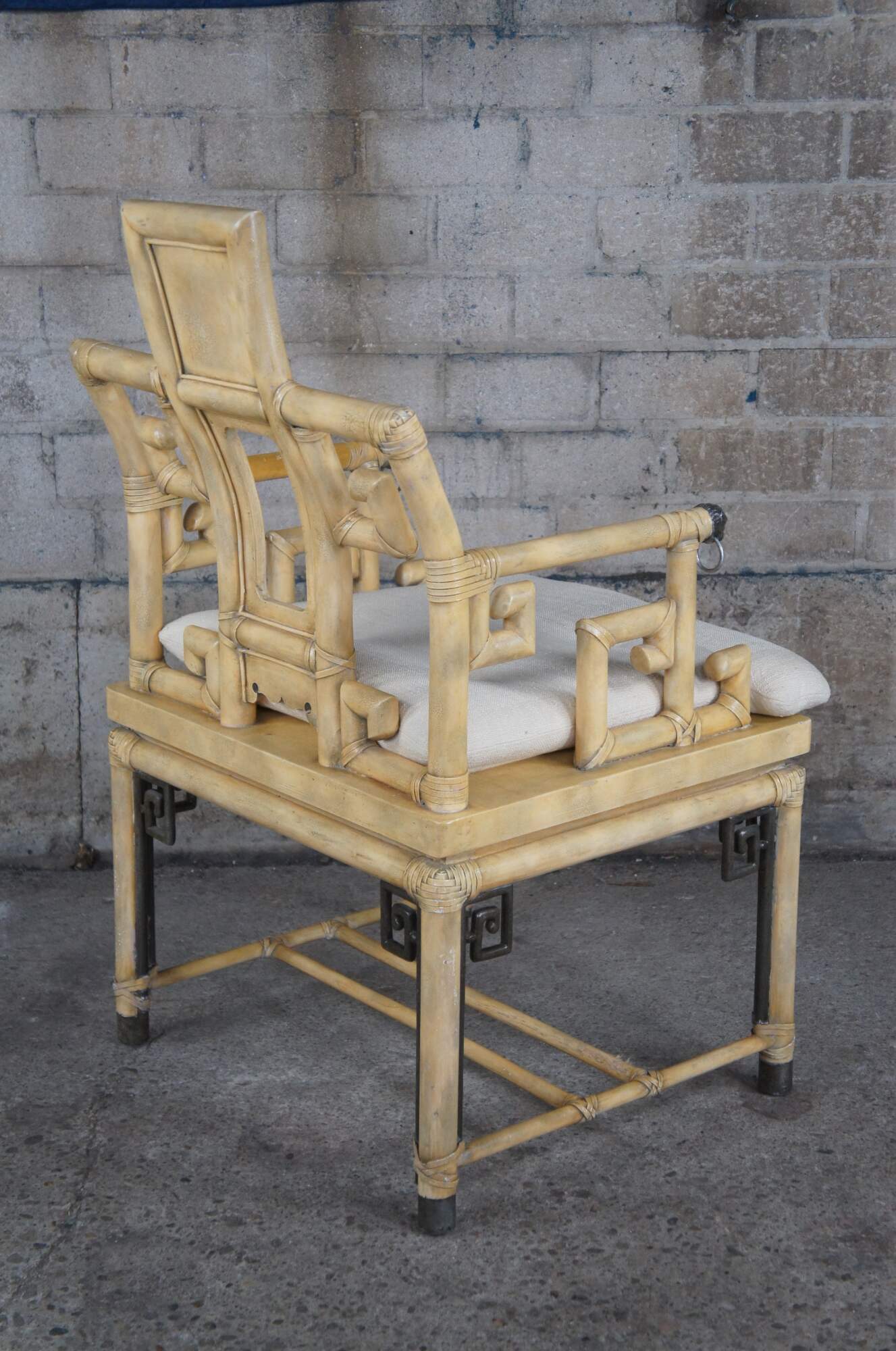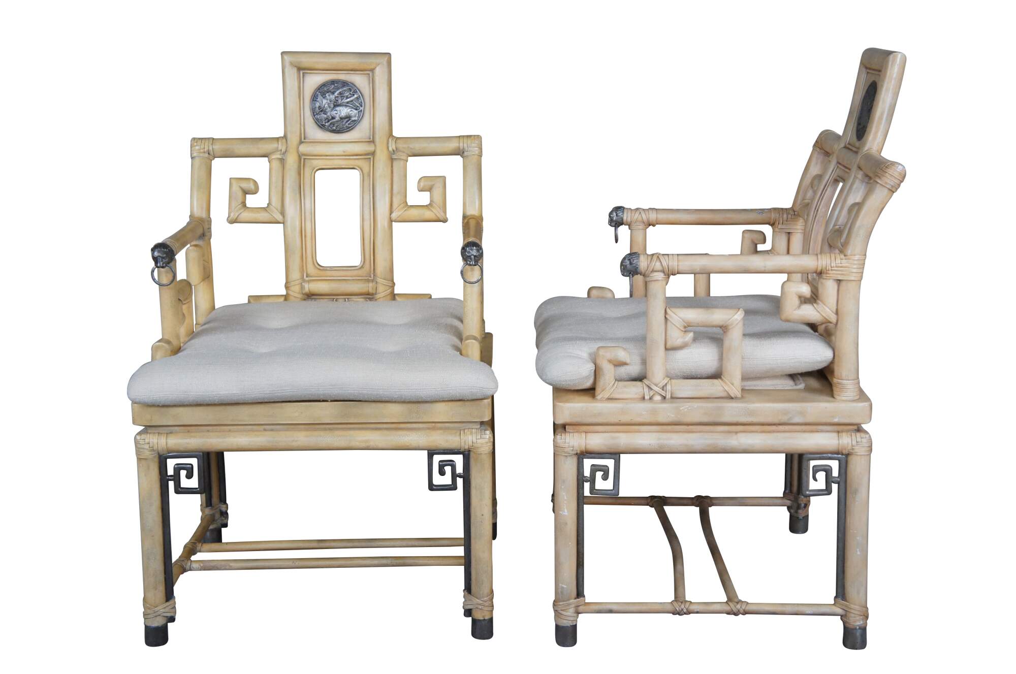 Vintage pair of James Monte / Qing Dynasty / Chinoiserie style armchairs featuring heavy faux bamboo and rattan frames with open reticulated design, accented with lion heads, animal motif medallions, tufted seat and capped feet.