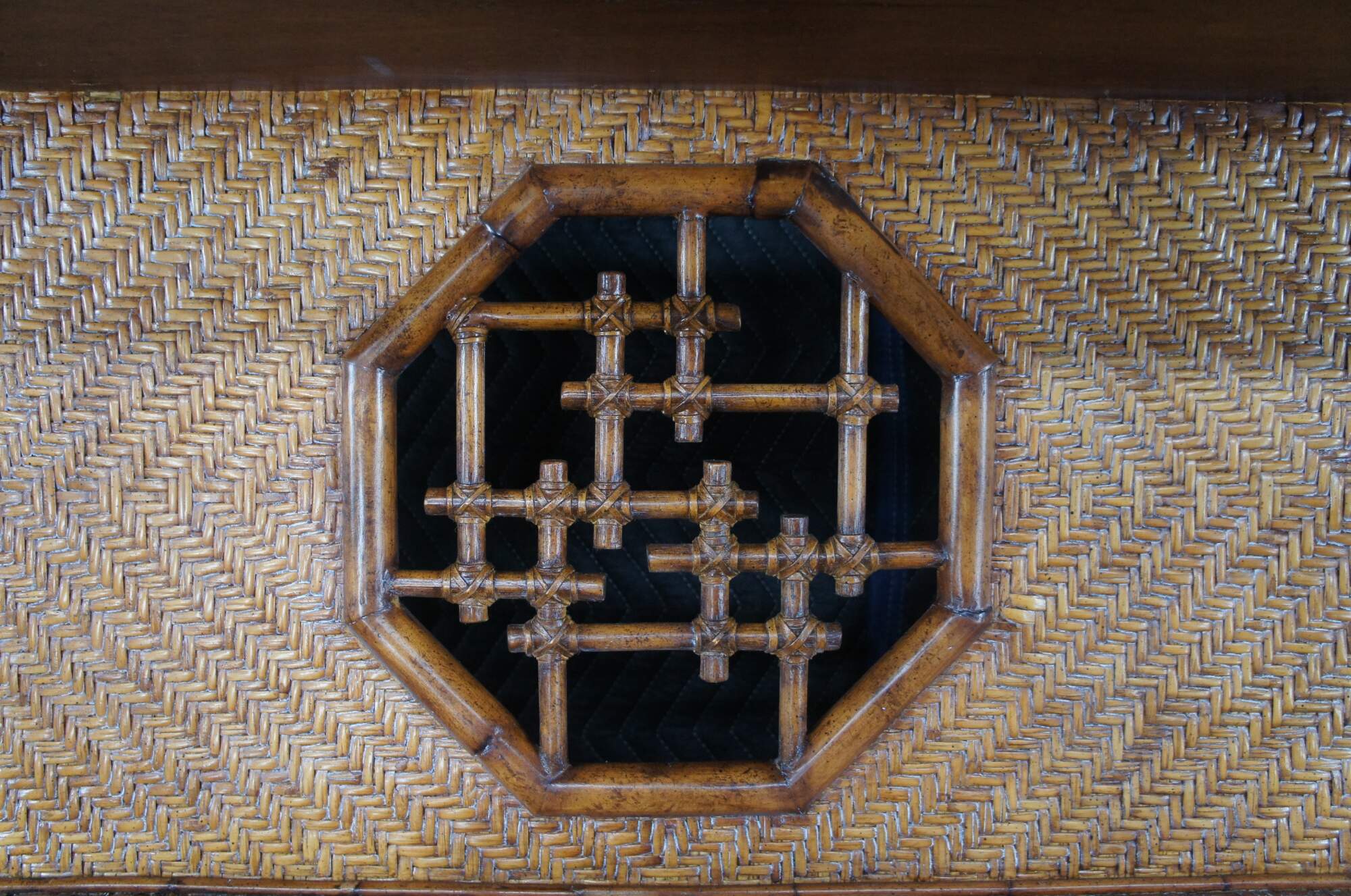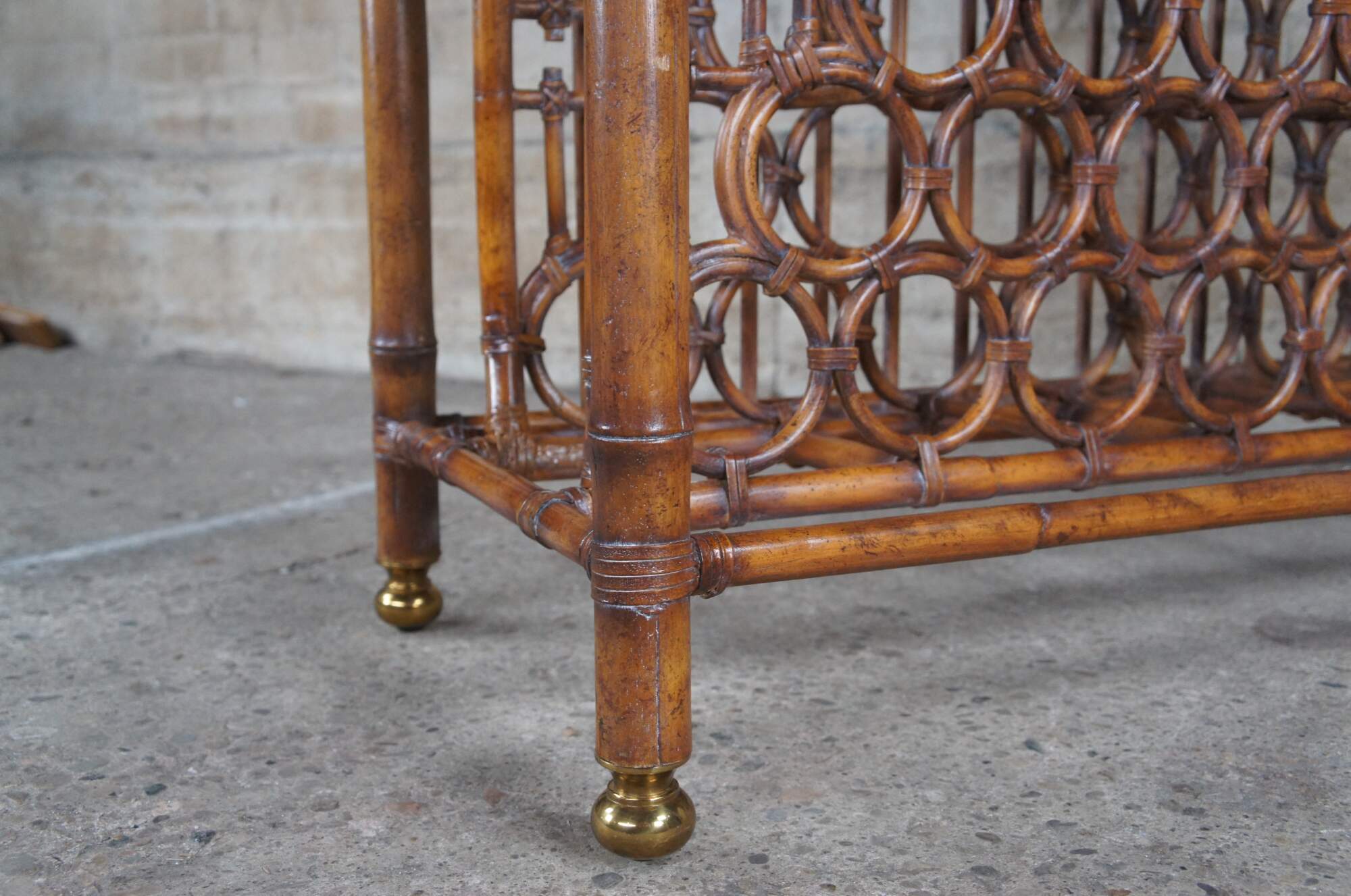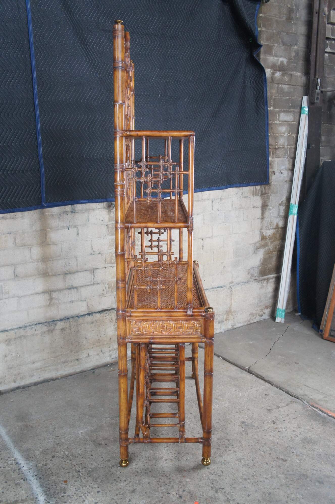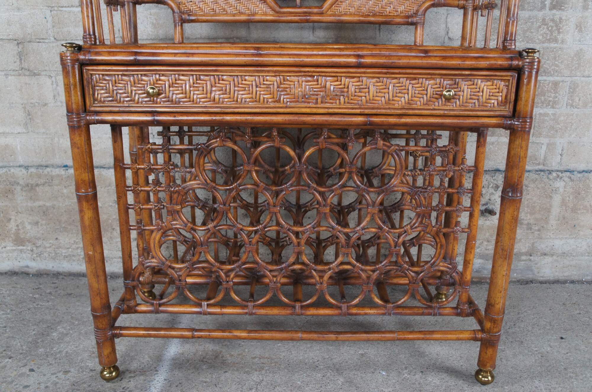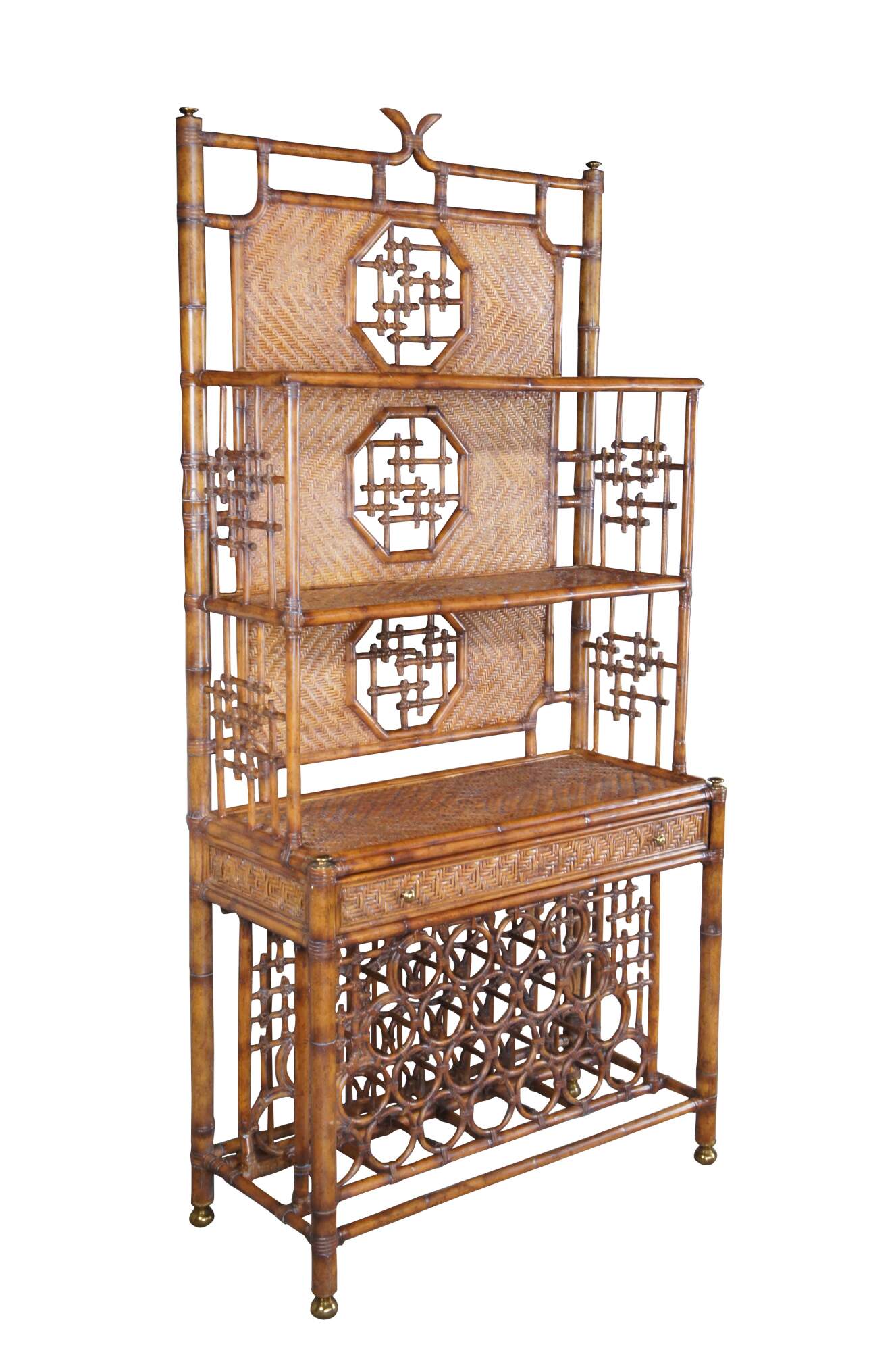 Stately Etagere display or wine dry bar by Maitland Smith, circa 1990s. Made from faux bamboo and woven rattan with two shelves over a table surface, drawer and lower wine or liquor bottle storage. Features octagonal windows along the back with unique chinoiserie lattice design that continues into the open sides. The etagere is supported by brass capped feet. Its versatile design makes for the perfect fit for a bohemian, Boho chic, mid century modern or traditional space.