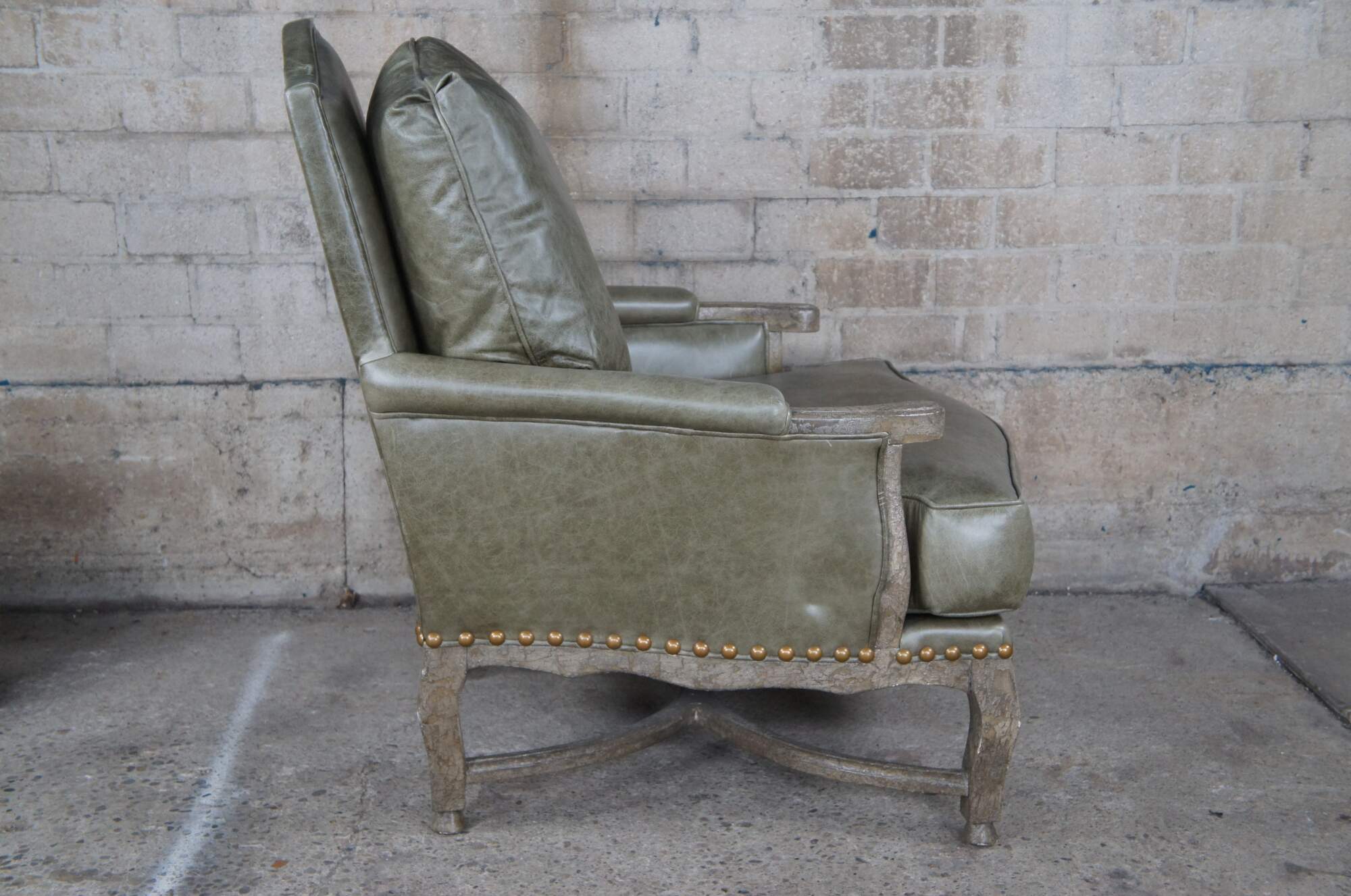 Vintage Dakota Bergere chair and ottoman by Hammer Fine Furniture. Featuring French styling with Tuscan Field Green Leather and Brixton Crackle finish frame with nailhead trim. Made for Joseph Interiors of North Palm Beach Florida.