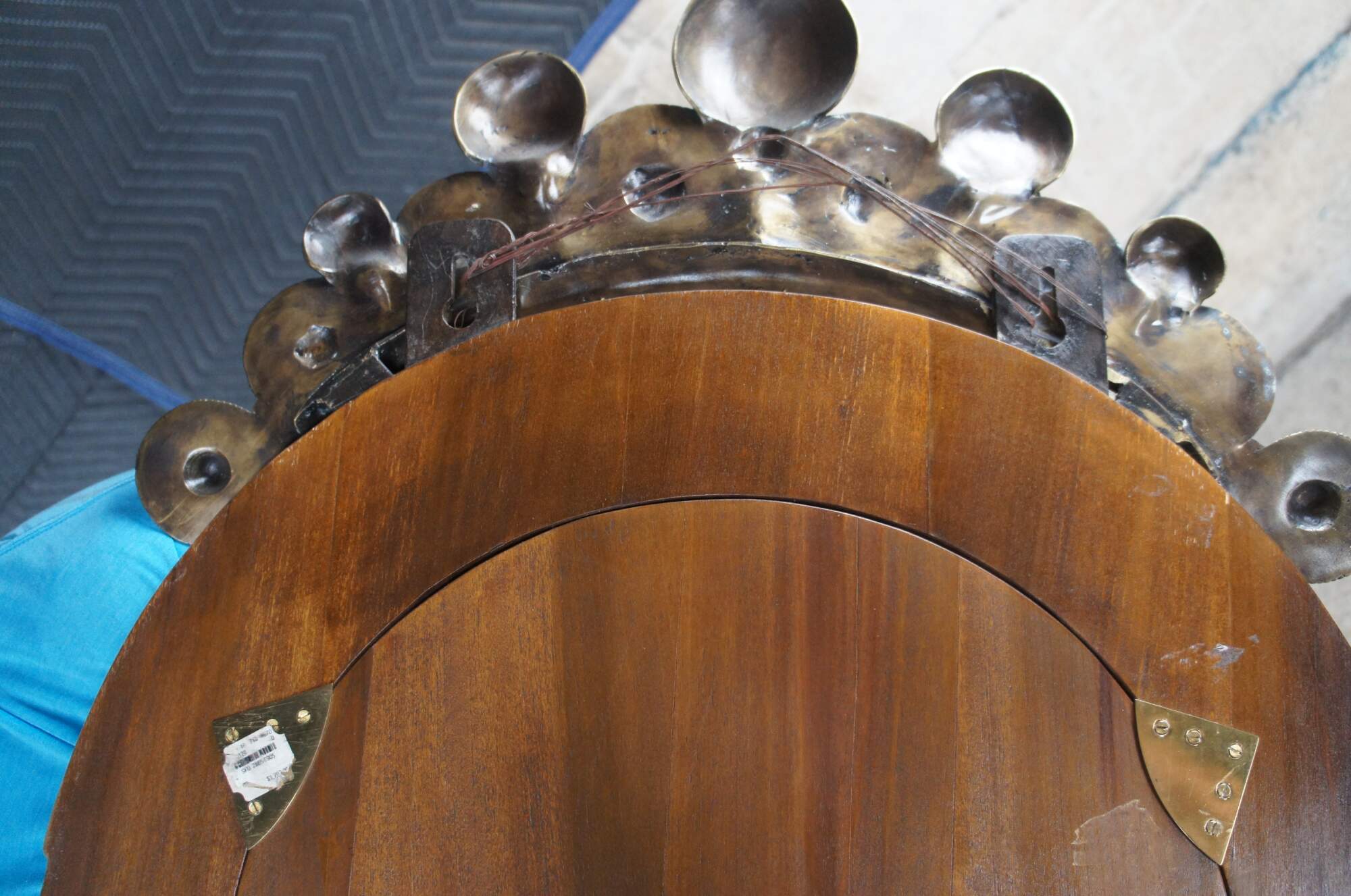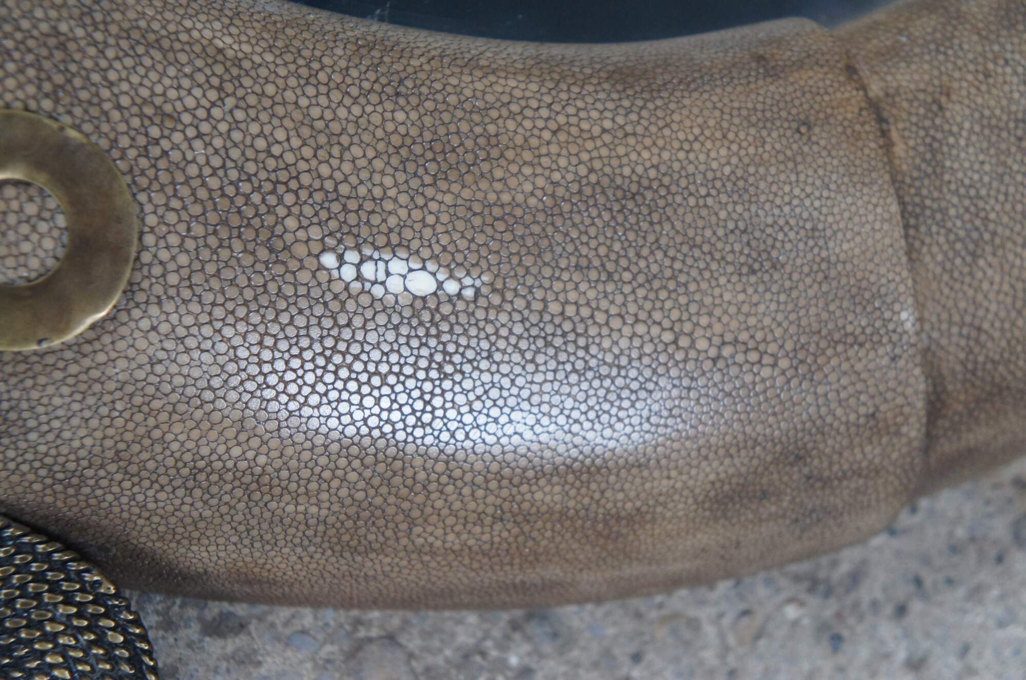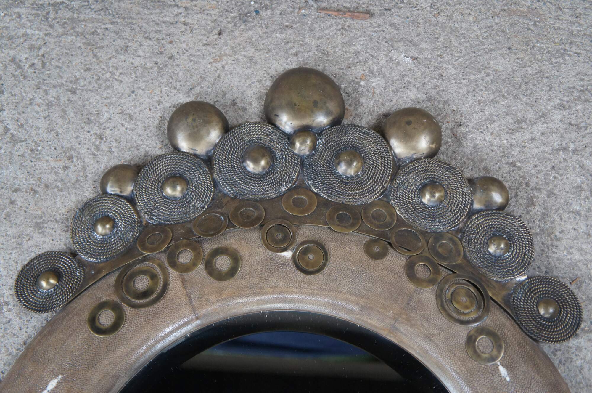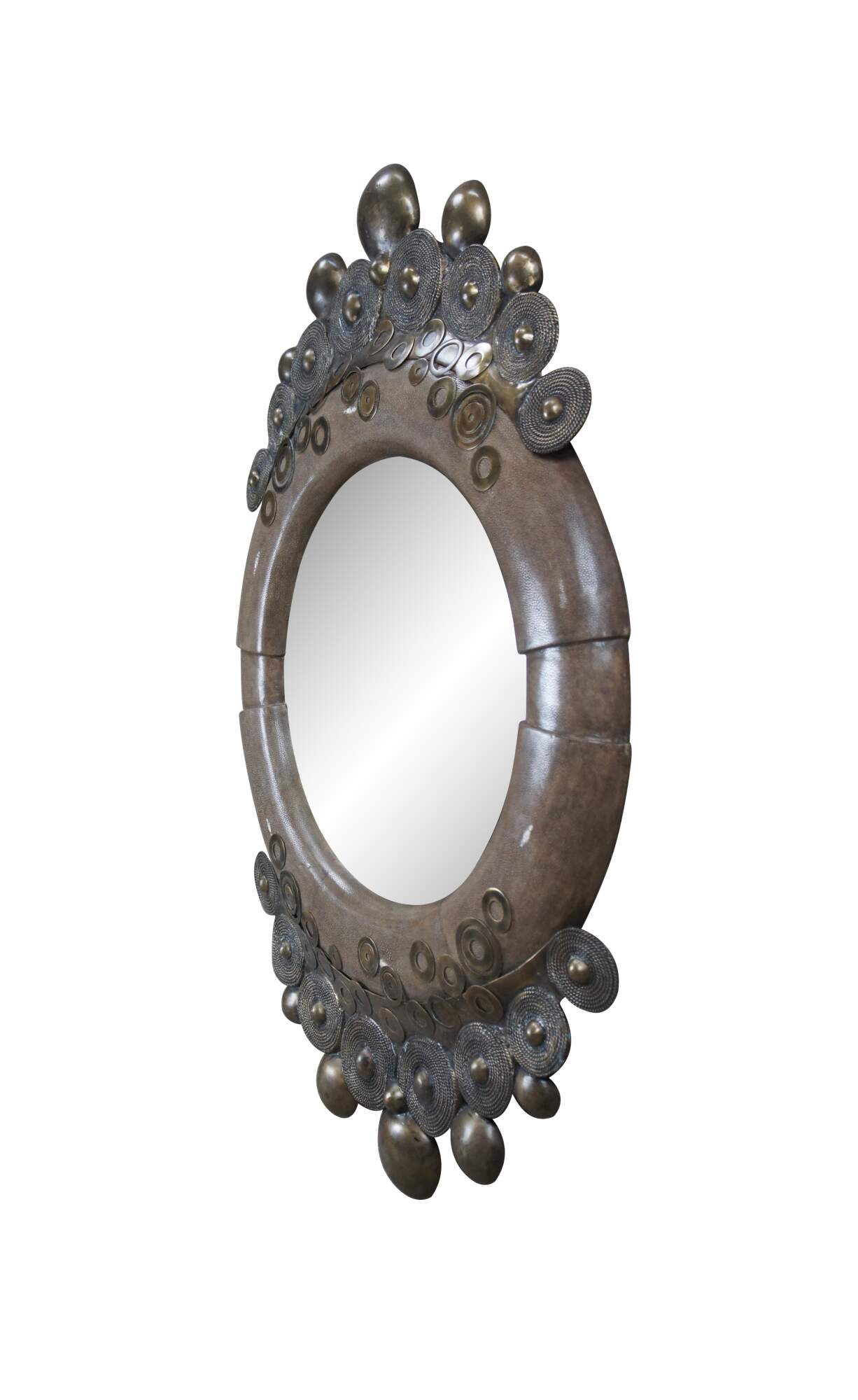 Vintage Atlantis mirror by Ria and Youri Augousti (French). Features brass patinated copper / metal and shagreen leather with layered textured and patterned geometric circles. Made in Paris France.