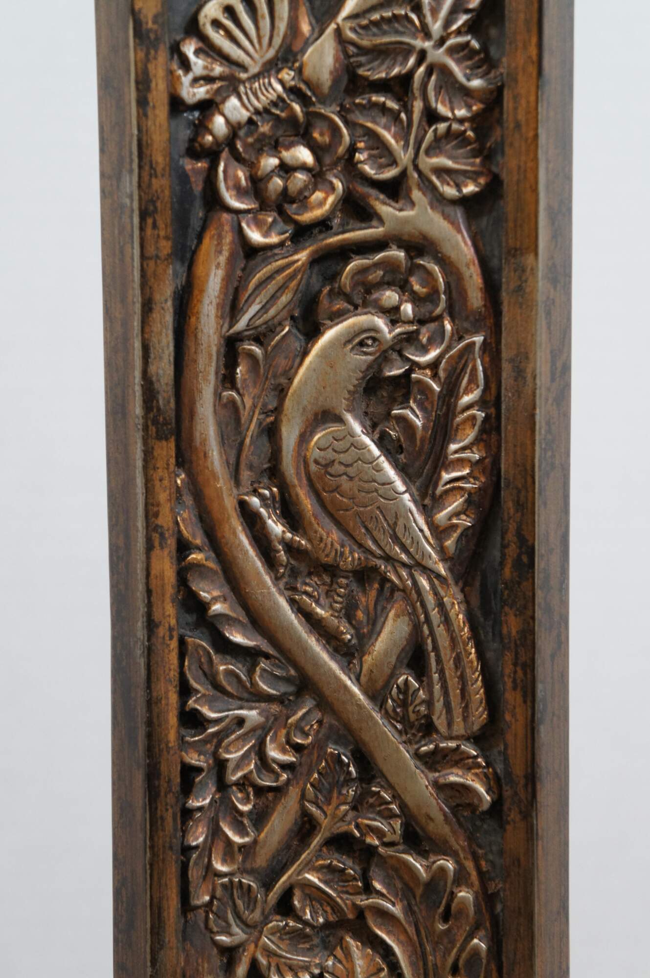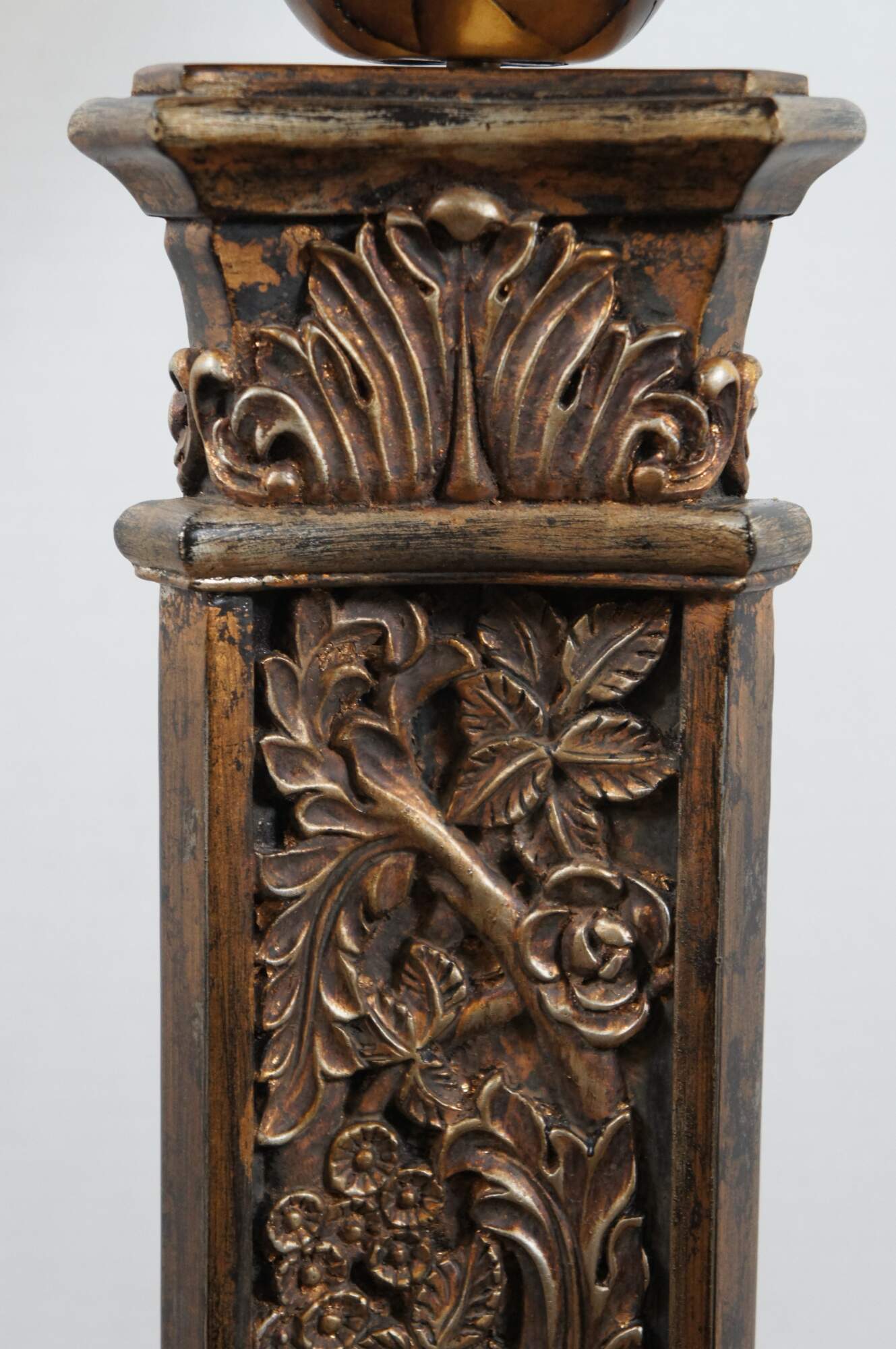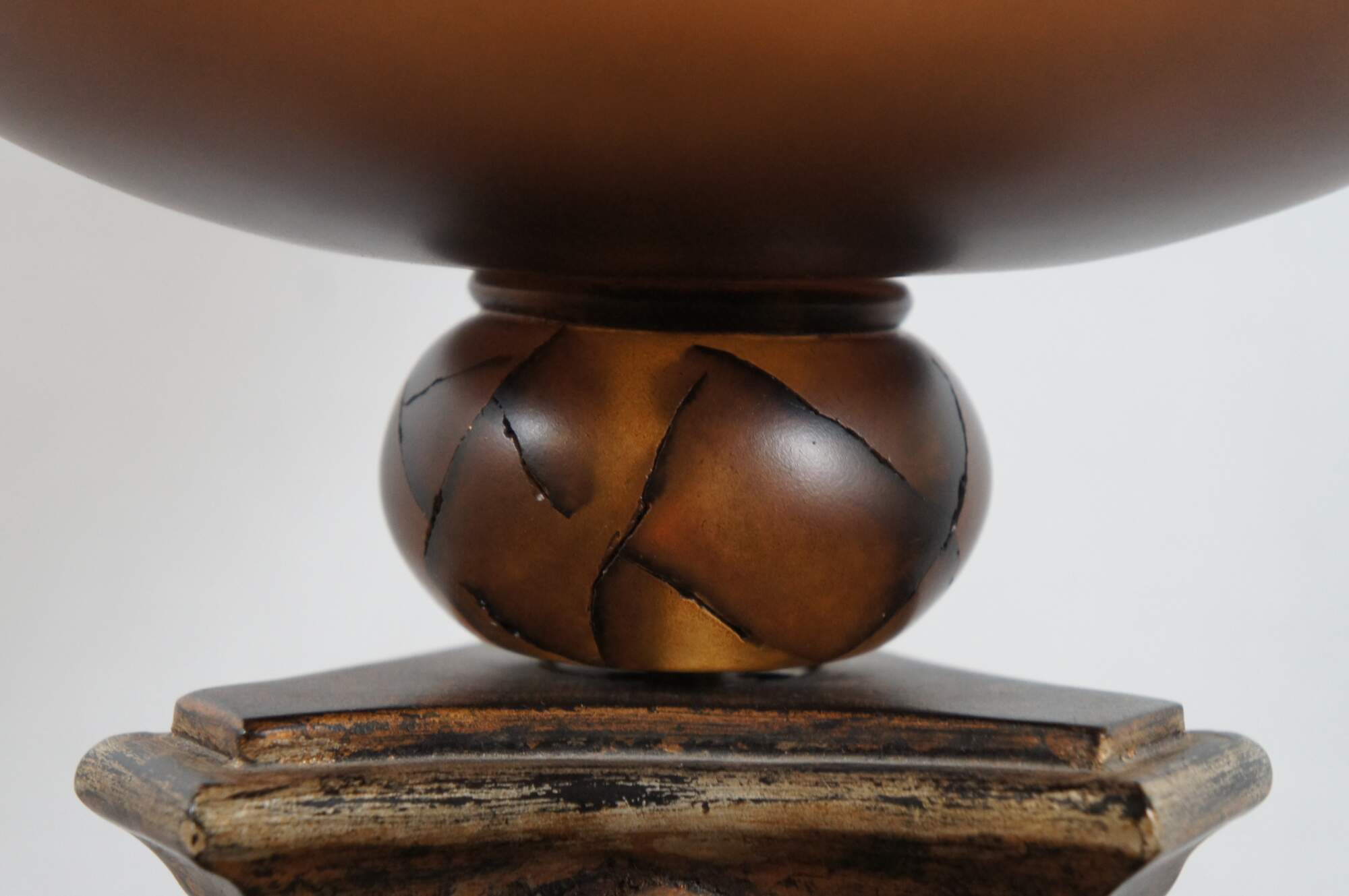 Vintage composite pillar / column / pedestal featuring three sided high relief design of flowers in a planter with a bird and butterfly nestled inside. Topped with an amber colored plastic orb and bowl / dish with darkened edges and center. Was used as a candle holder, but could make a entry bowl for keys, planter, or bird bath (although not intended for outdoor use). Marked on base number 83243201. Made in China.