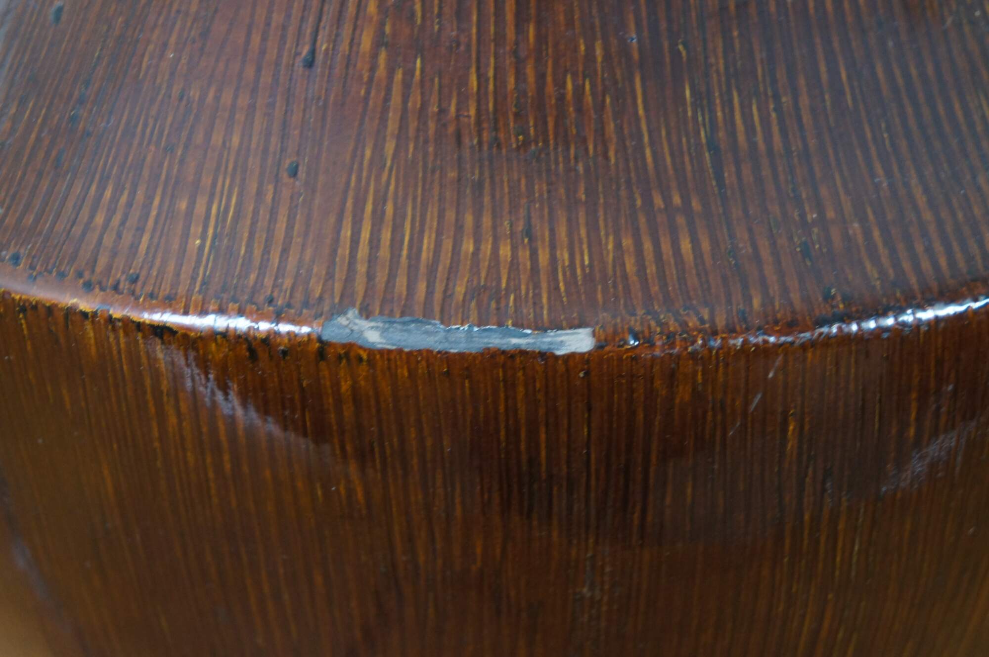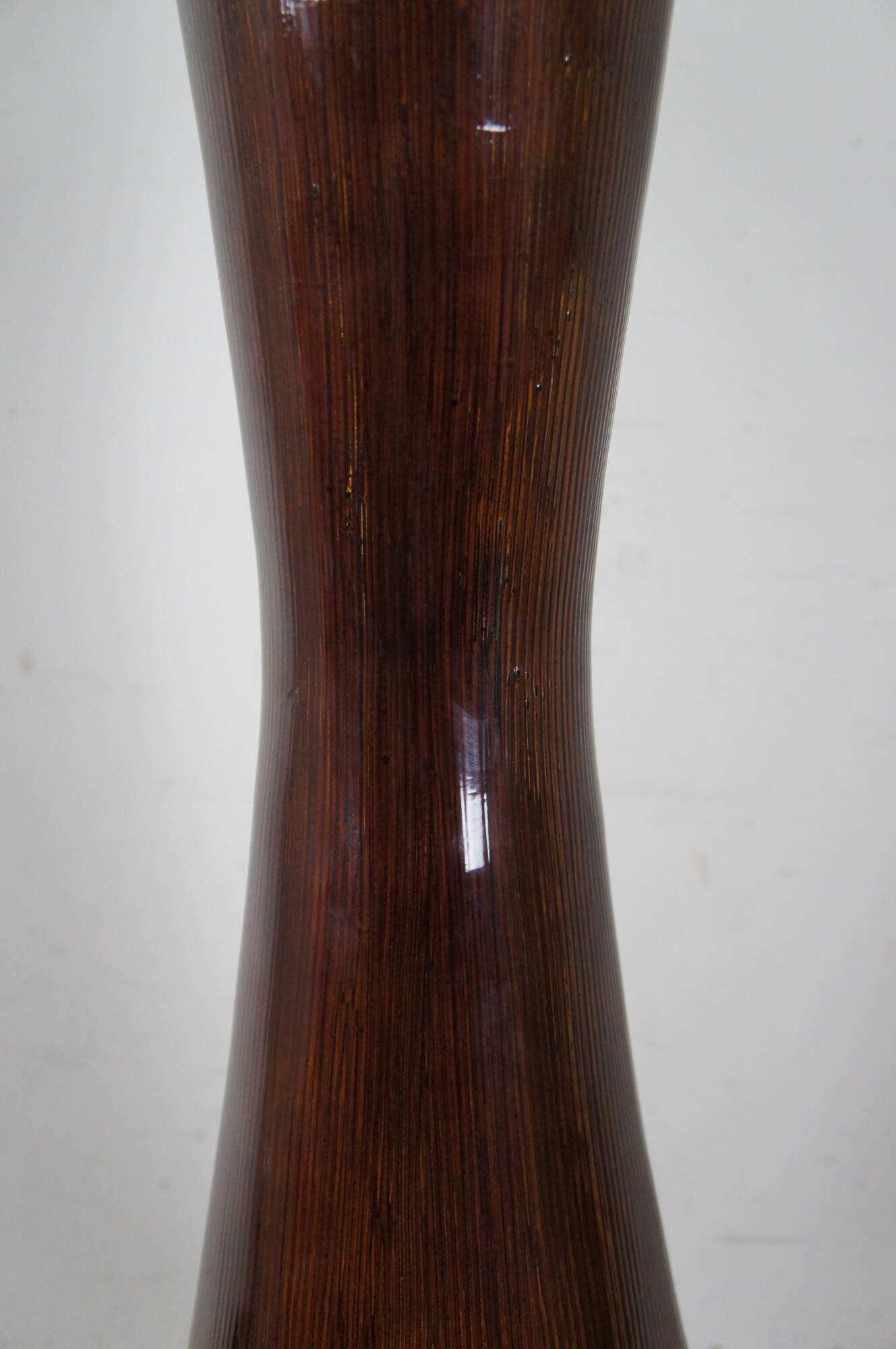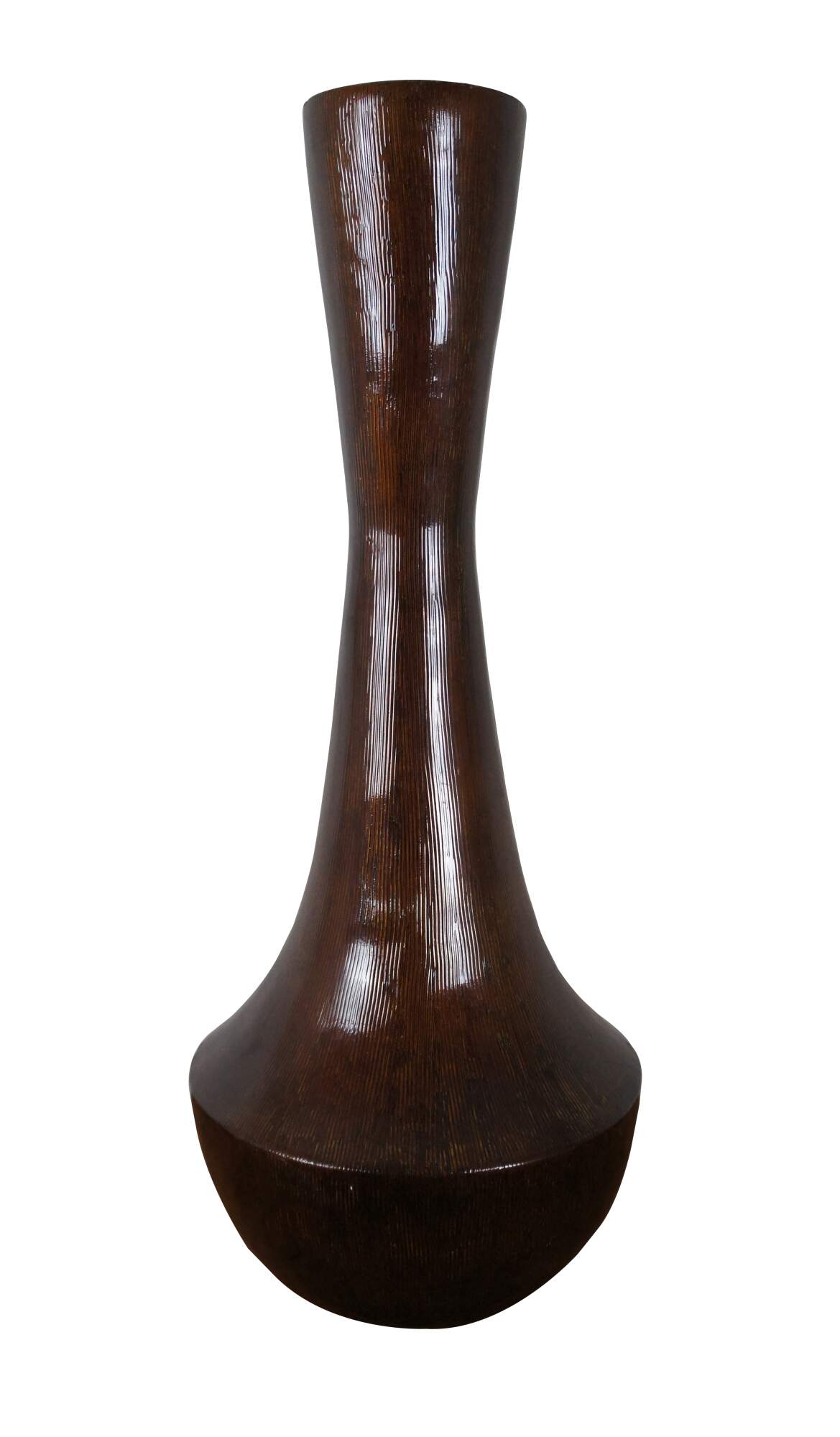 Vintage floor vase featuring a mid-century modern inspired shape -a wide half-round base sweeping up into a cinched / tapered column. Light composite body with a glossy lacquered finish in mottled shades of brown and a finely ridged / fluted texture, evocative of carved wood. Black lacquer interior. Produced by the Three Hands Corporation. Bottom marked 05750385. Item No. 11040. Made in Vietnam.