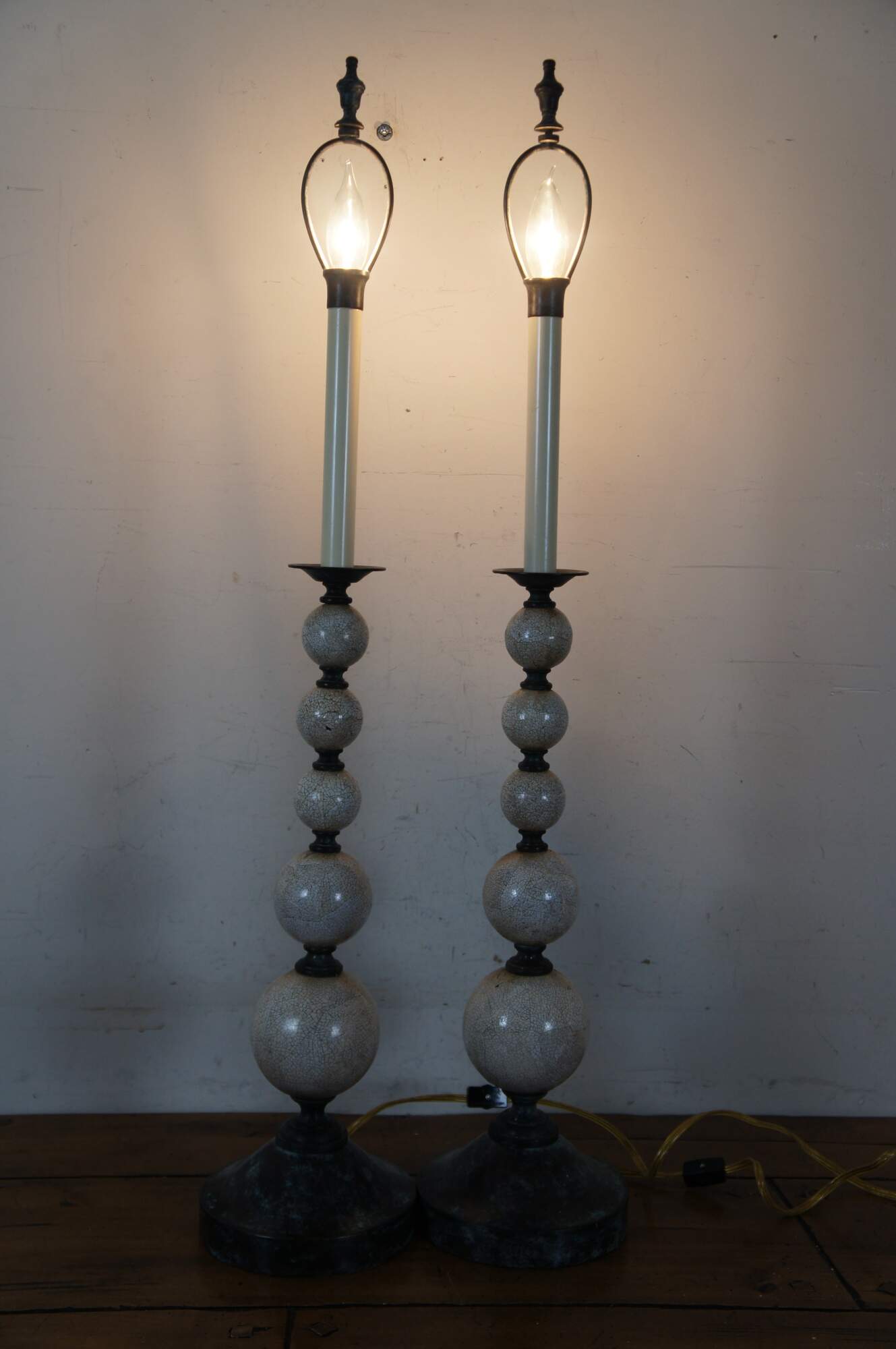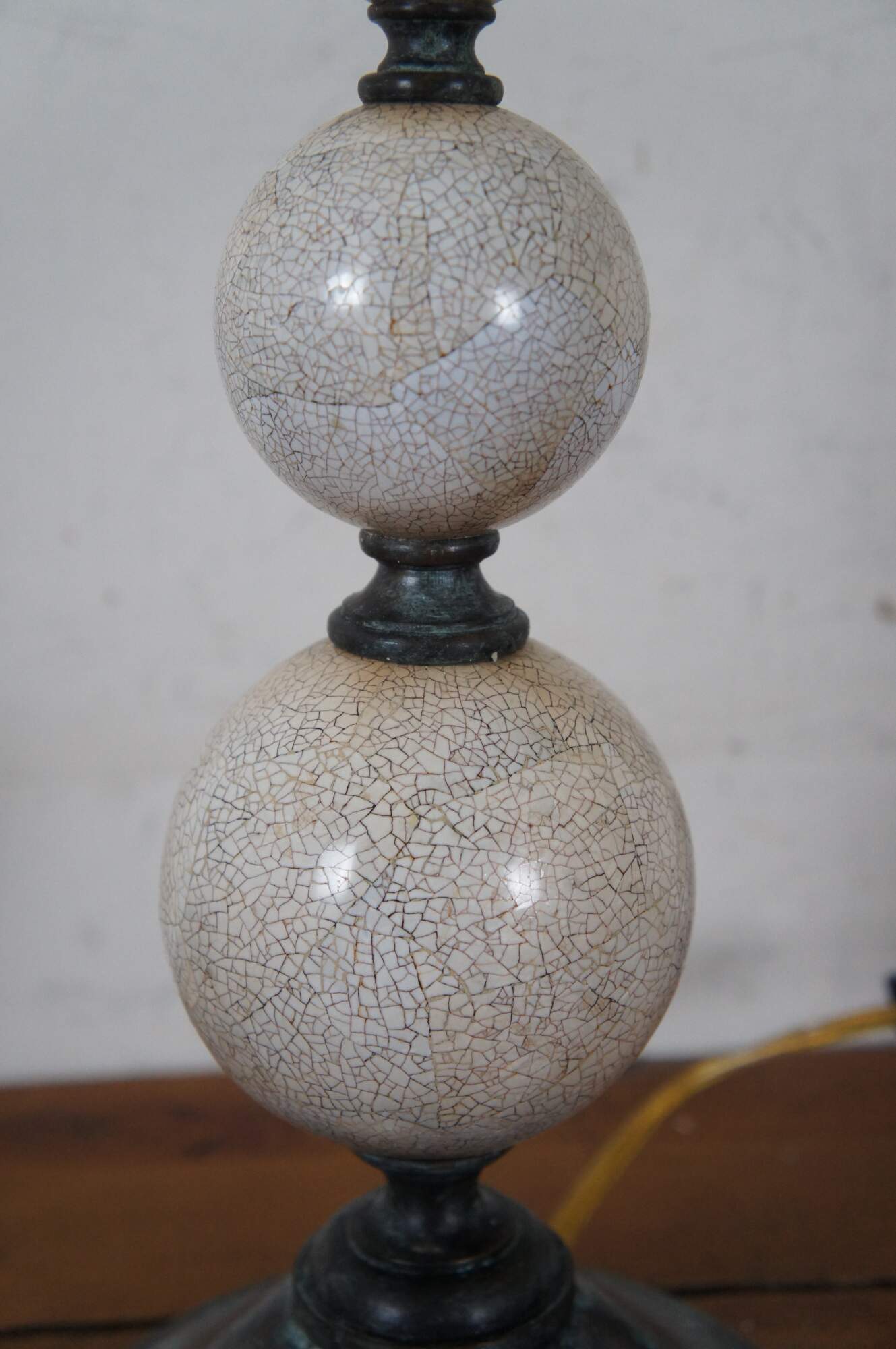 Pair of two Maitland Smith buffet / table lamps featuring round bronze bases and urn shaped finials with factory distressed patina / verdigris, with a series of five stacked white shell mosaic balls of graduated sizes supporting faux candlestick tops. Marked 168 on base. Hand Made in Vietnam.