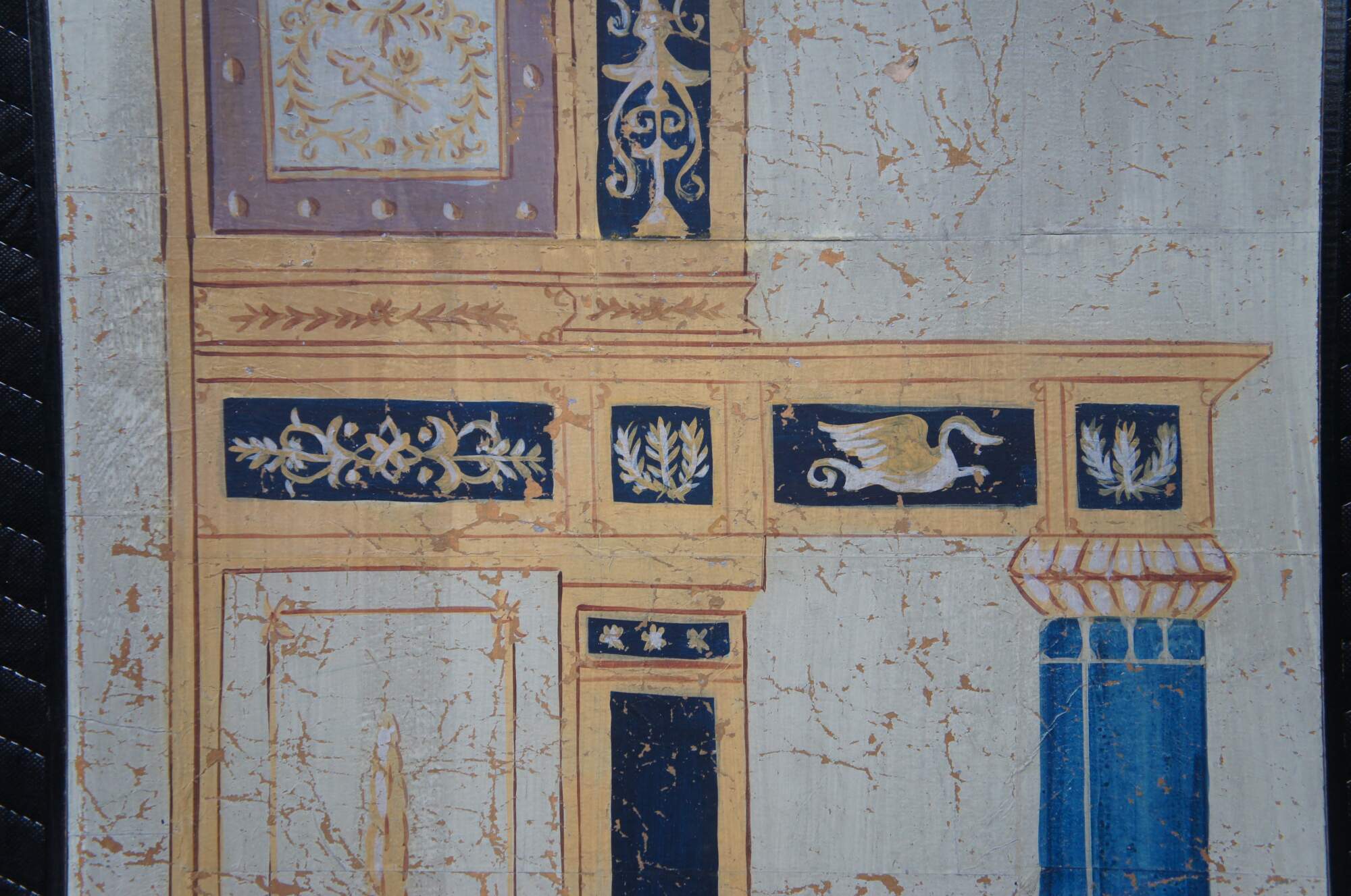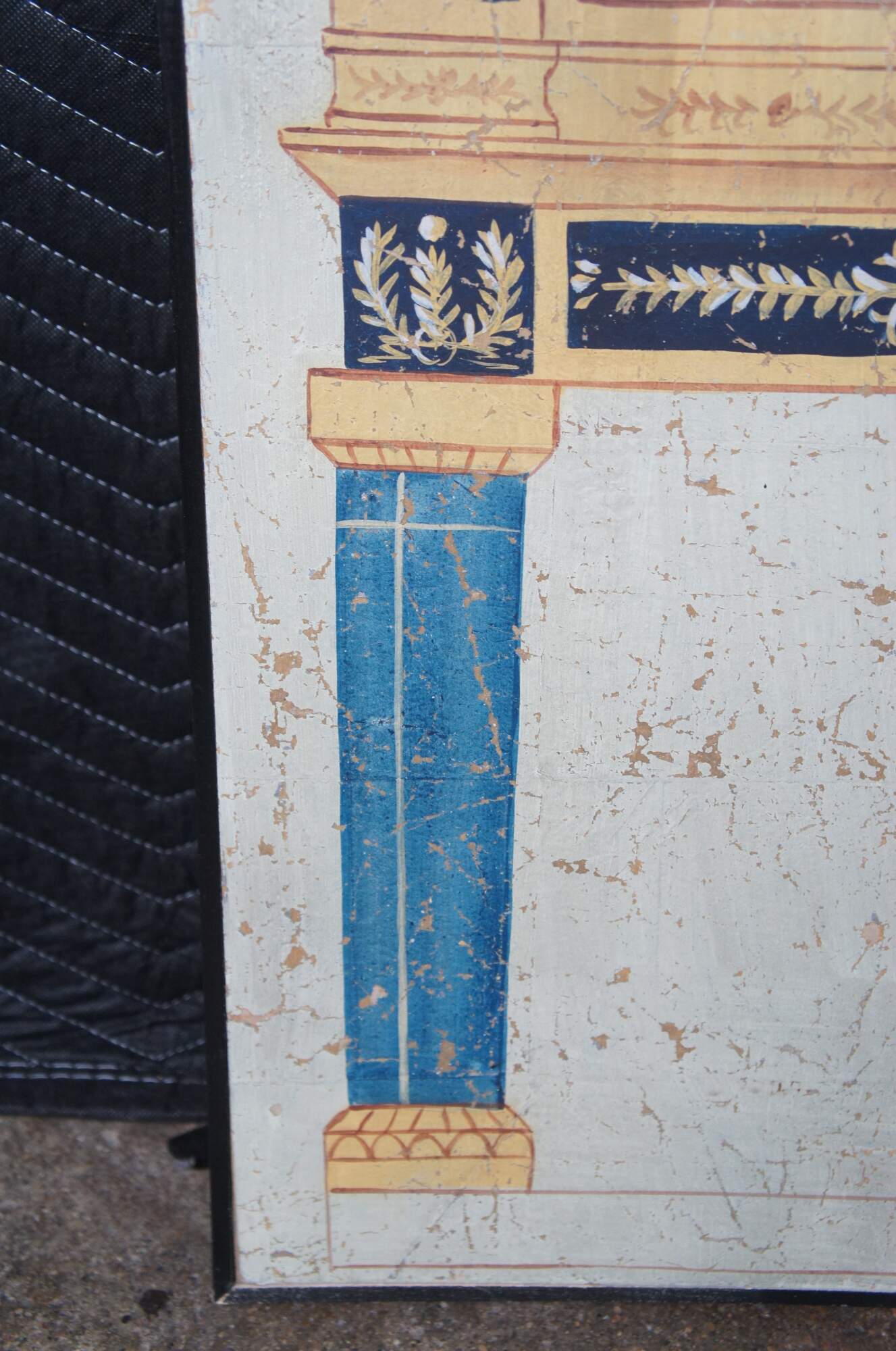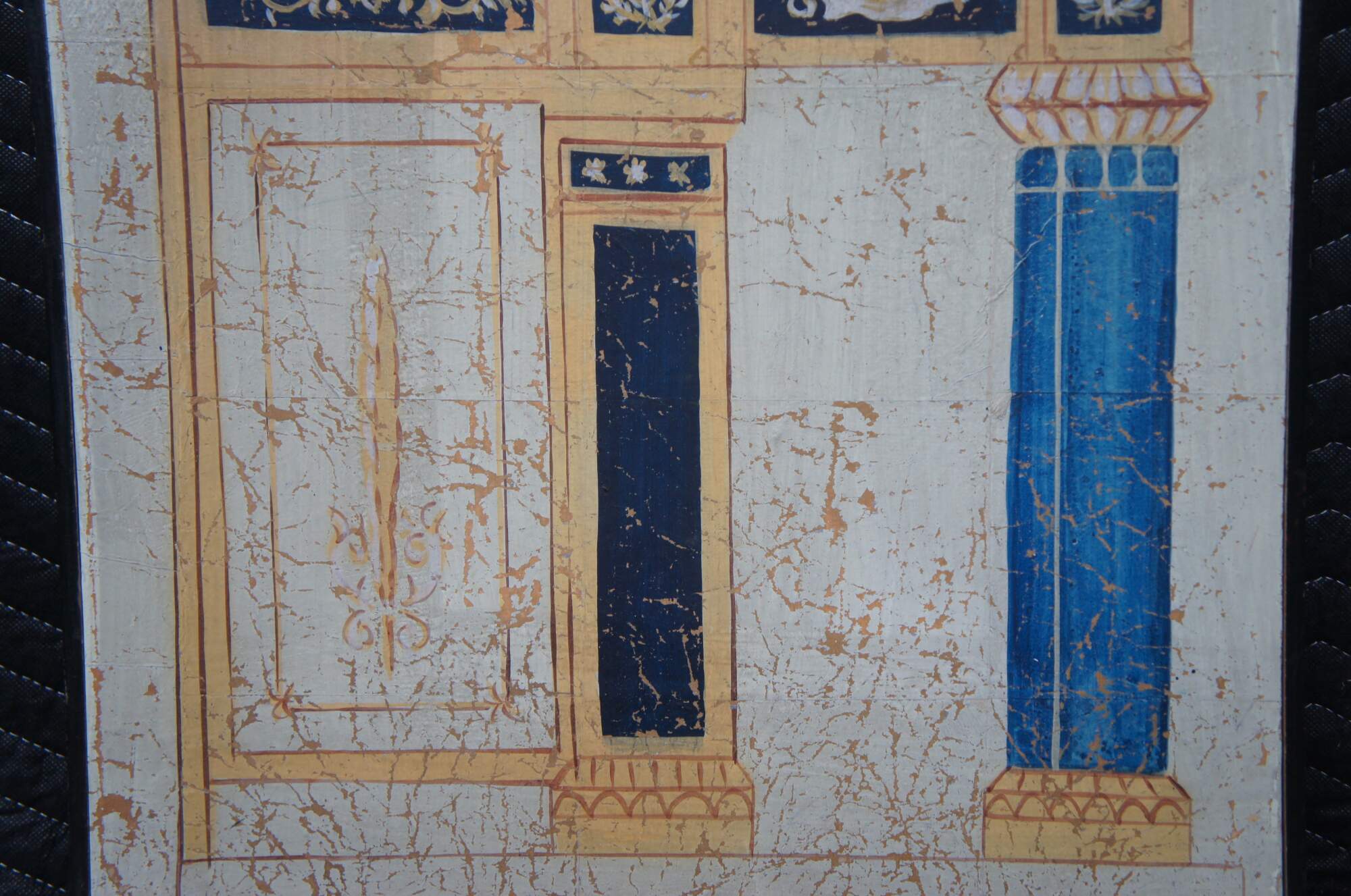 2 Wall hanging Neoclassical Archictural panels, circa last quarter 20th century. Depicting the interior walls of a temple or residence of royalty. Each is painted on board with a metal clip along the back for hanging display