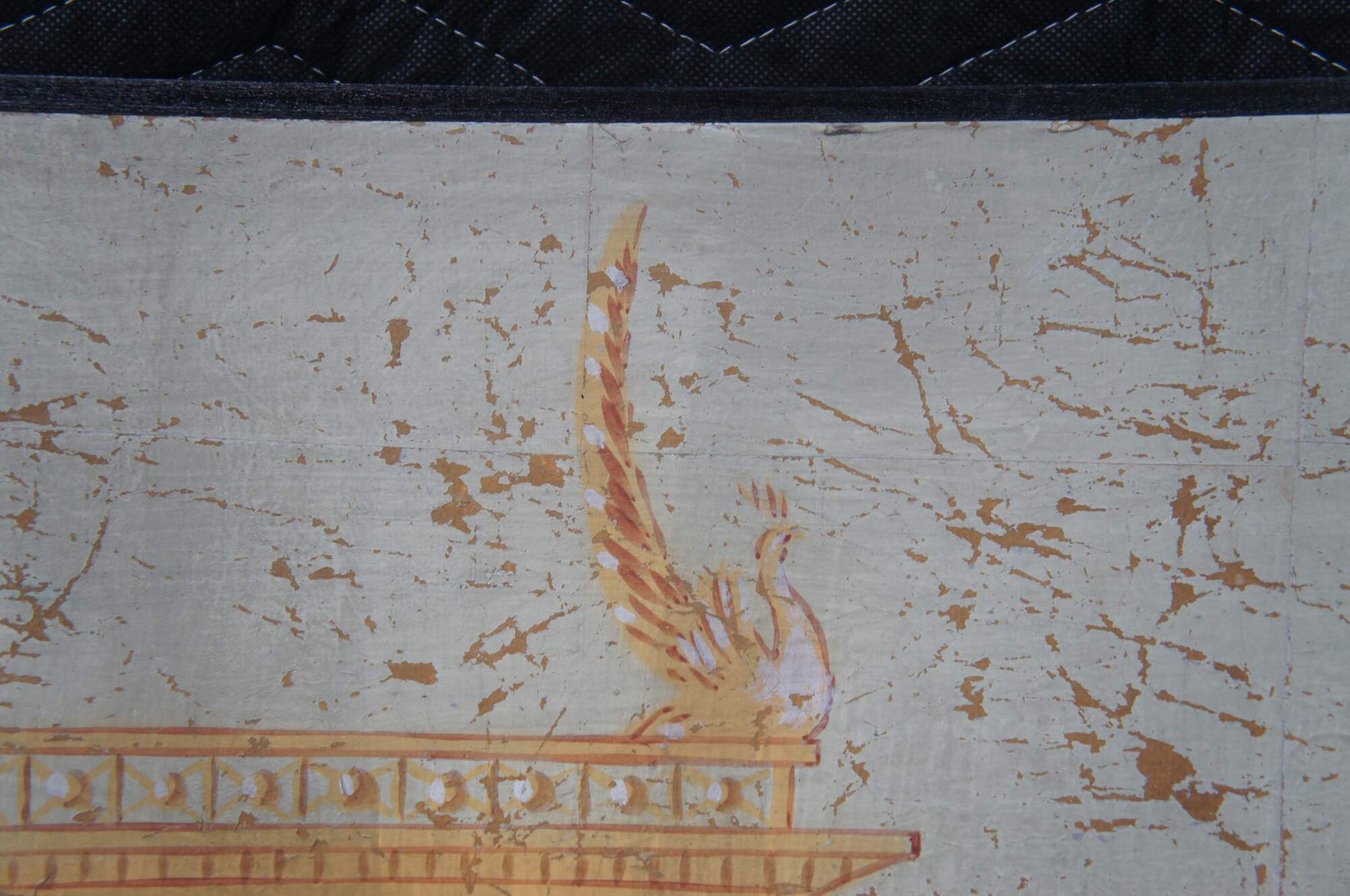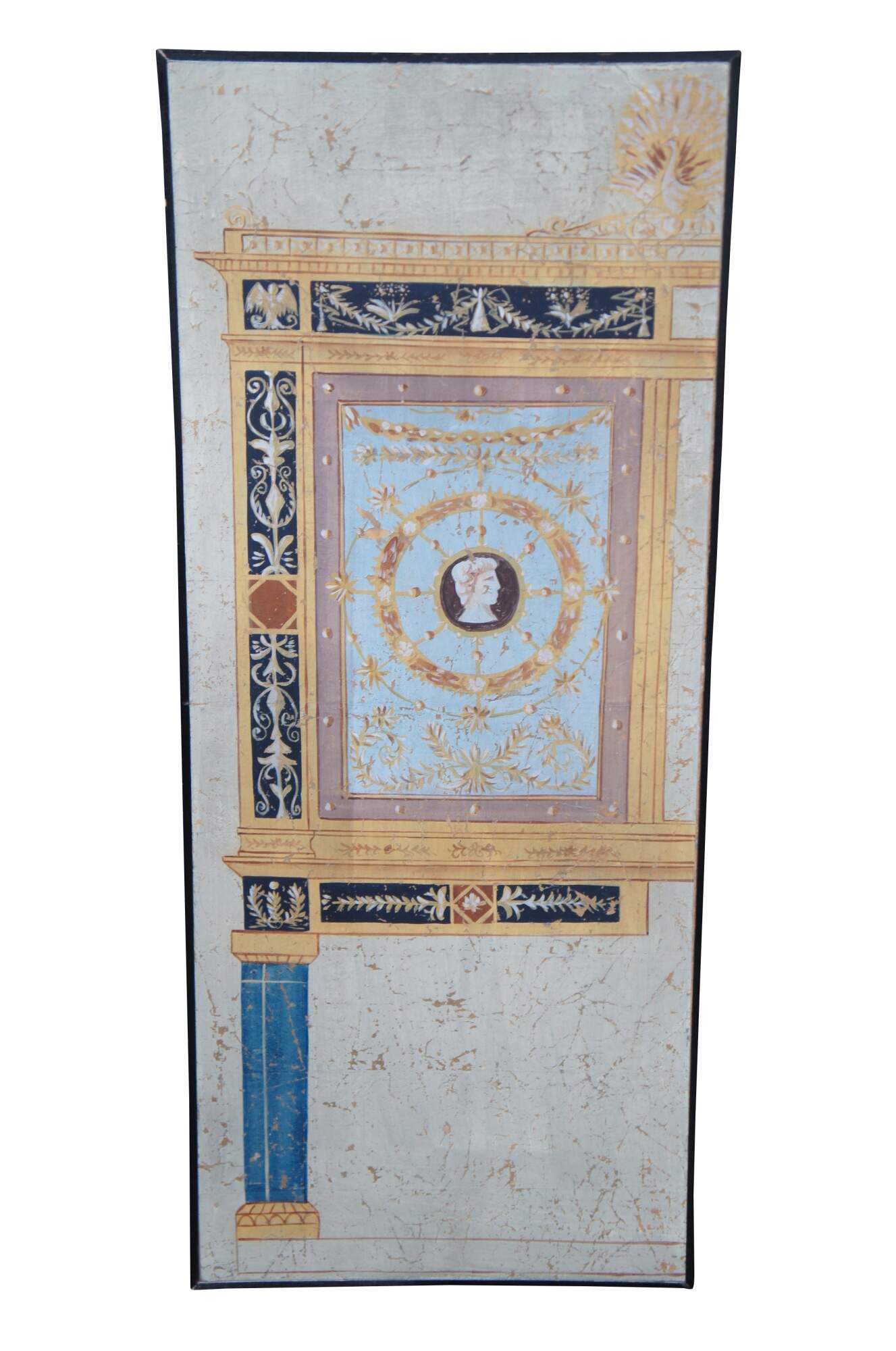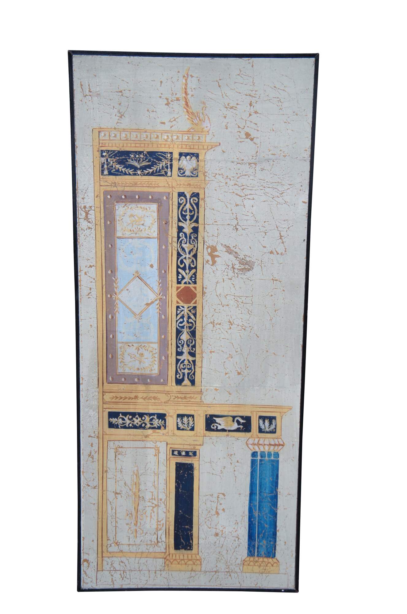 2 Wall hanging Neoclassical Archictural panels, circa last quarter 20th century. Depicting the interior walls of a temple or residence of royalty. Each is painted on board with a metal clip along the back for hanging display