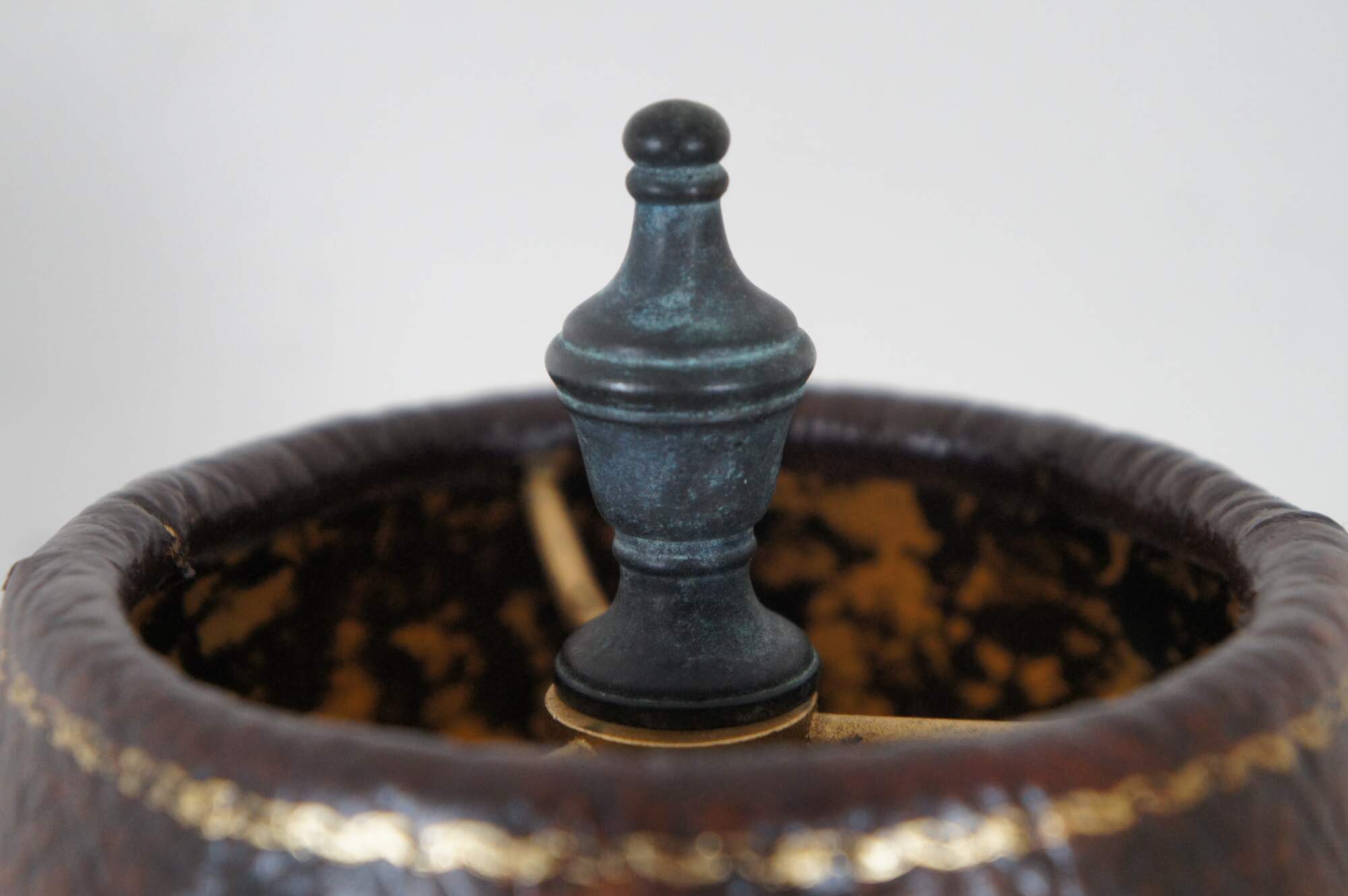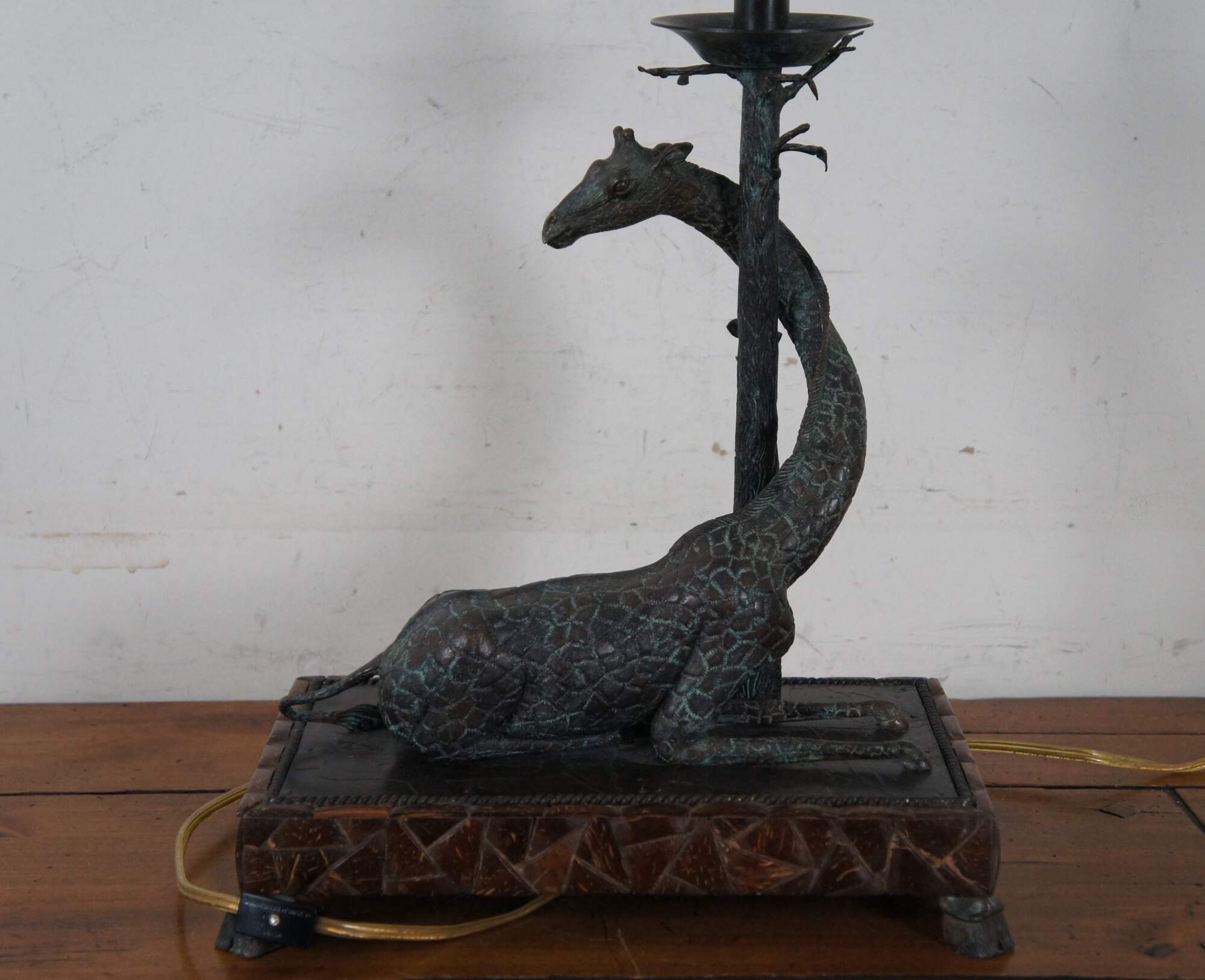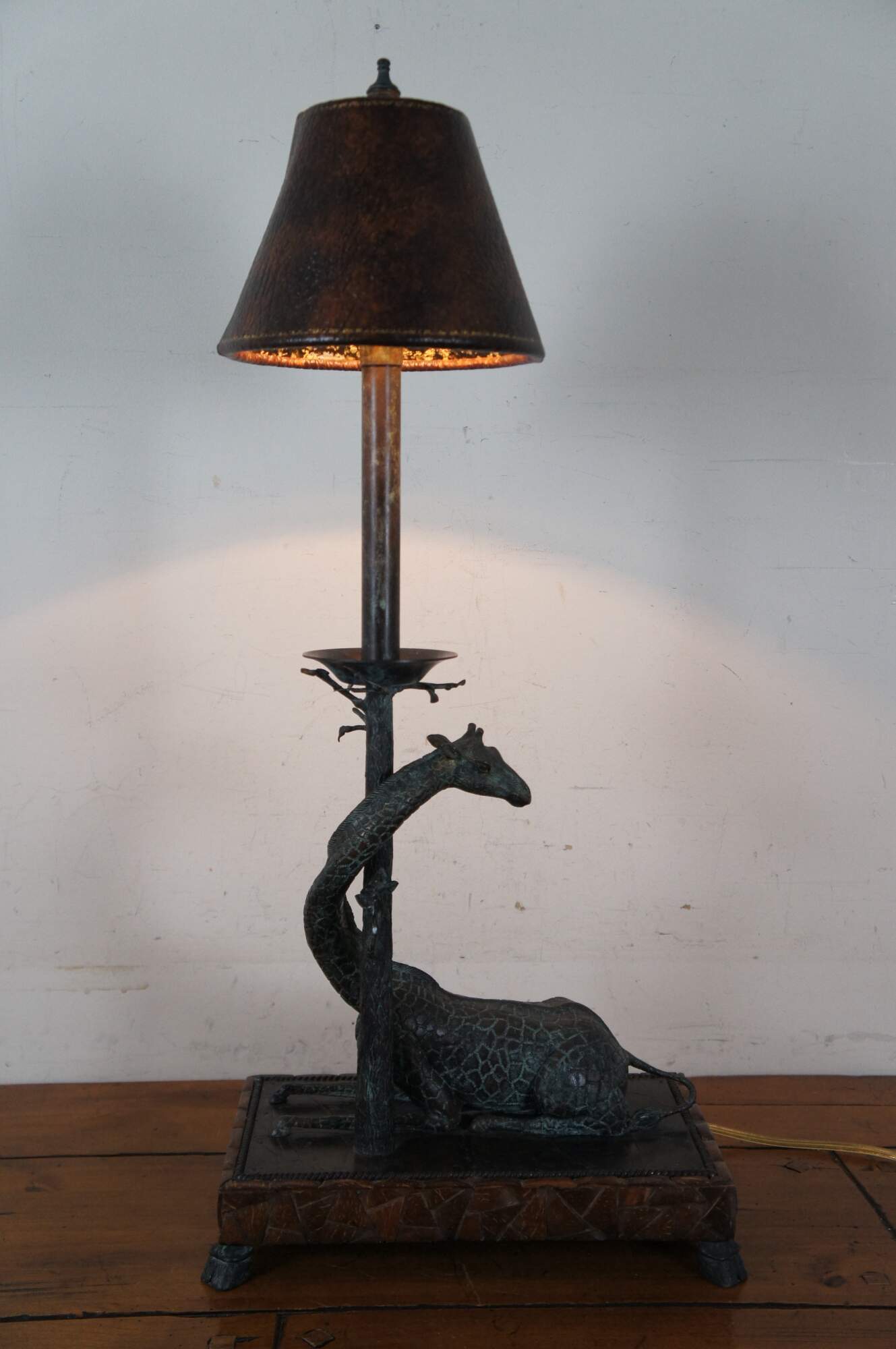 Maitland Smith table lamp, made of bronze with factory distressed patina / verdigris. Rectangular base supported by hoof feet, decorated with a coconut shell mosaic echoing the pattern of giraffe hide. On the base lays a reclining giraffe with its neck curled around the base of a tree, which becomes a candlestick topped with an urn shaped finial. Includes brown pebbled leather shade. Marked 143 on base. Hand Made in the Philippines.