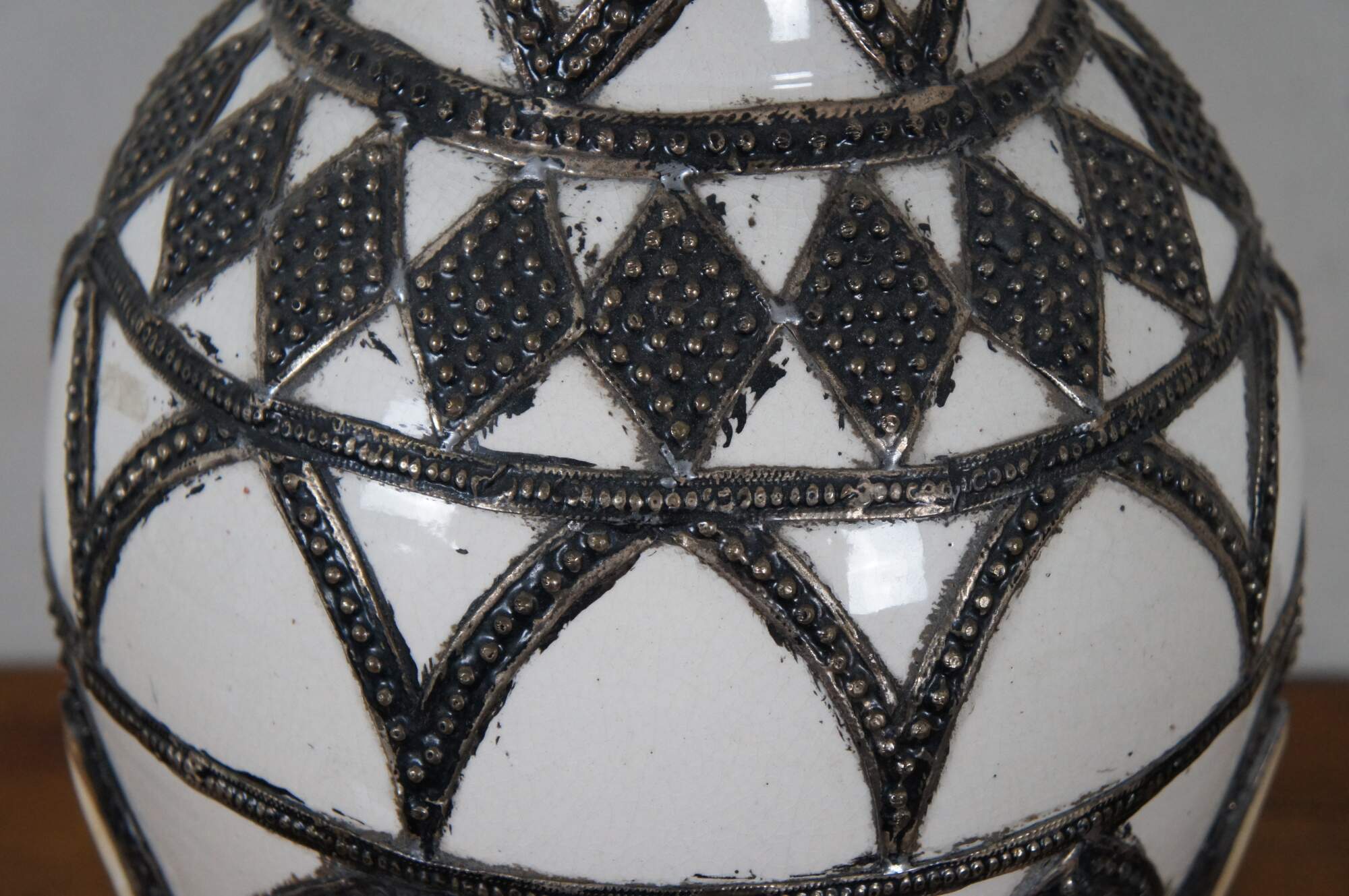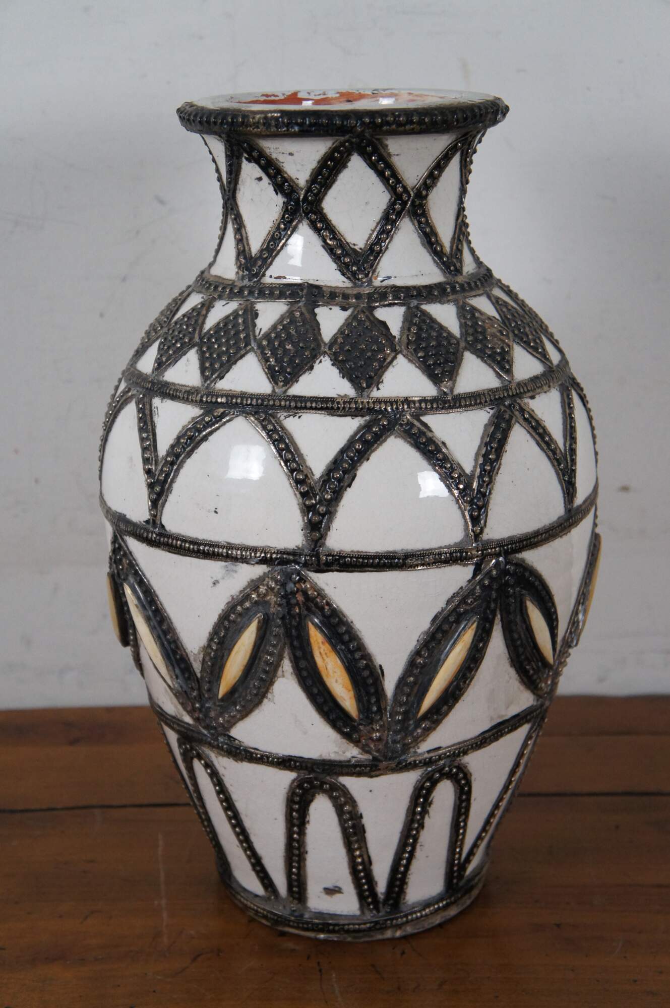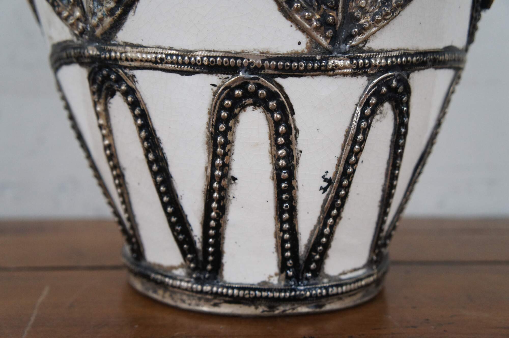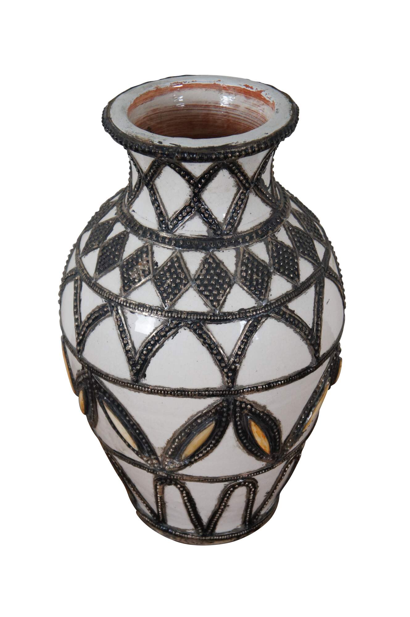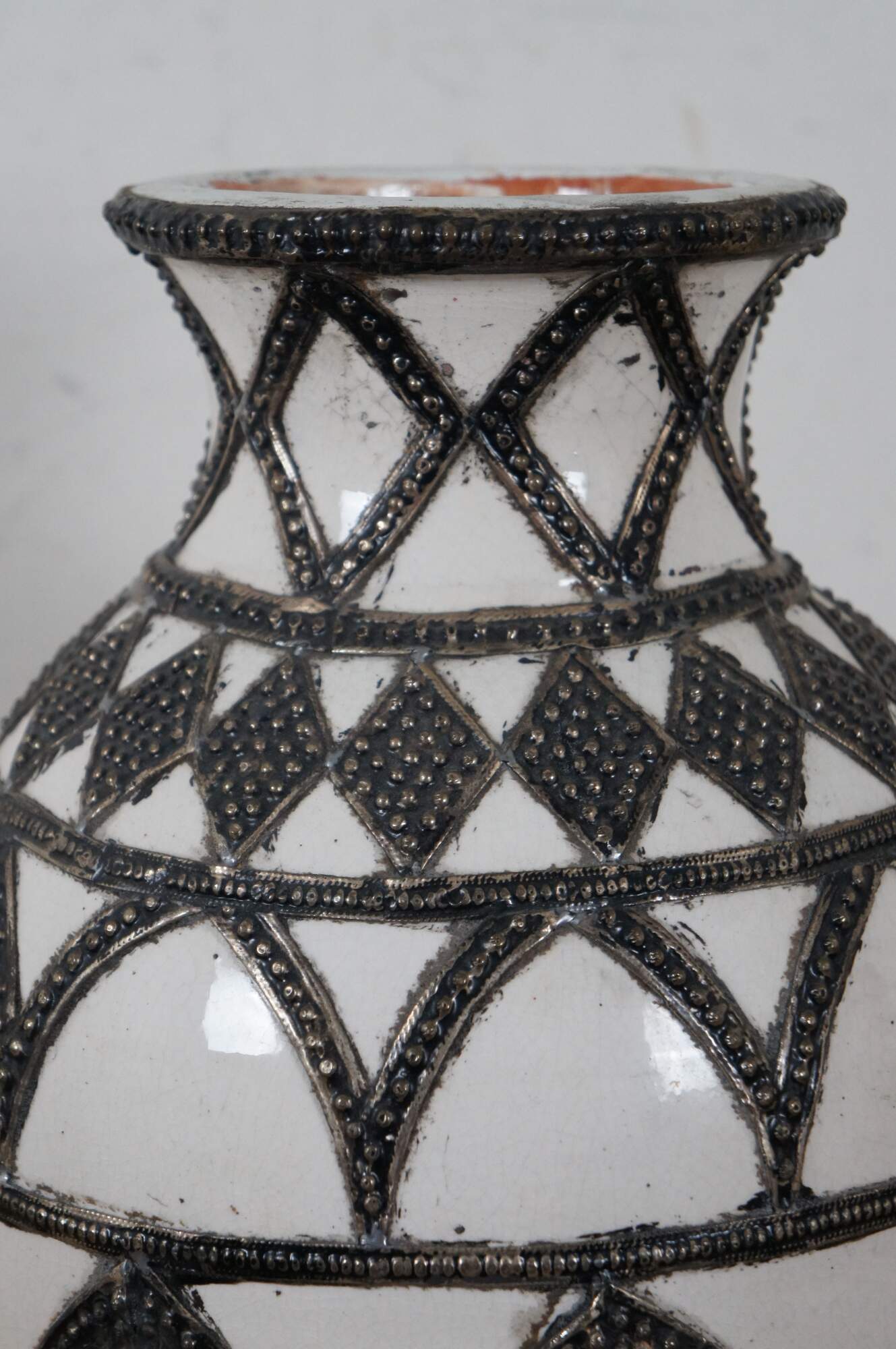 A large and impressive Moroccan ceramic vase, glazed in white with a variety of geometric inlaid studded nickel-silver designs.