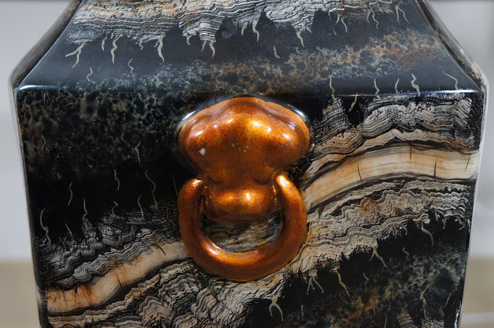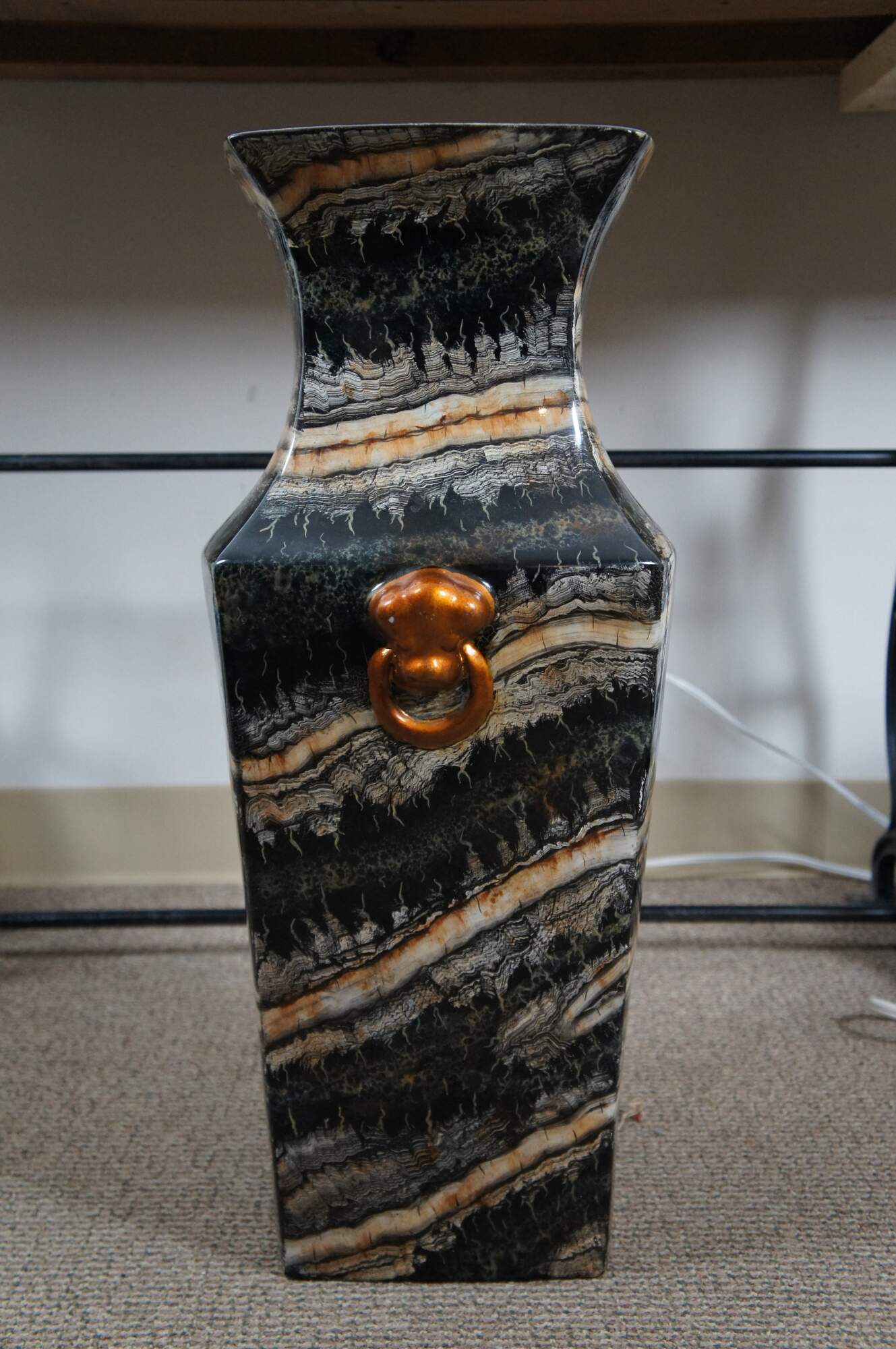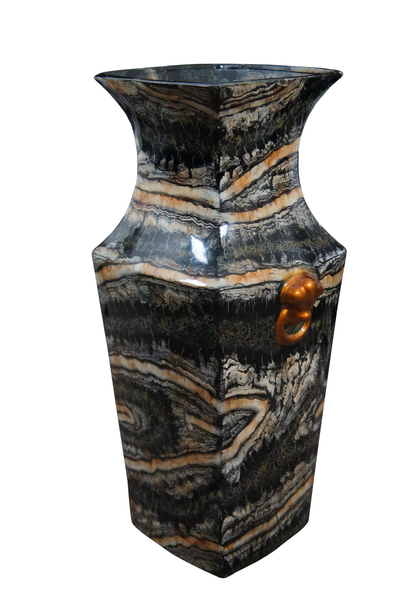 Late 20th century Maitland Smith floor vase featuring a traditional chinese famille form squared off vase shape and faux scallop shell knocker with ring handles, painted in copper. Made of porcelain / ceramic with a lacquered / enameled surface in black, cream and copper resembling marble. Marked on base with number 106. Hand written sticker marked 2185-888. Hand Made in the Philippines.