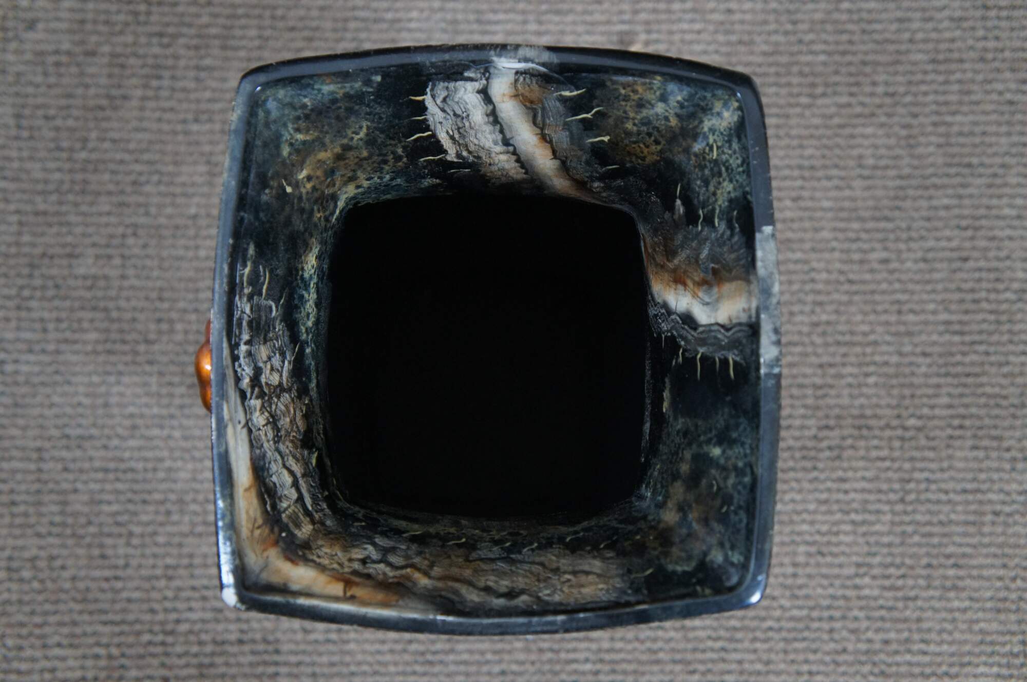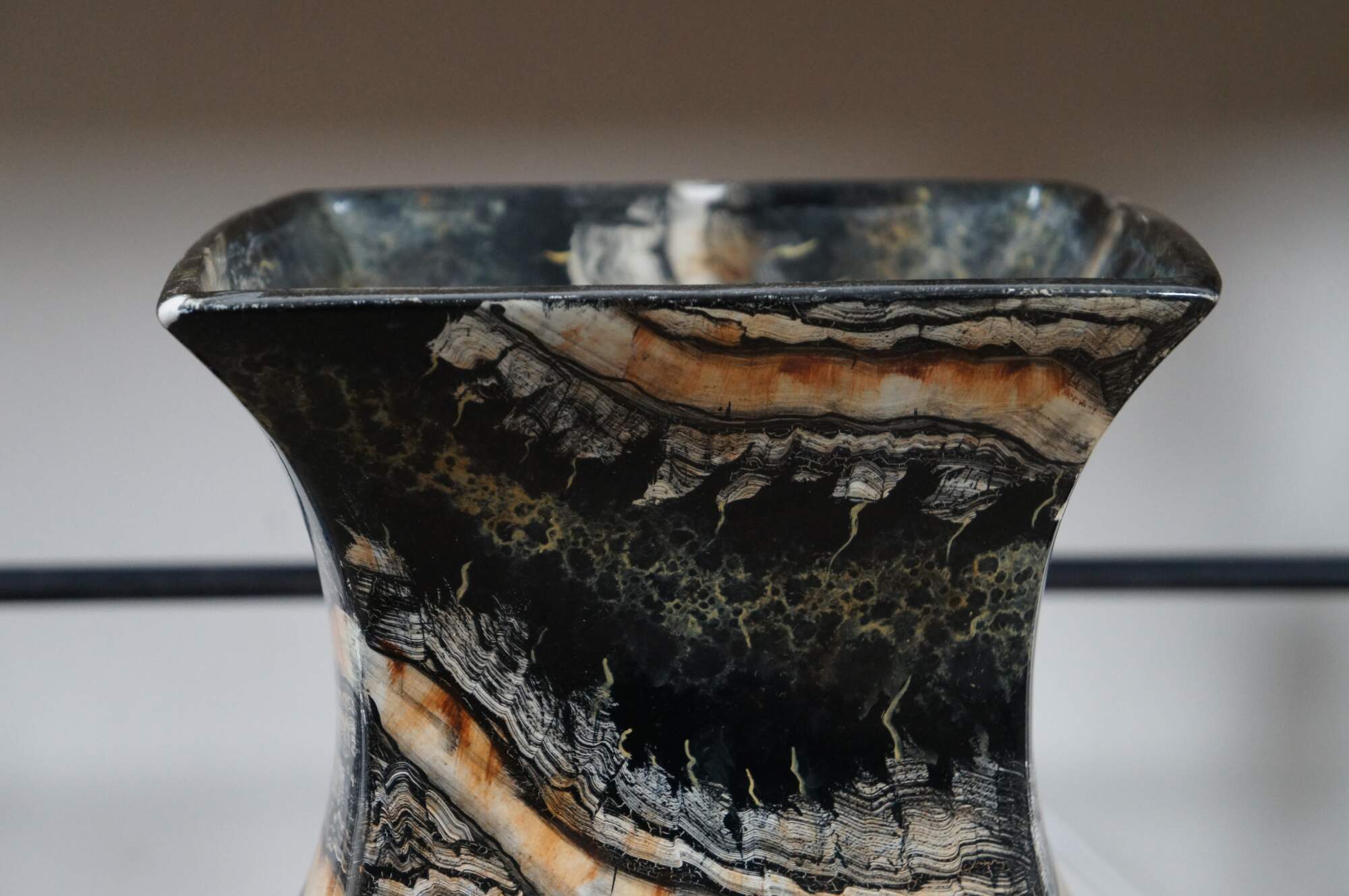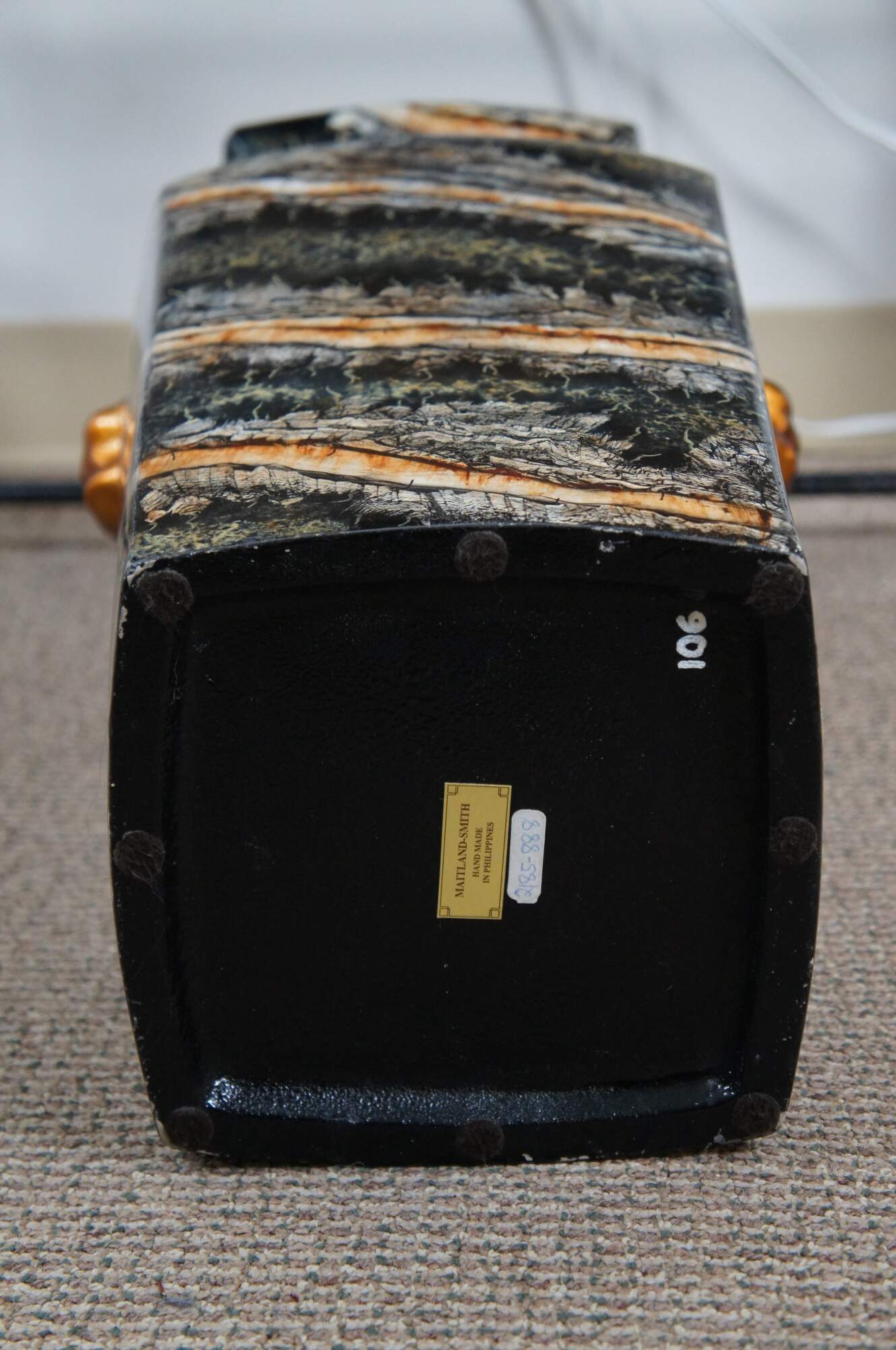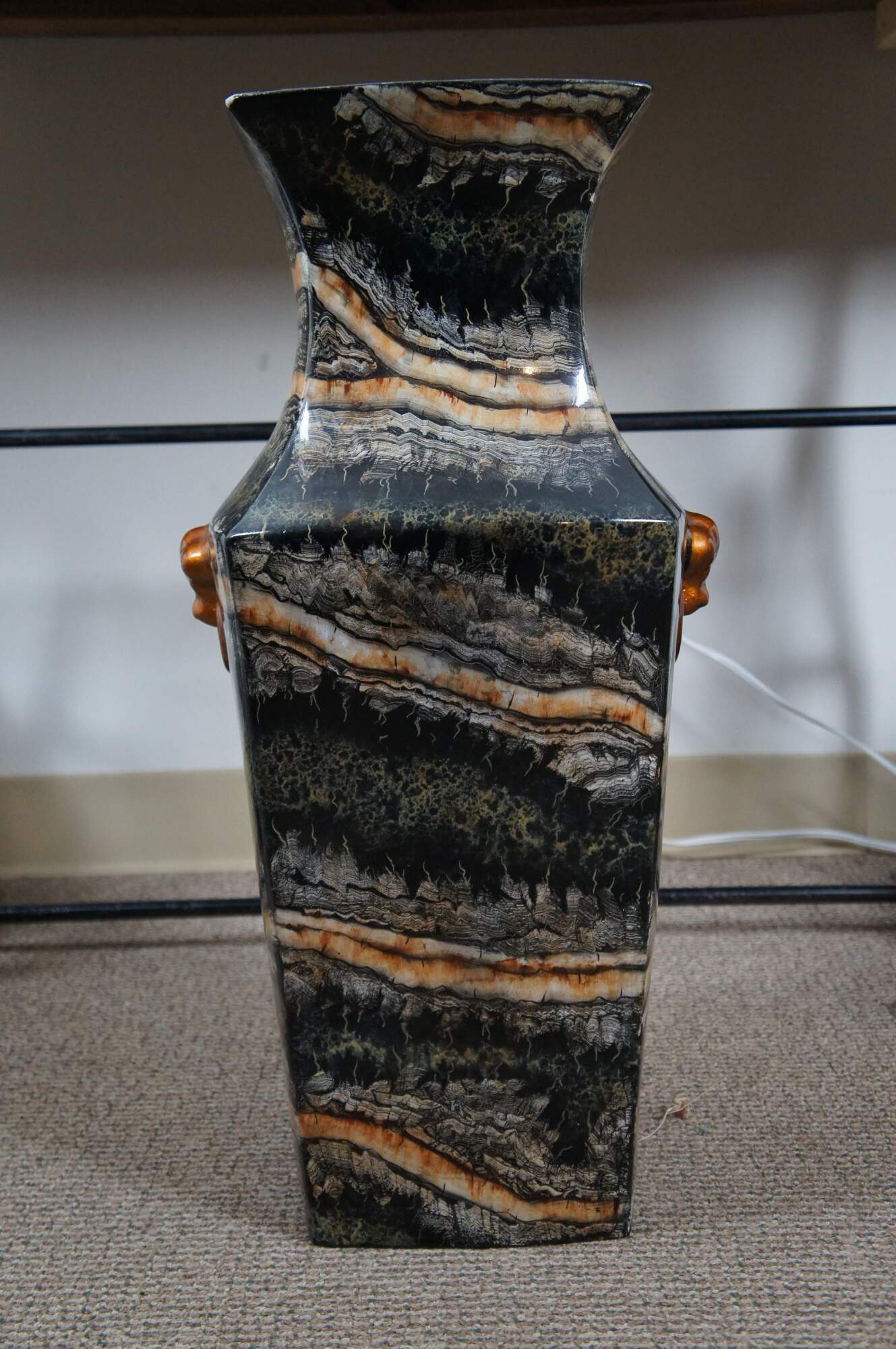 Late 20th century Maitland Smith floor vase featuring a traditional chinese famille form squared off vase shape and faux scallop shell knocker with ring handles, painted in copper. Made of porcelain / ceramic with a lacquered / enameled surface in black, cream and copper resembling marble. Marked on base with number 106. Hand written sticker marked 2185-888. Hand Made in the Philippines.