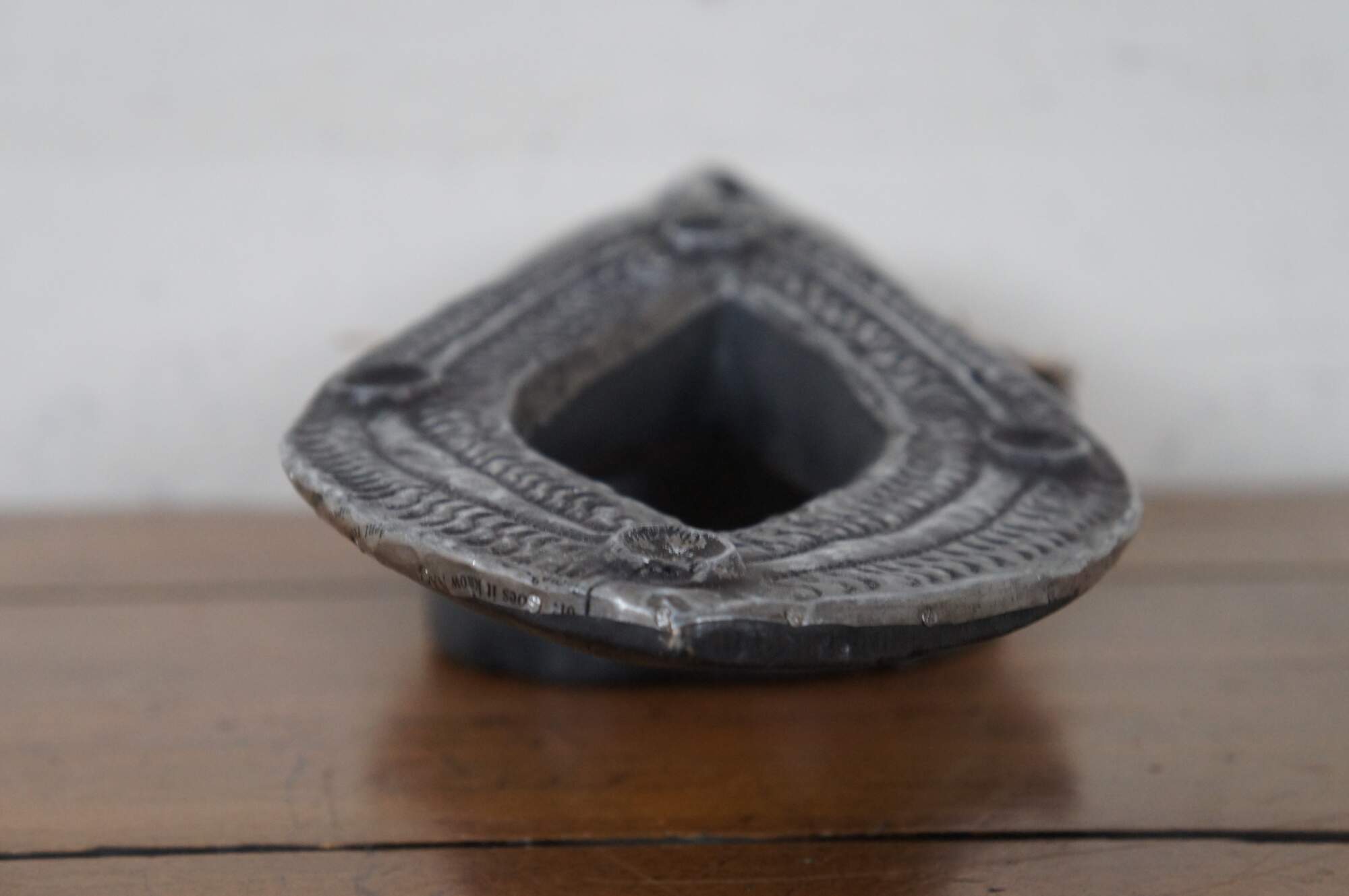 Late 20th century African tribal / folk art hand carved dark wood mask, featuring a gently smiling painted face with U-shaped beard trimmed with braided raffia and an open almond shaped headpiece overlaid with a hammered / embossed metal sheet. Line of text like newspaper print are partially visible on the metal. Leather strap for wall display on reverse.
