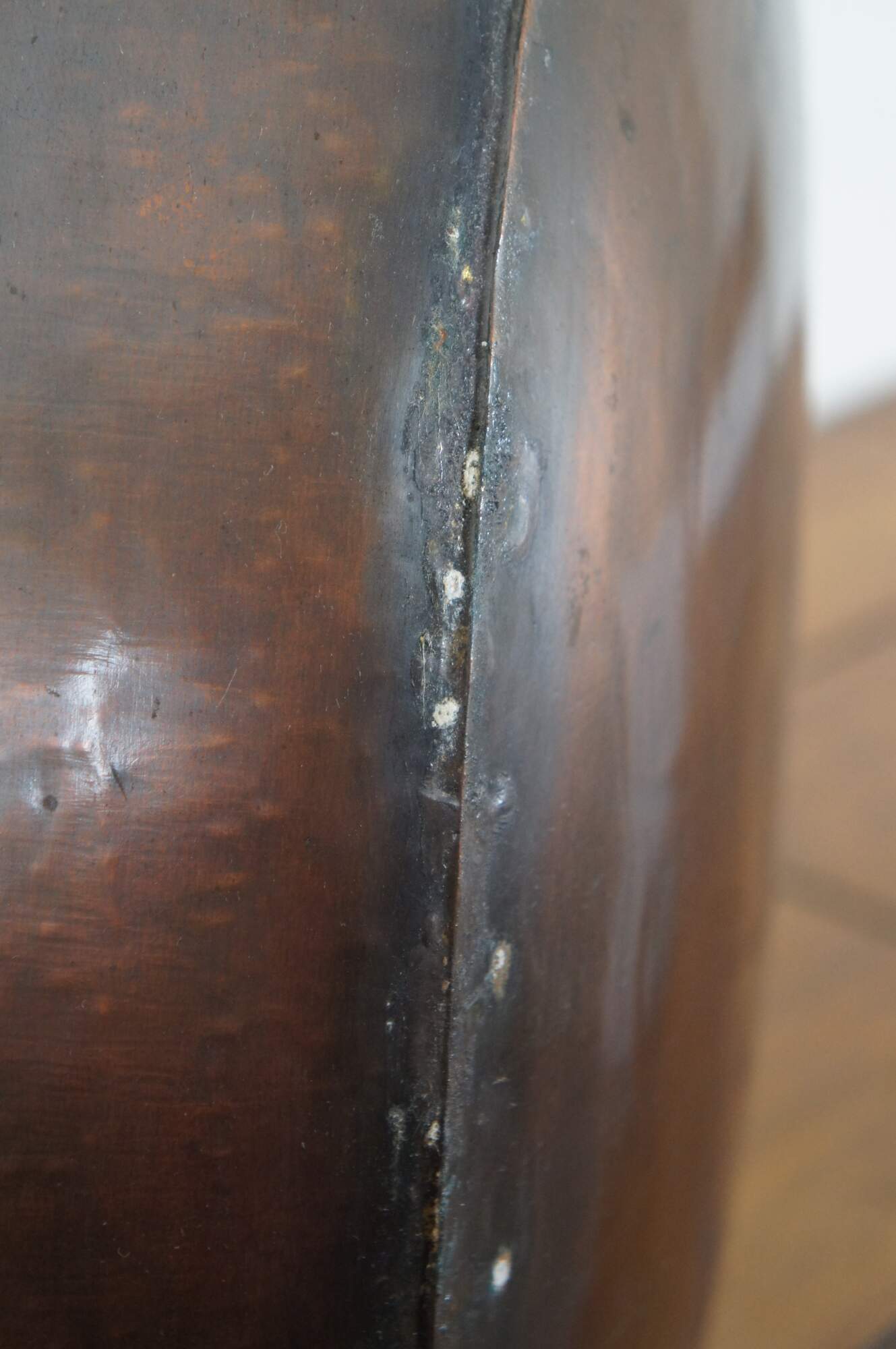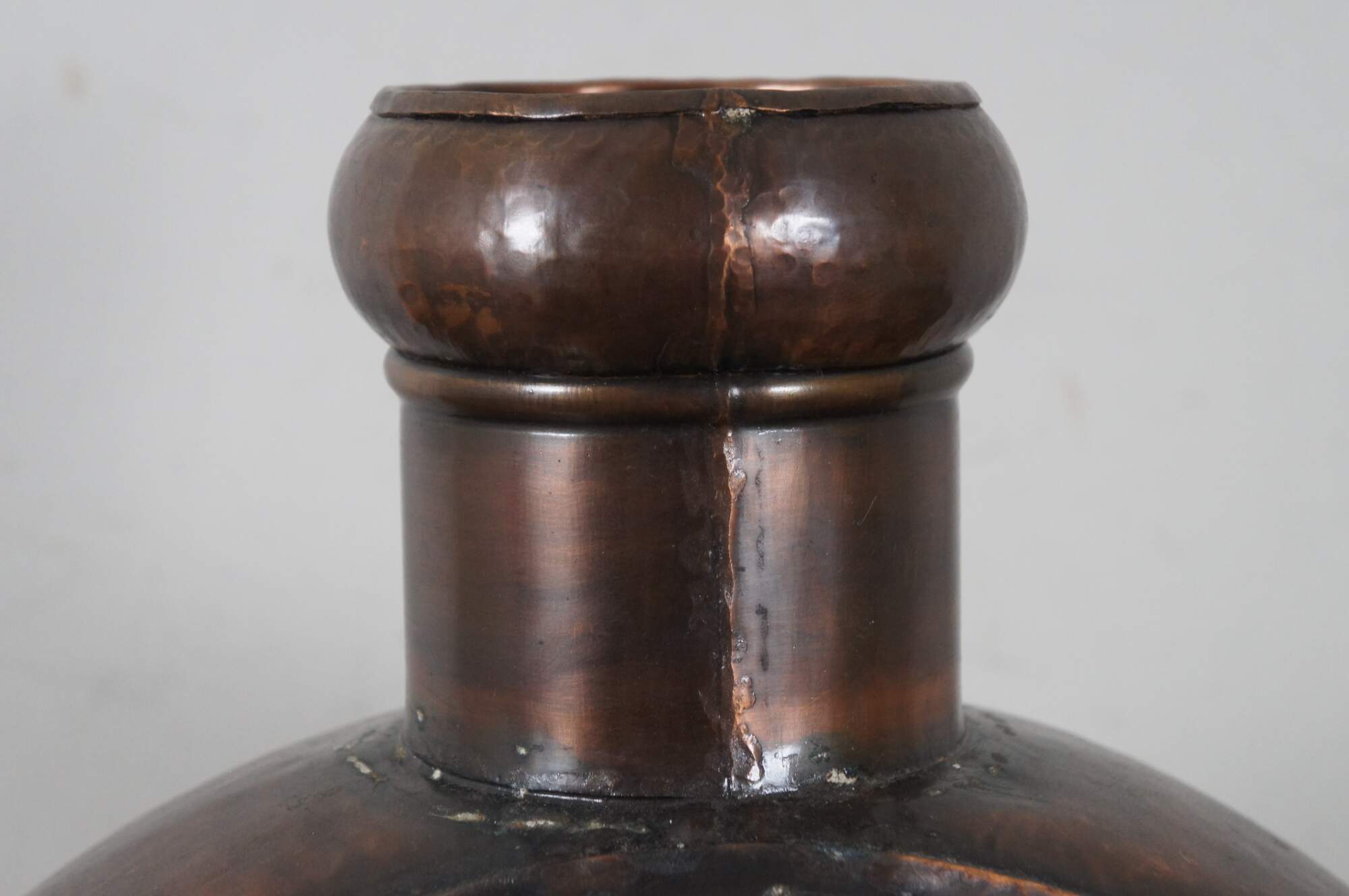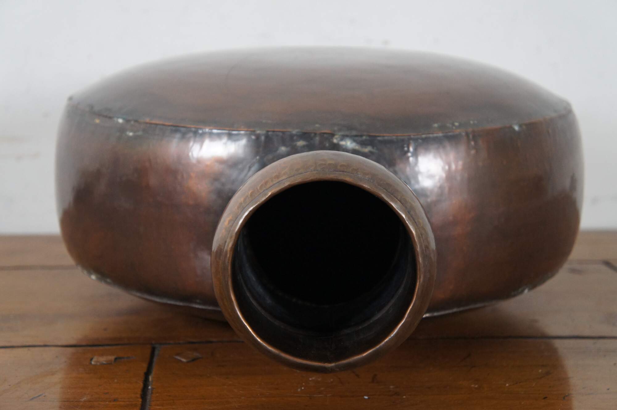 Vintage large scale copper flask / canteen with a round body and hammered rim. No stopper. No makers mark.