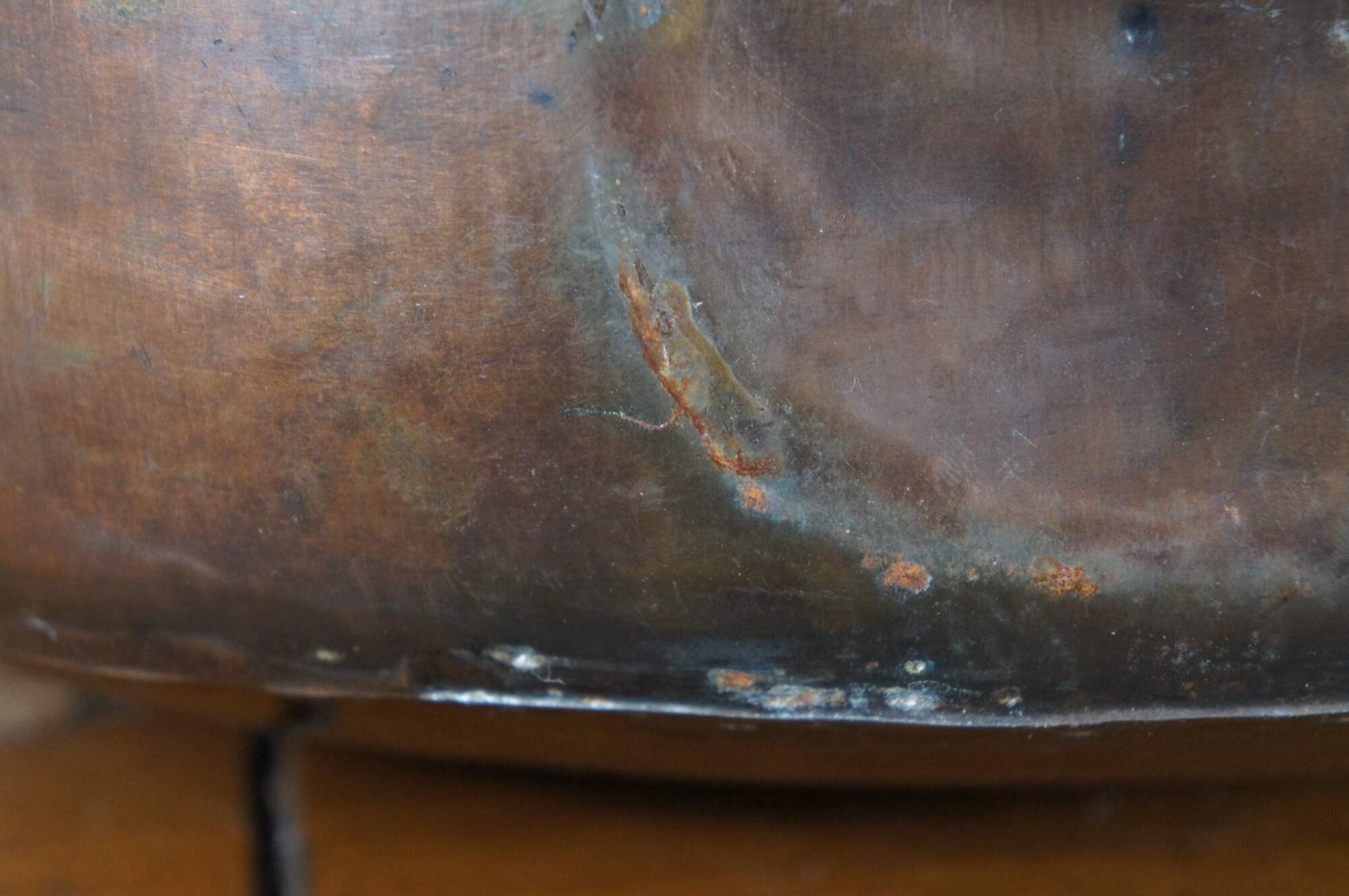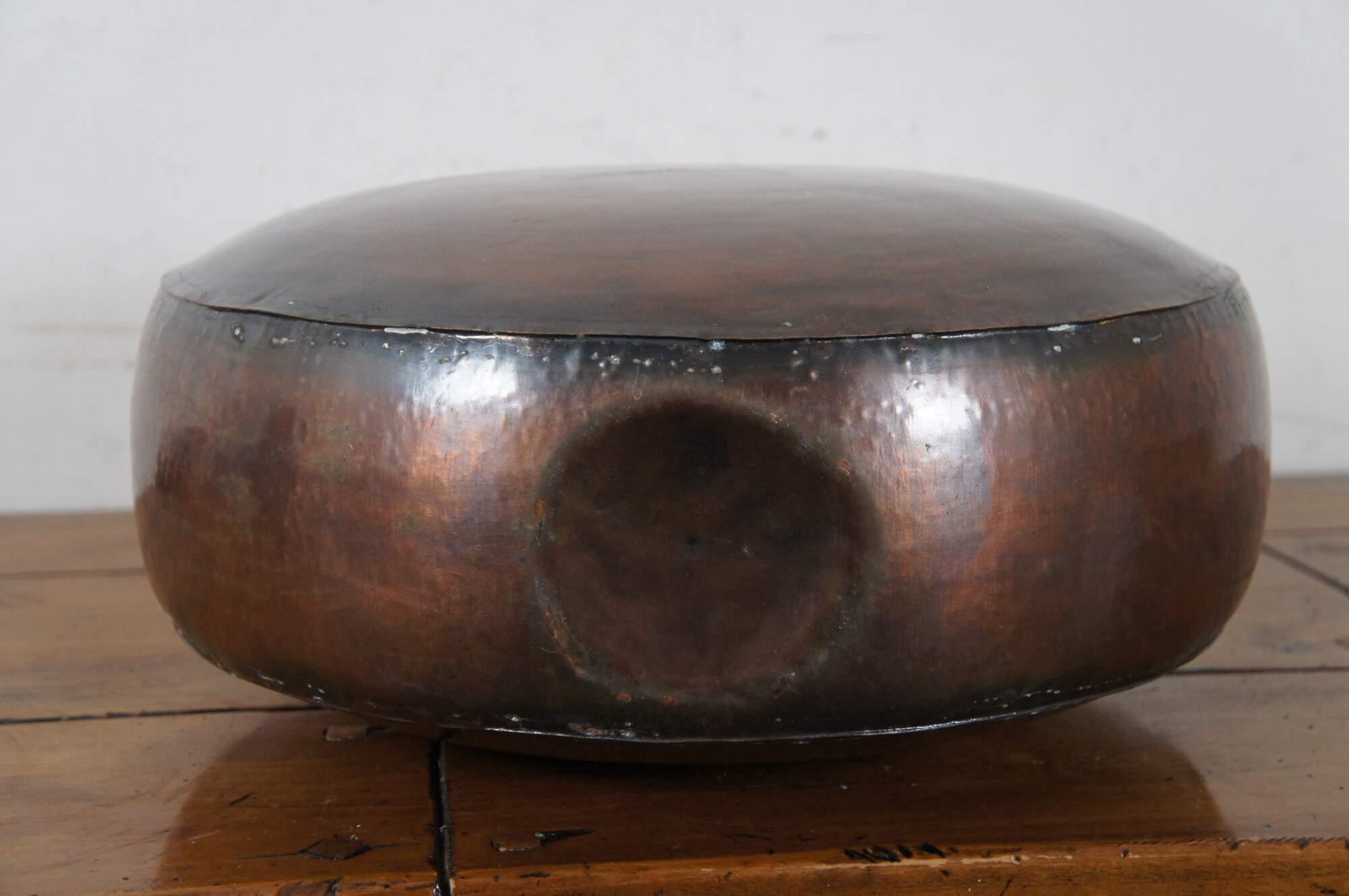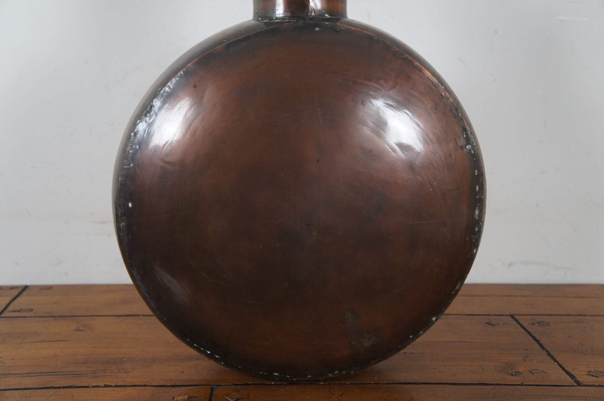 Vintage large scale copper flask / canteen with a round body and hammered rim. No stopper. No makers mark.
