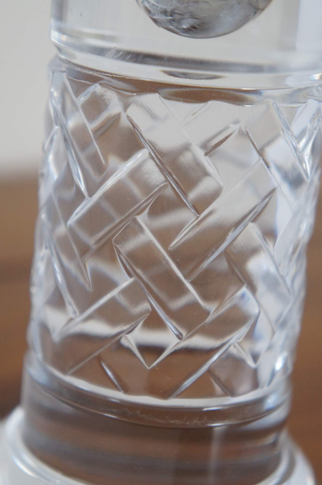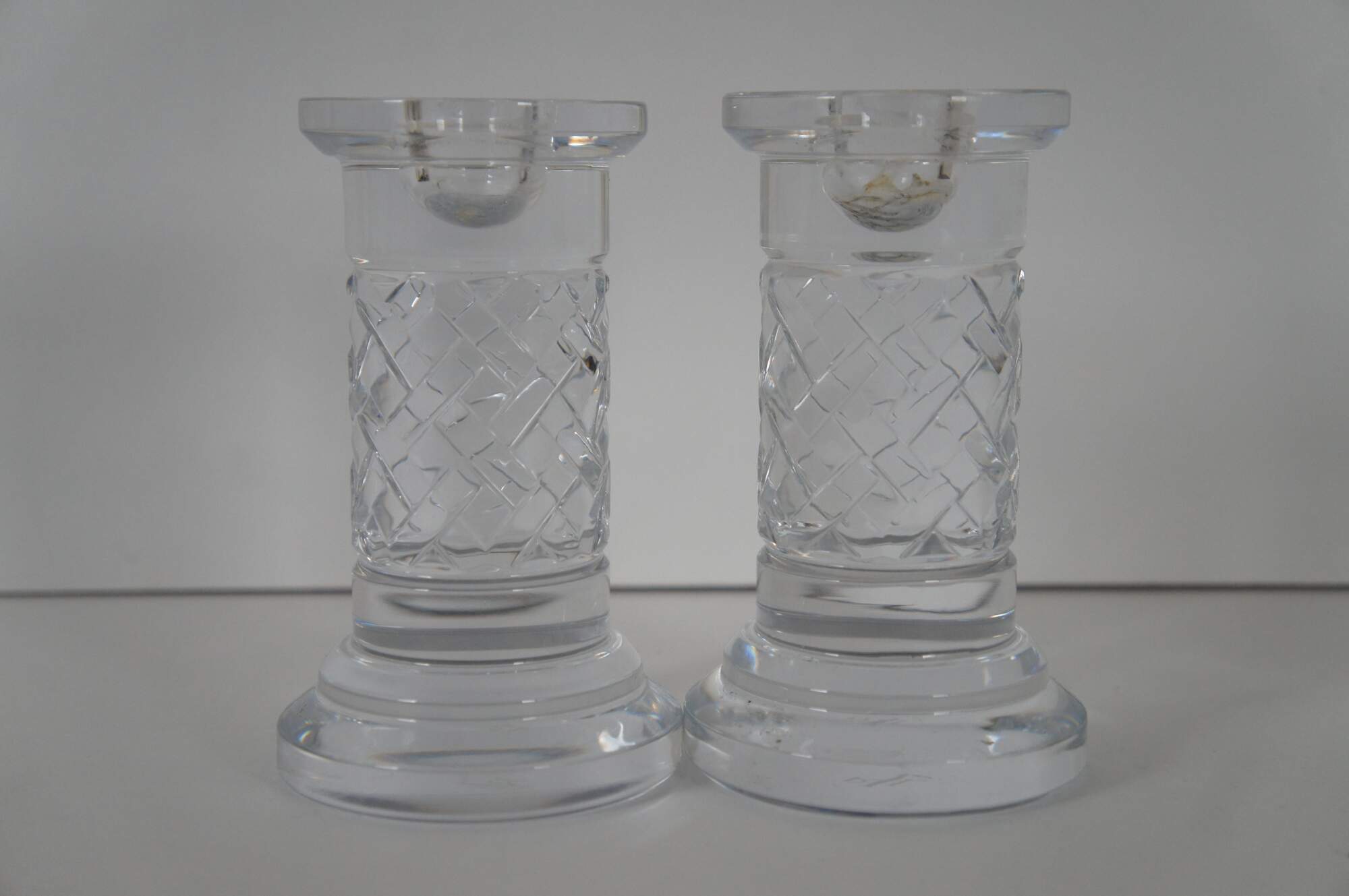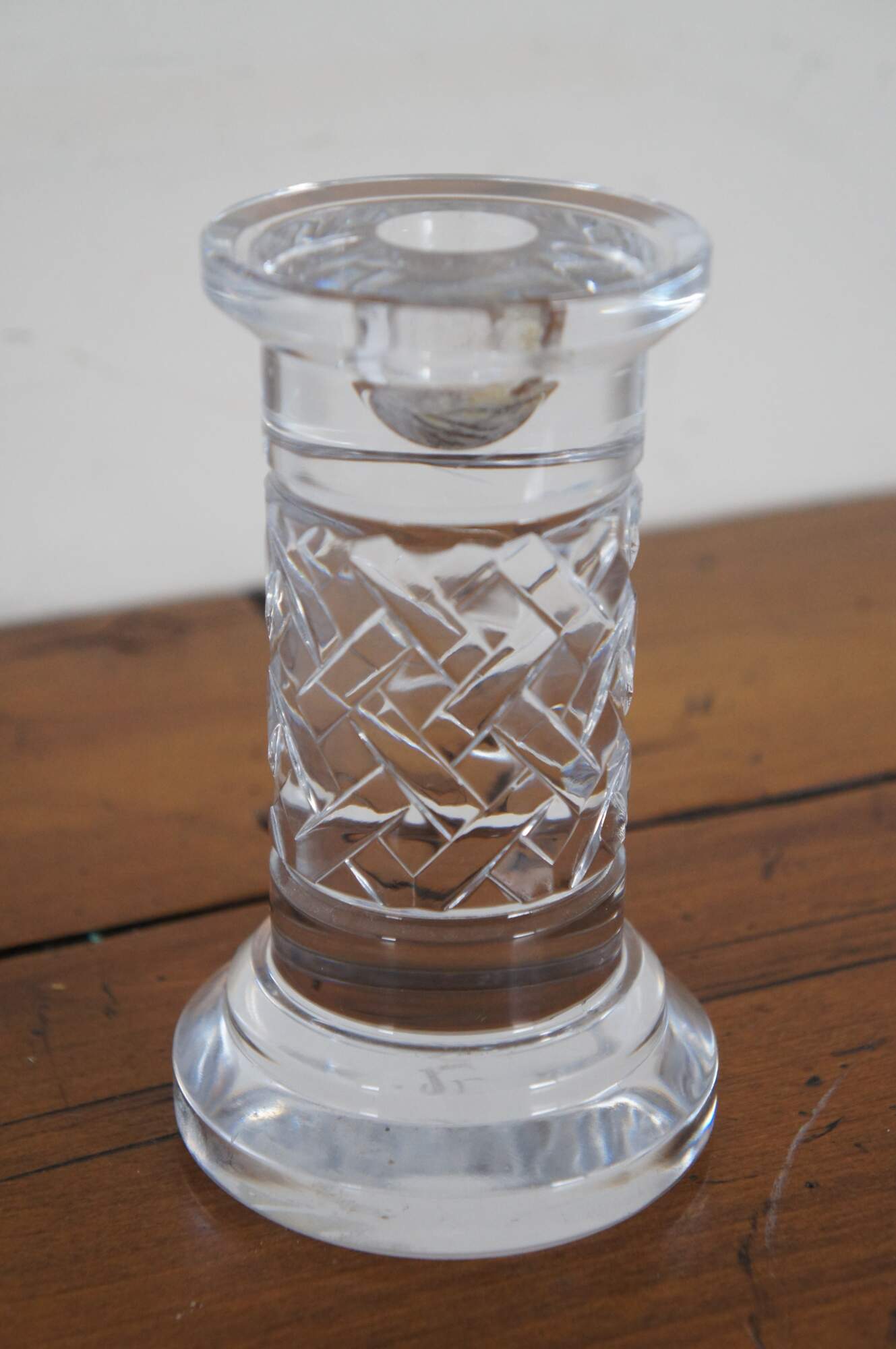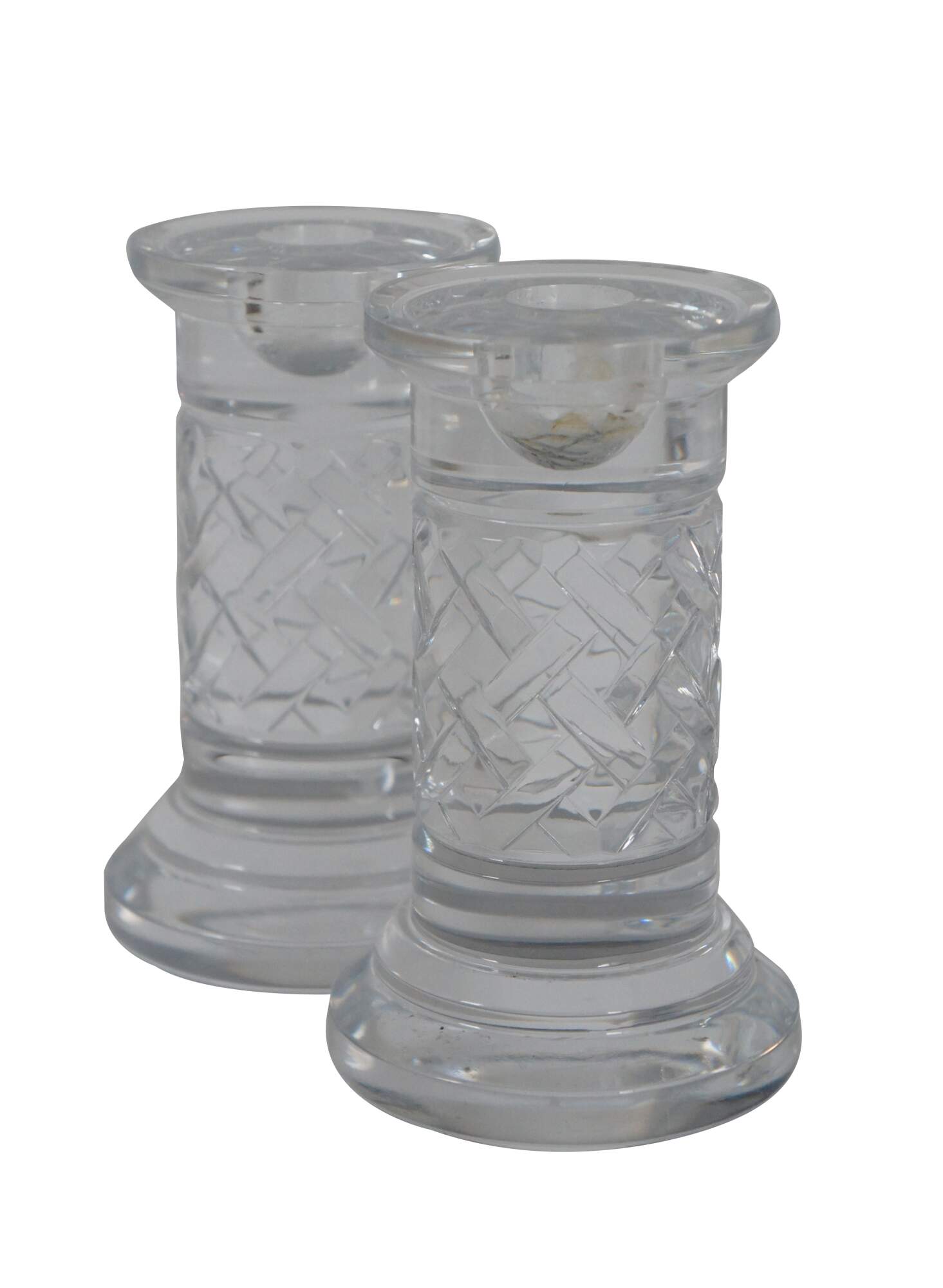 Vintage pair of Lauren Ralph Lauren crystal candlesticks / taper candle holders, featuring a round pillar / ionic column shape, accented at the middle with a lattice / basket weave texture.