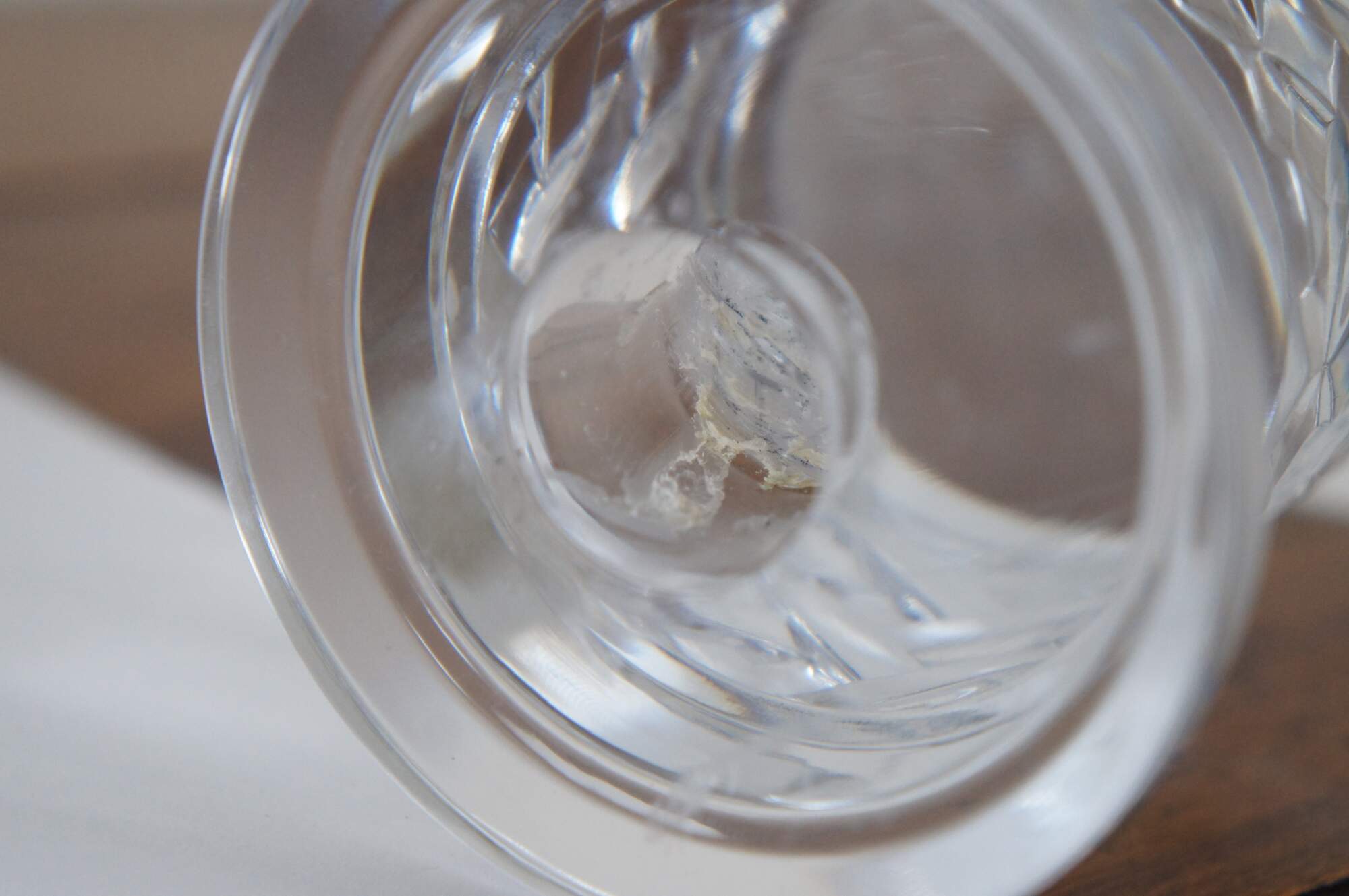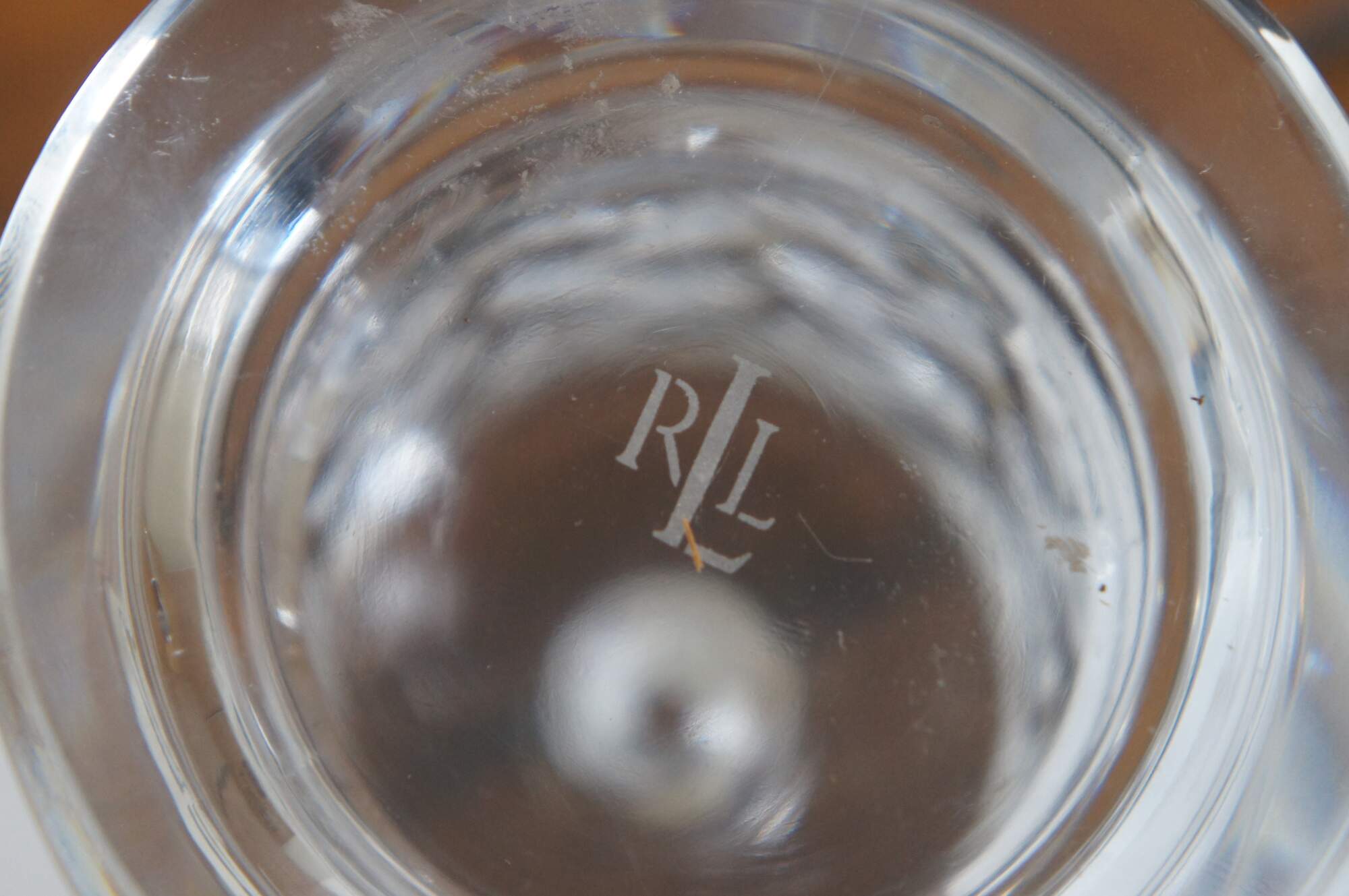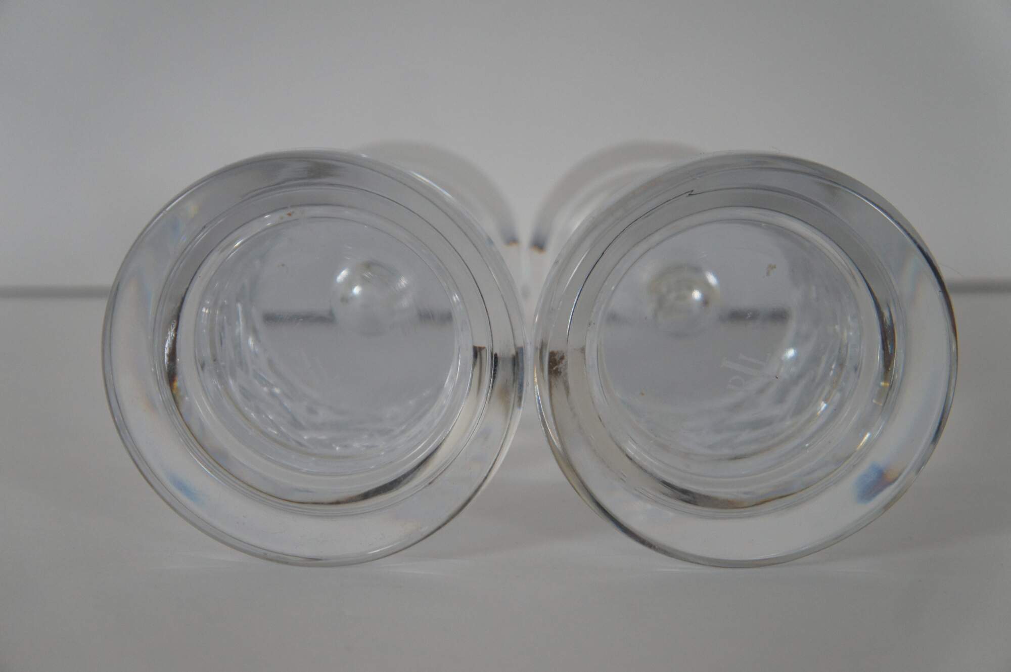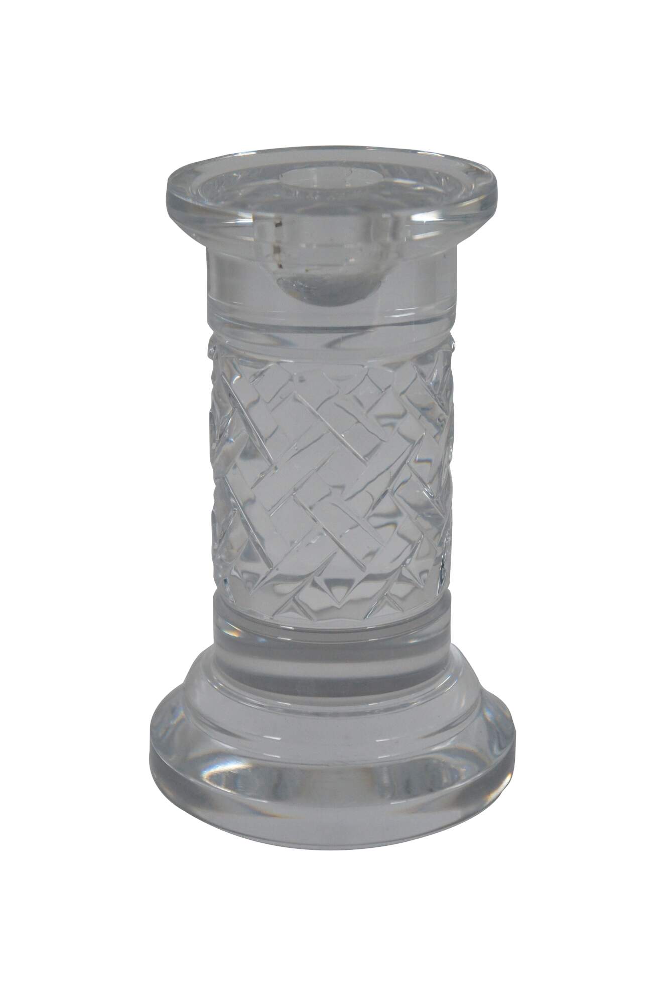 Vintage pair of Lauren Ralph Lauren crystal candlesticks / taper candle holders, featuring a round pillar / ionic column shape, accented at the middle with a lattice / basket weave texture.