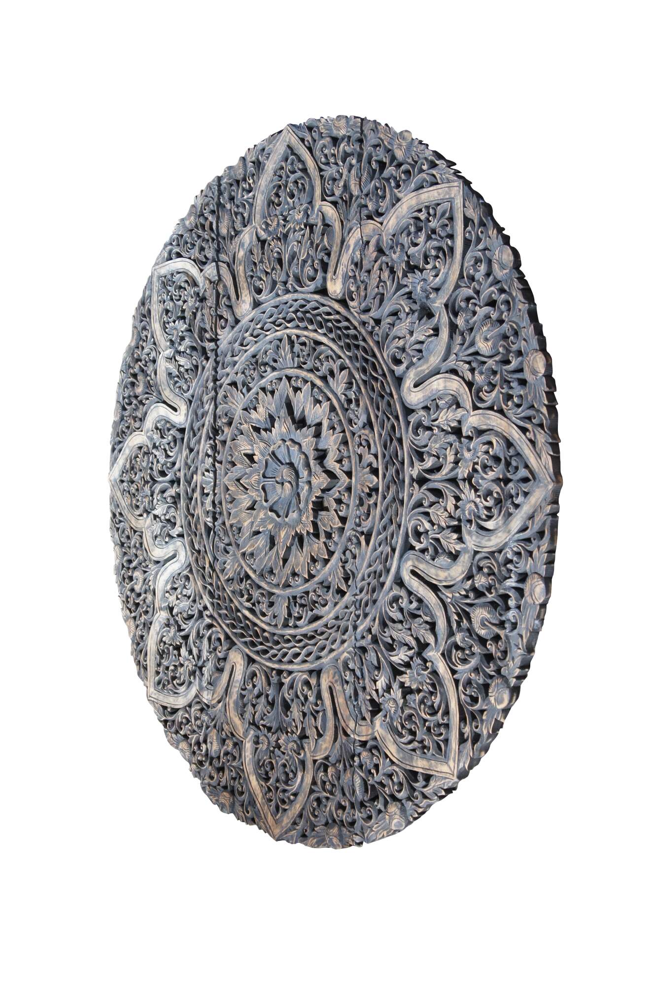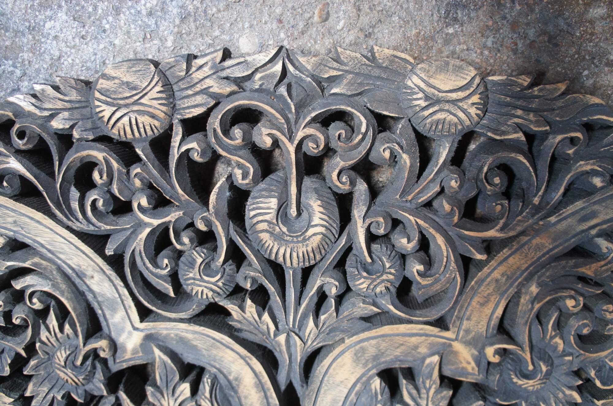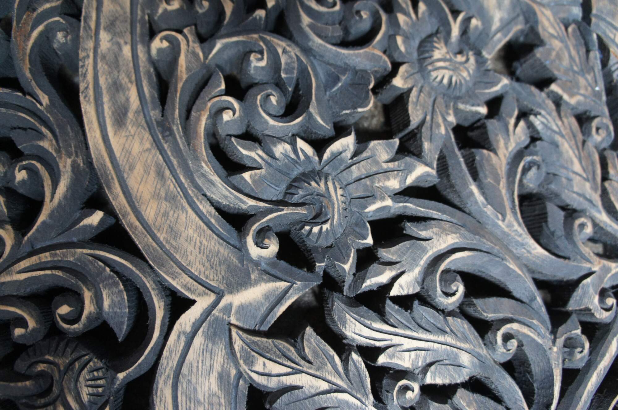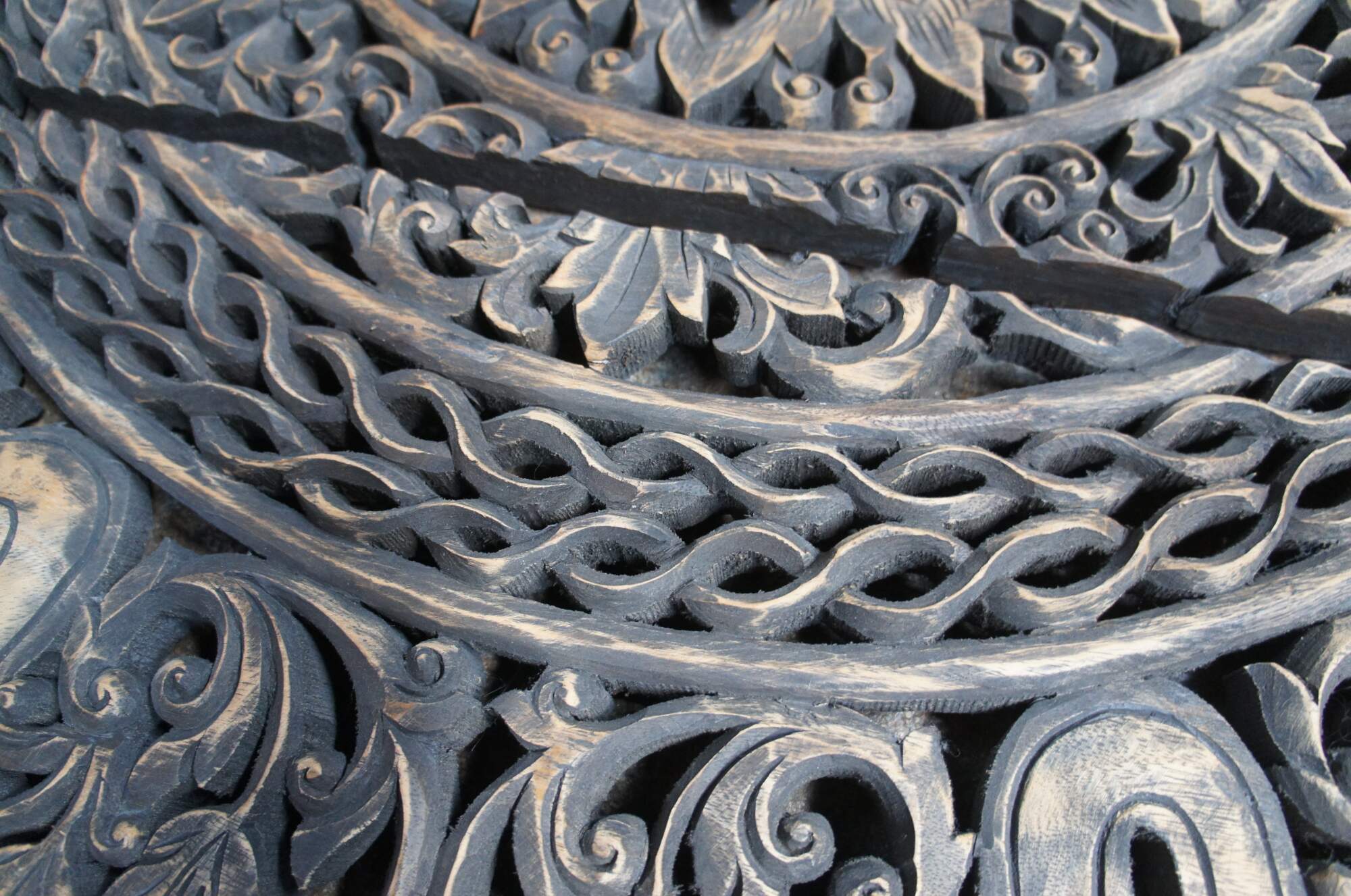Intricate 3 piece Lotus medallion teak carved wall plaques. Handmade in Thailand. Each section hangs via metal bracket along the back.