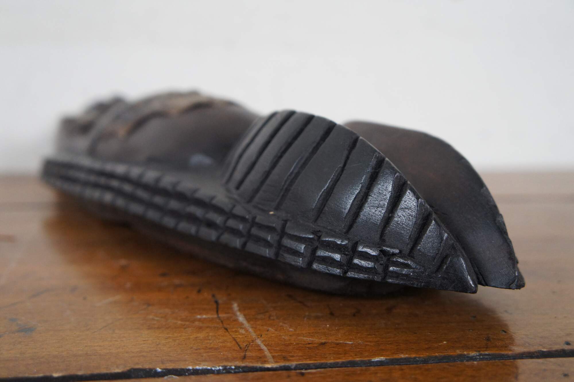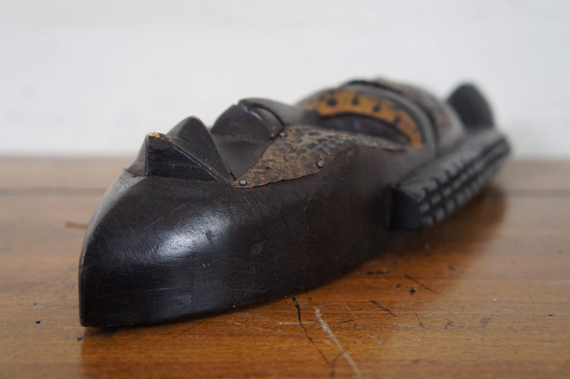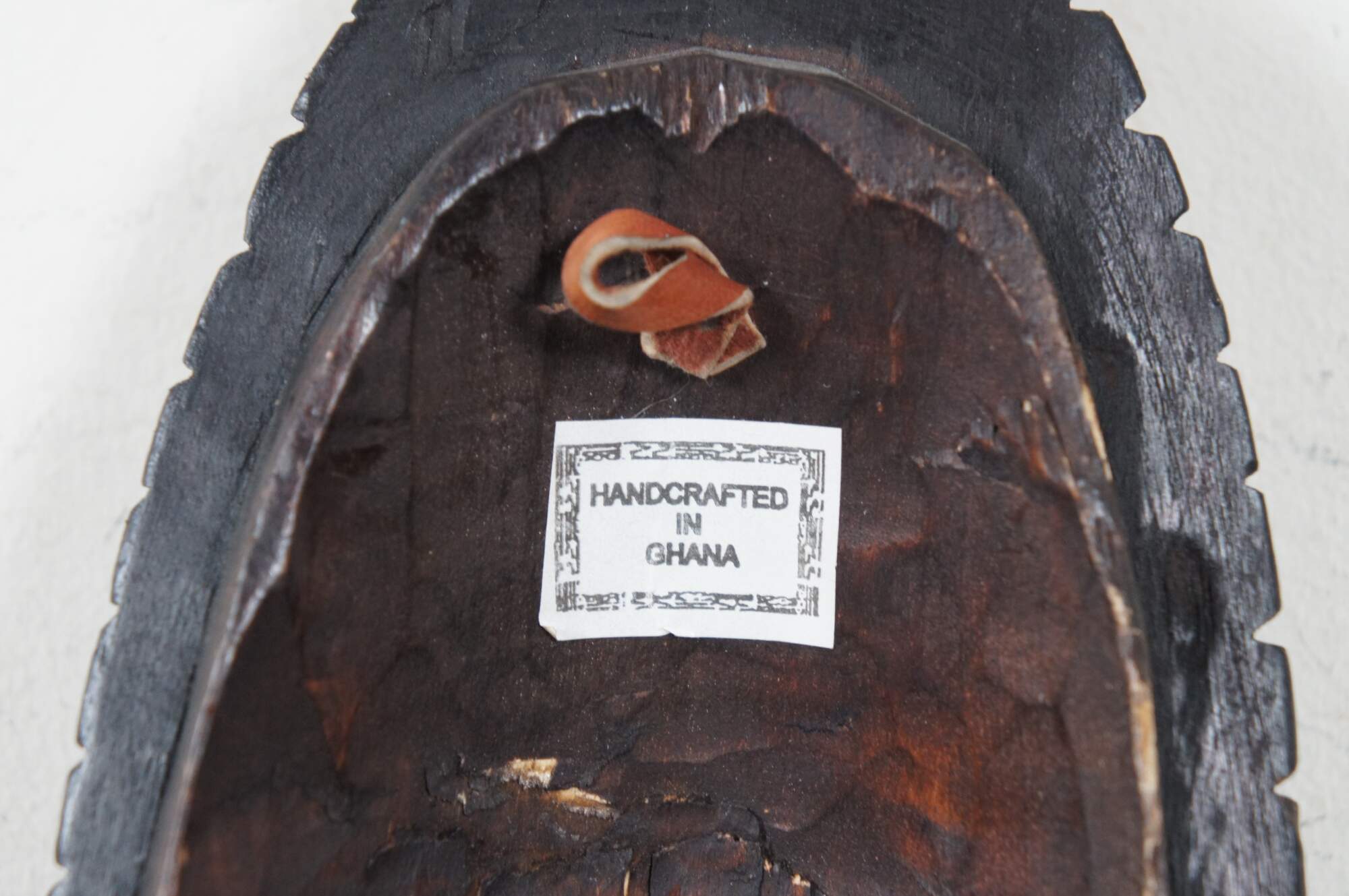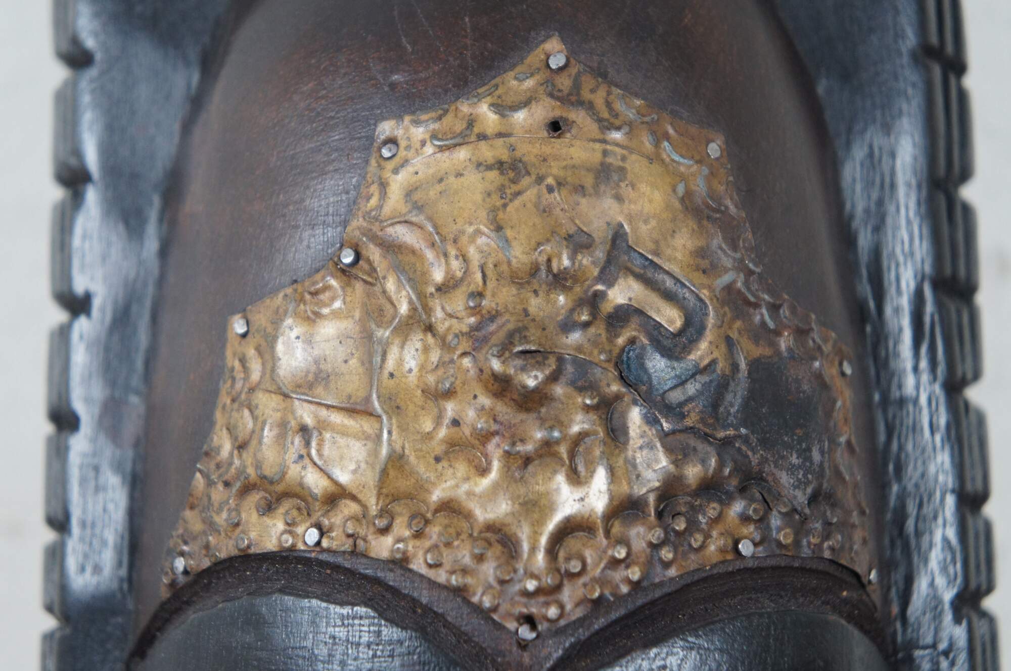 Vintage Ghana African hand carved tribal mask featuring an elongated slender warrior face with hammered copper accents and leather hanging strap.