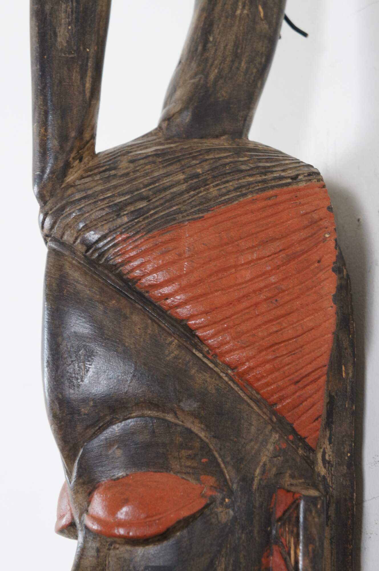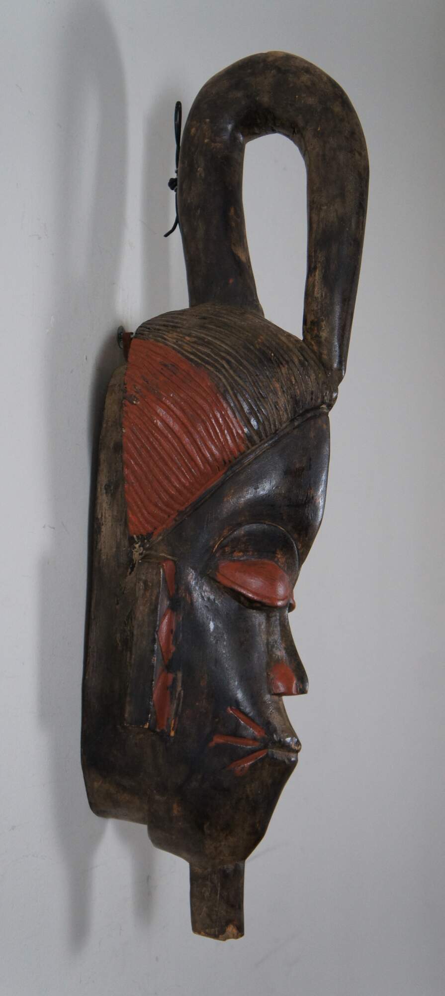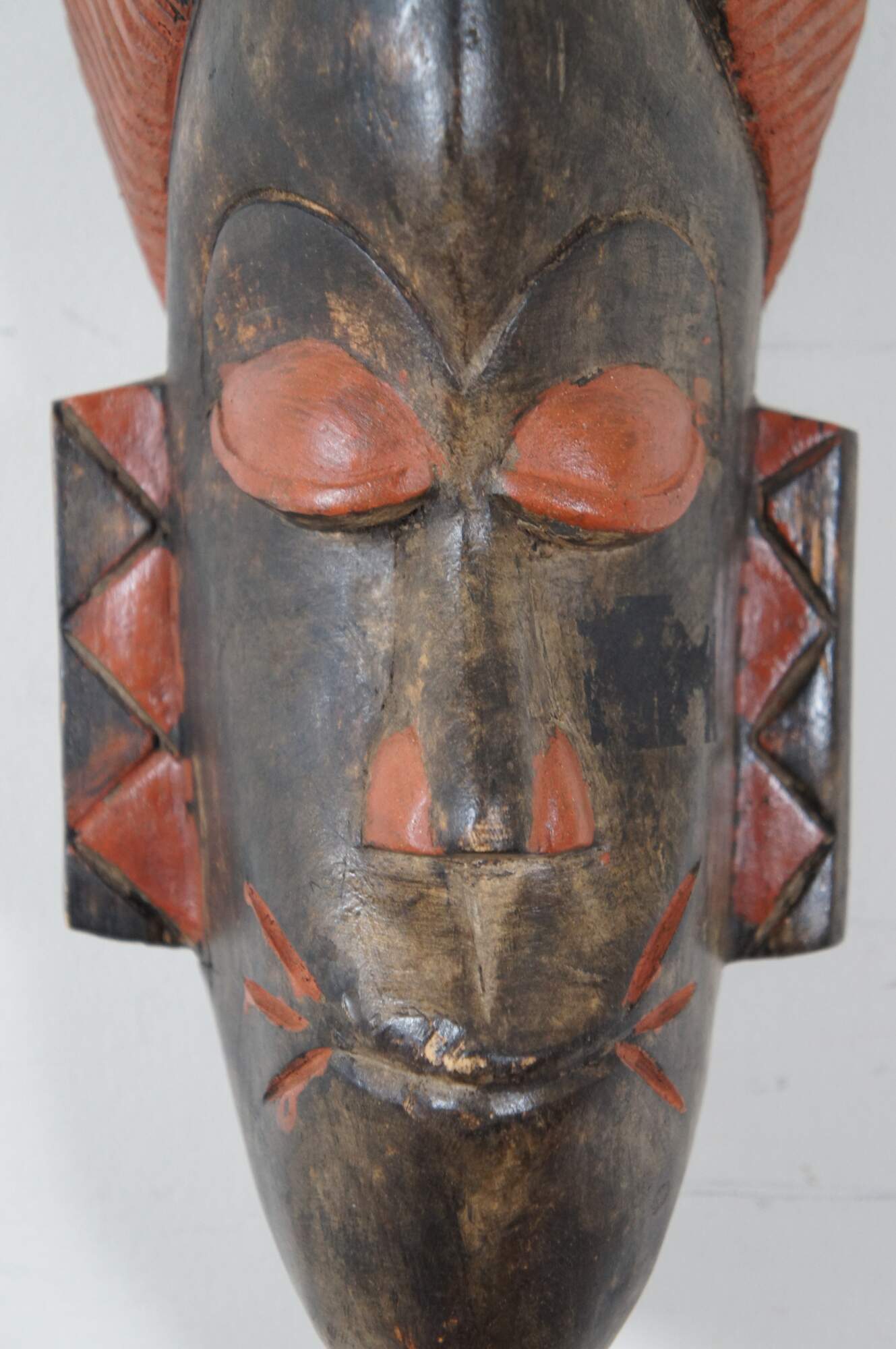 Vintage African folk art wall hanging mask, hand carved wood painted red and black with large headress and goatee.