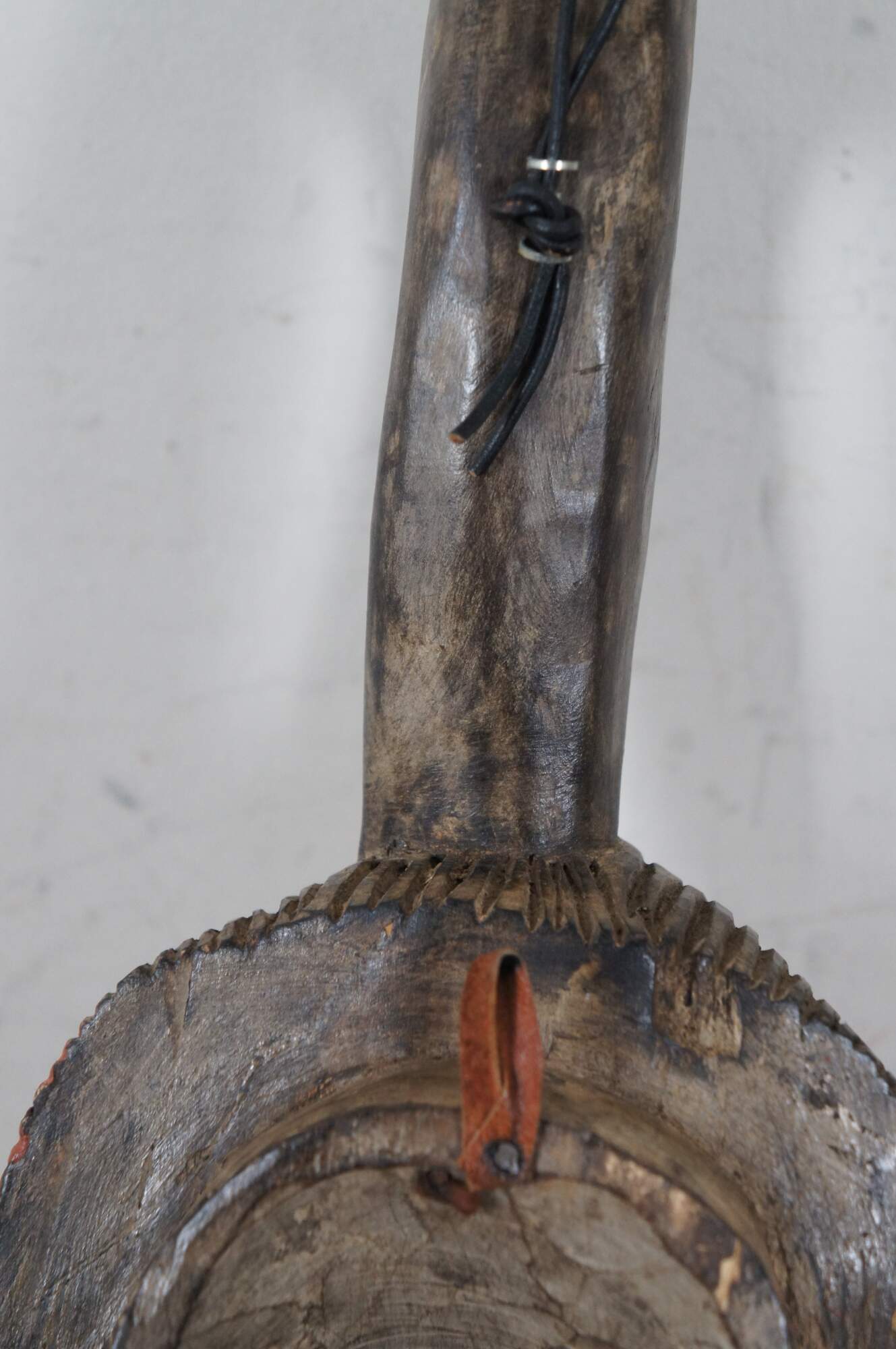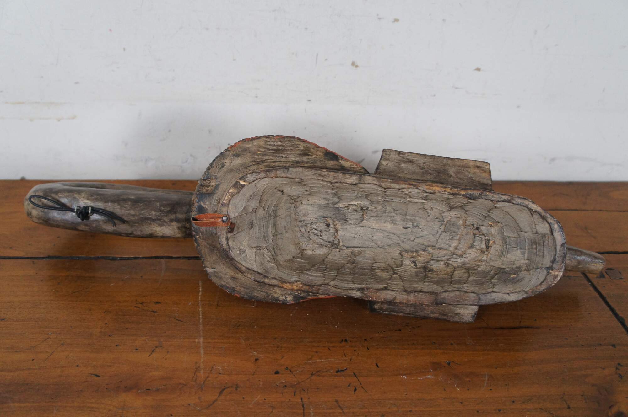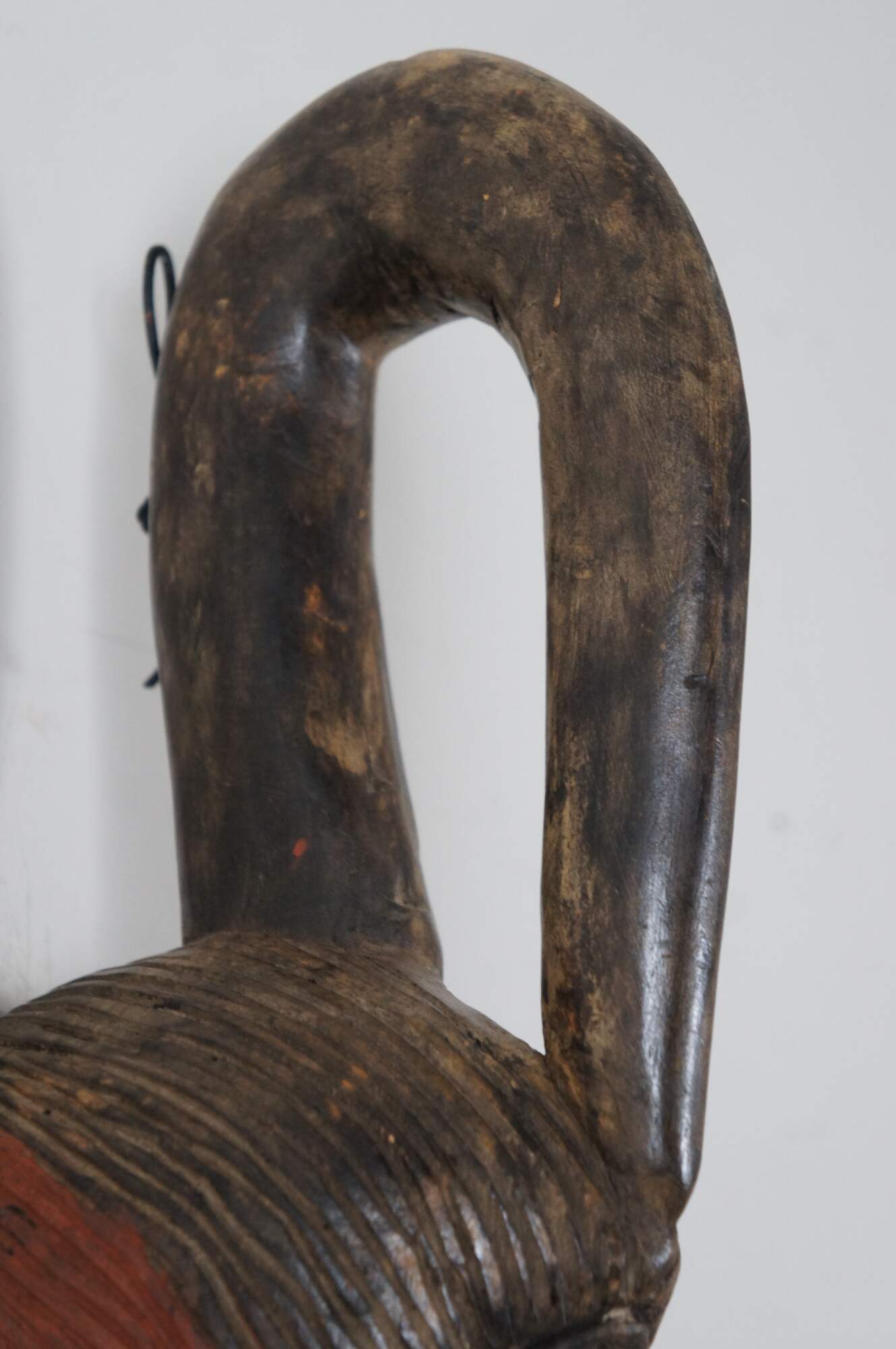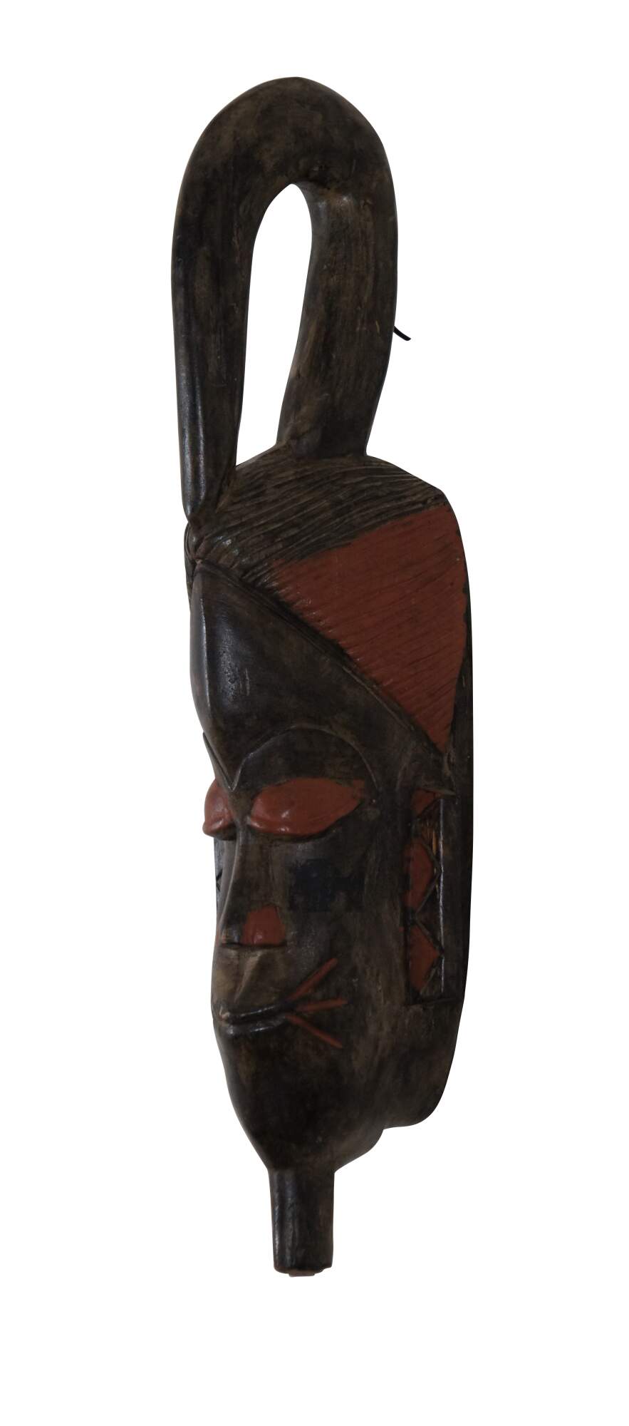 Vintage African folk art wall hanging mask, hand carved wood painted red and black with large headress and goatee.