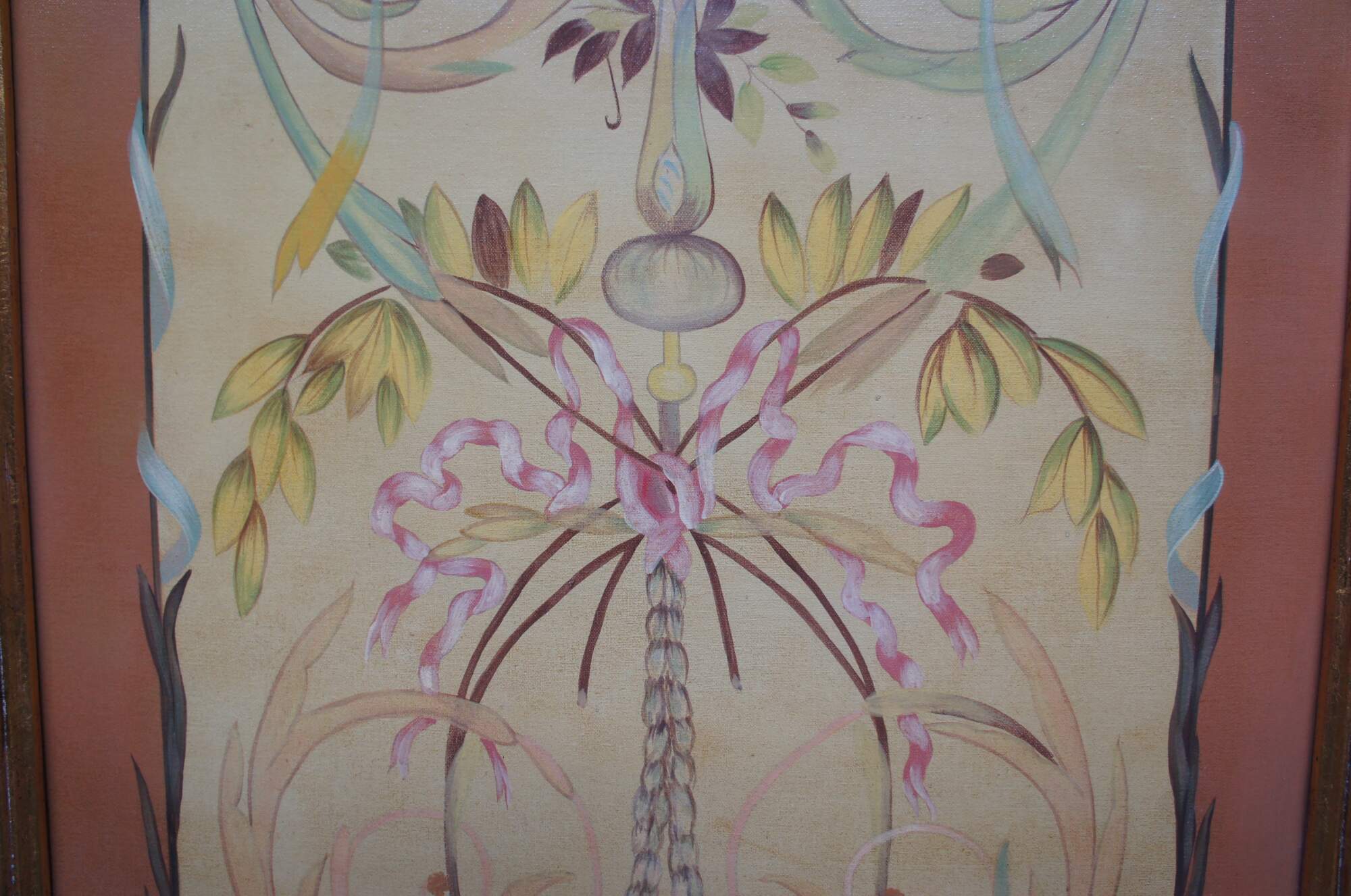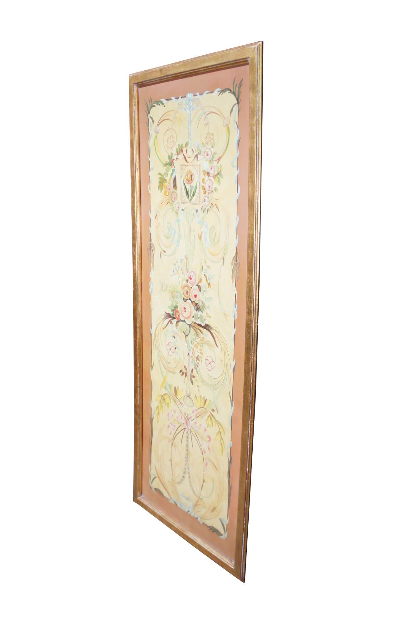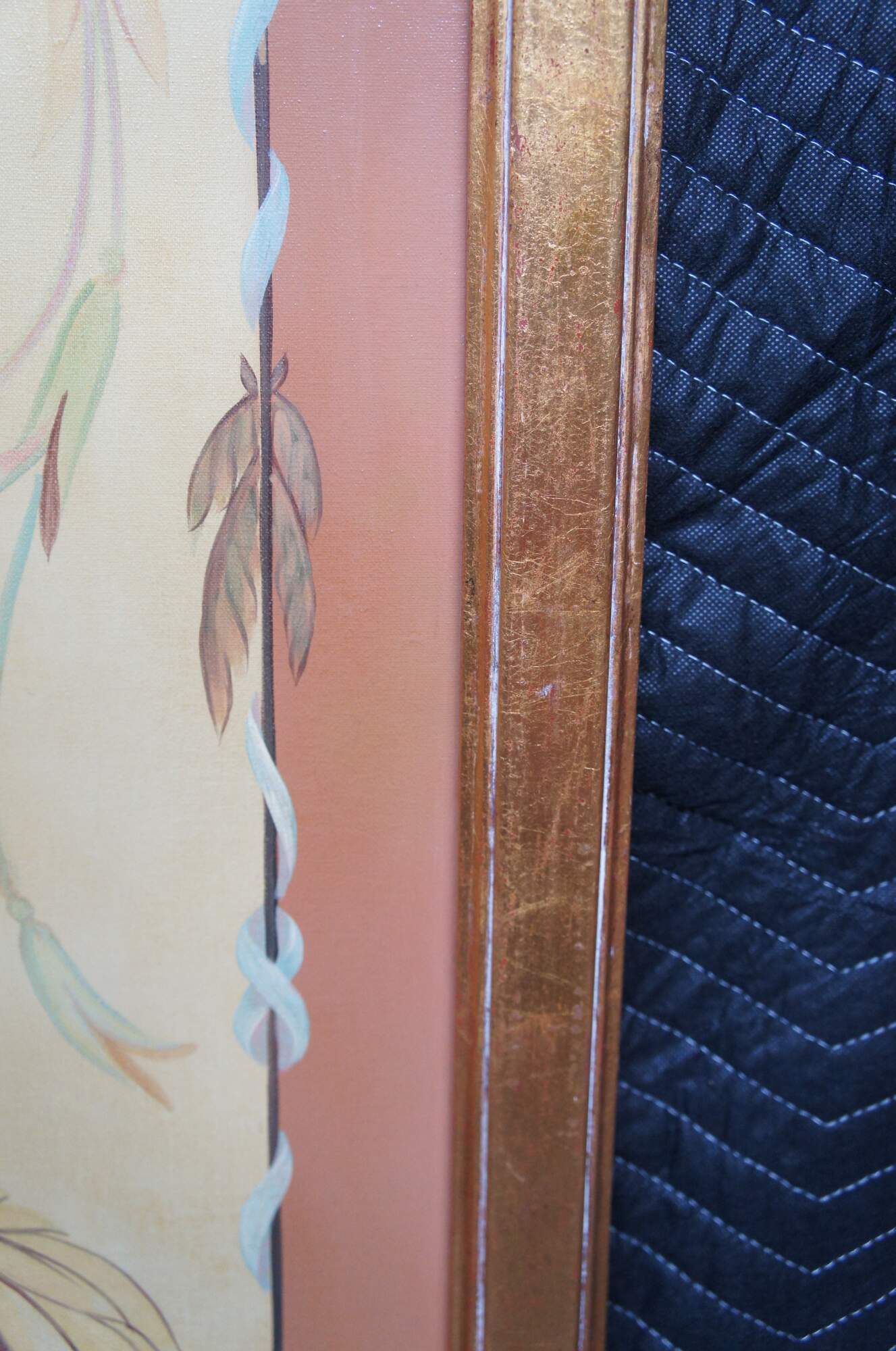 A large impressive hand painted wooden panel by Maitland Smith, circa 1990s. Features Neoclassical and French styling with floral sprays, ribbons and scrolled designs. Framed in antique gold over red. Signed along the back.
