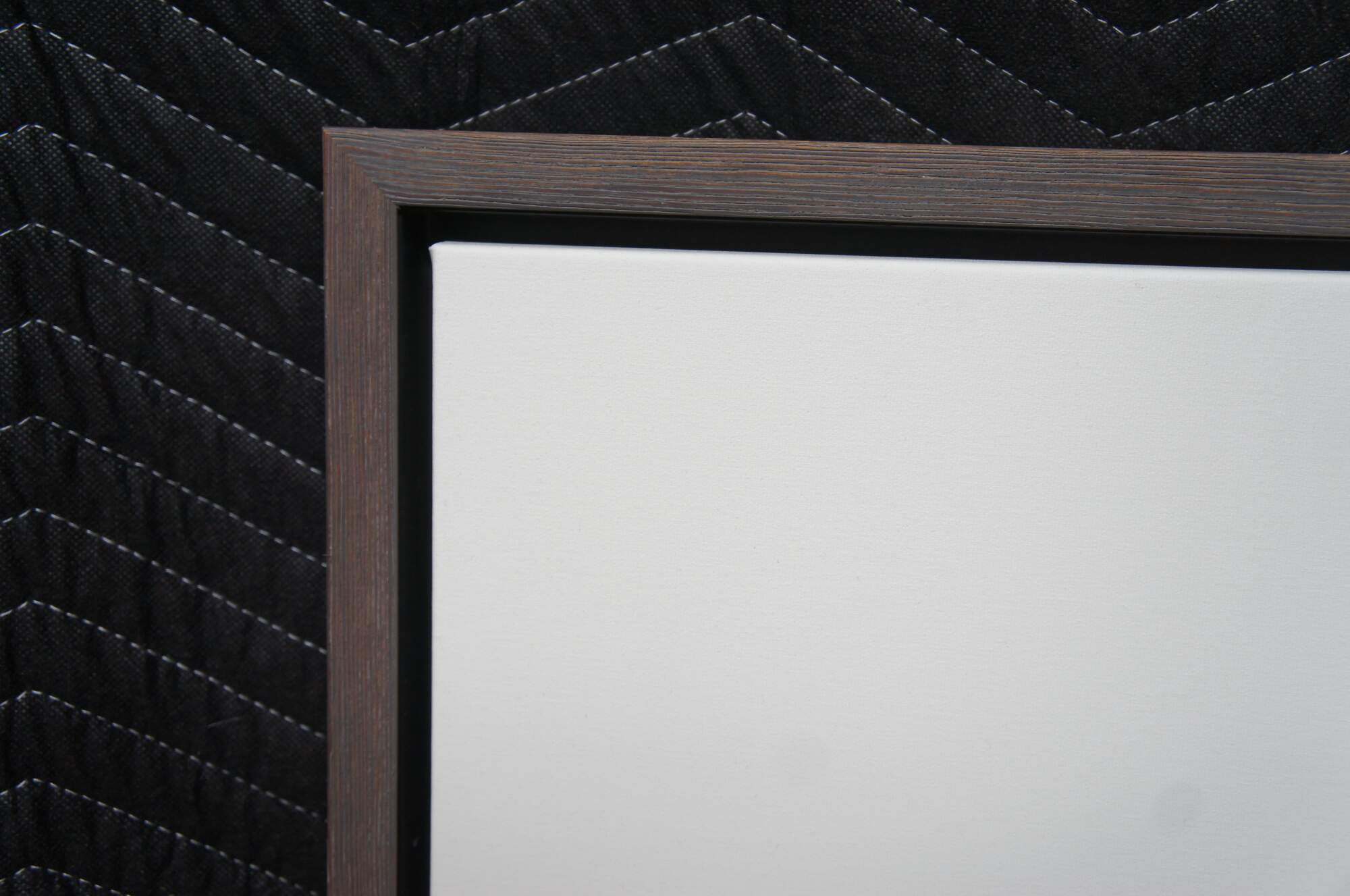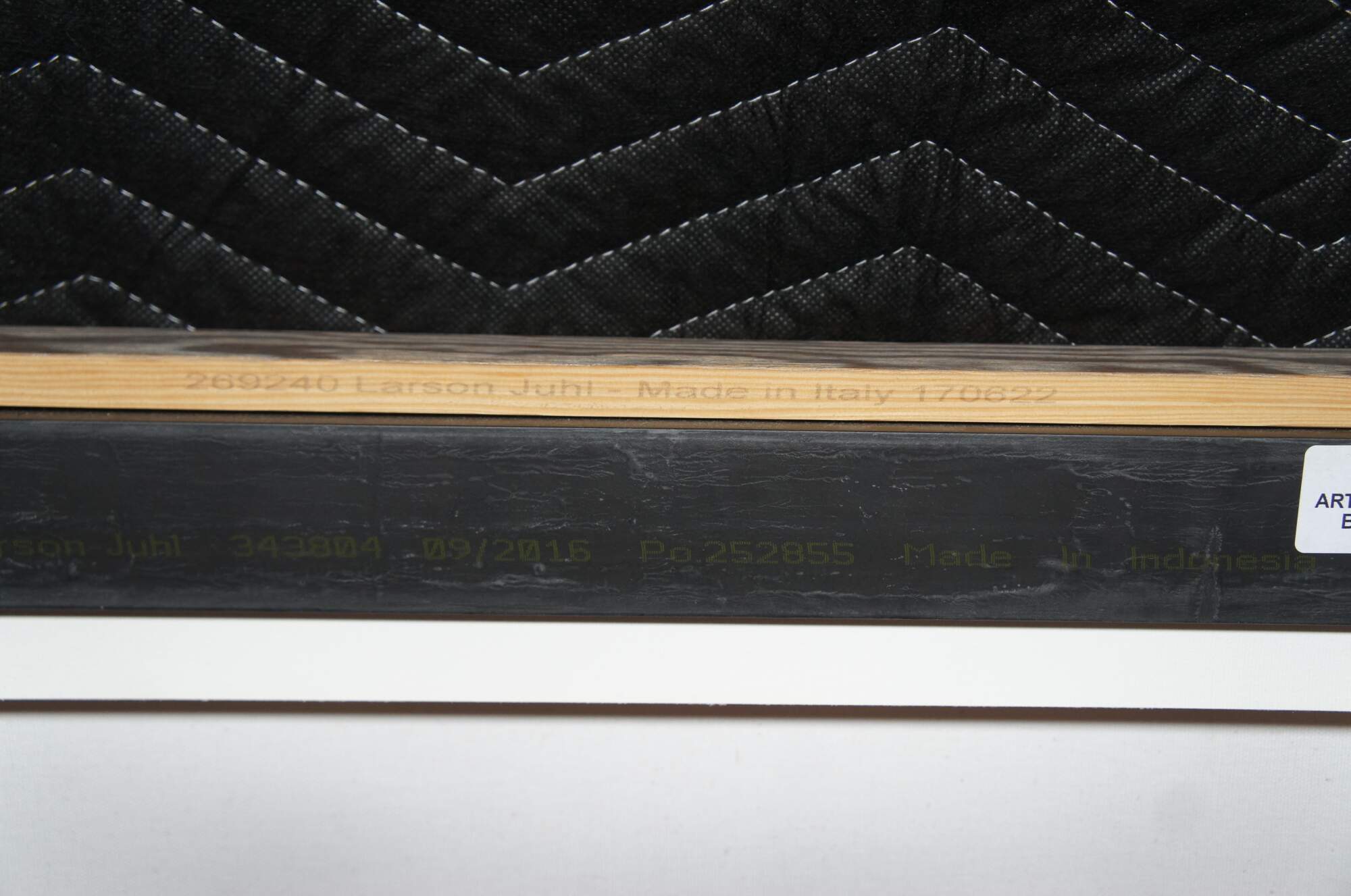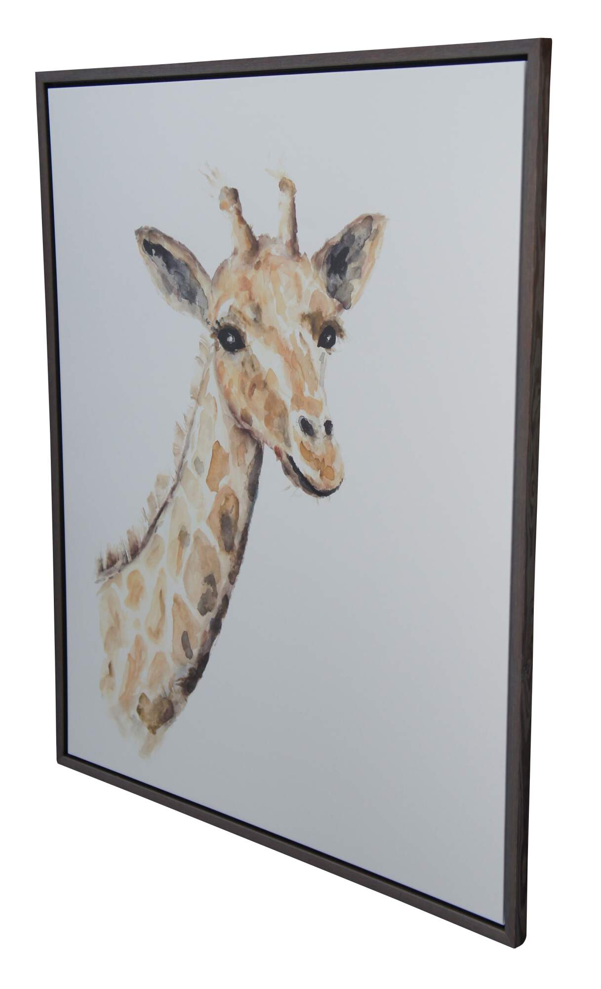 A fun giraffe watercolor painting on canvas from Restoration Hardware. Framed in oak by the Larson Juhl an industry leader in framing.