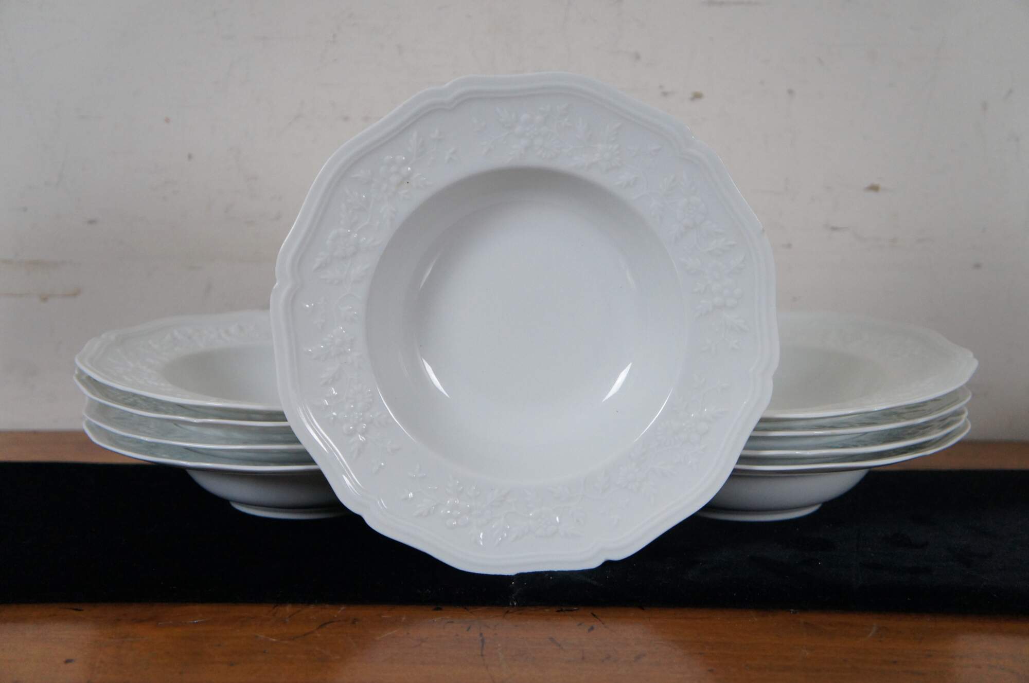 Vintage 76 piece embossed white floral Limoges porcelain dinnerware set with service for 8 in the Hawthorne (Hawthorn) pattern. Produced by Ceralene / A. Raynaud et Cie of Limoges, France. Variety of marks suggest this set was purchased and pieced together over a number of years.