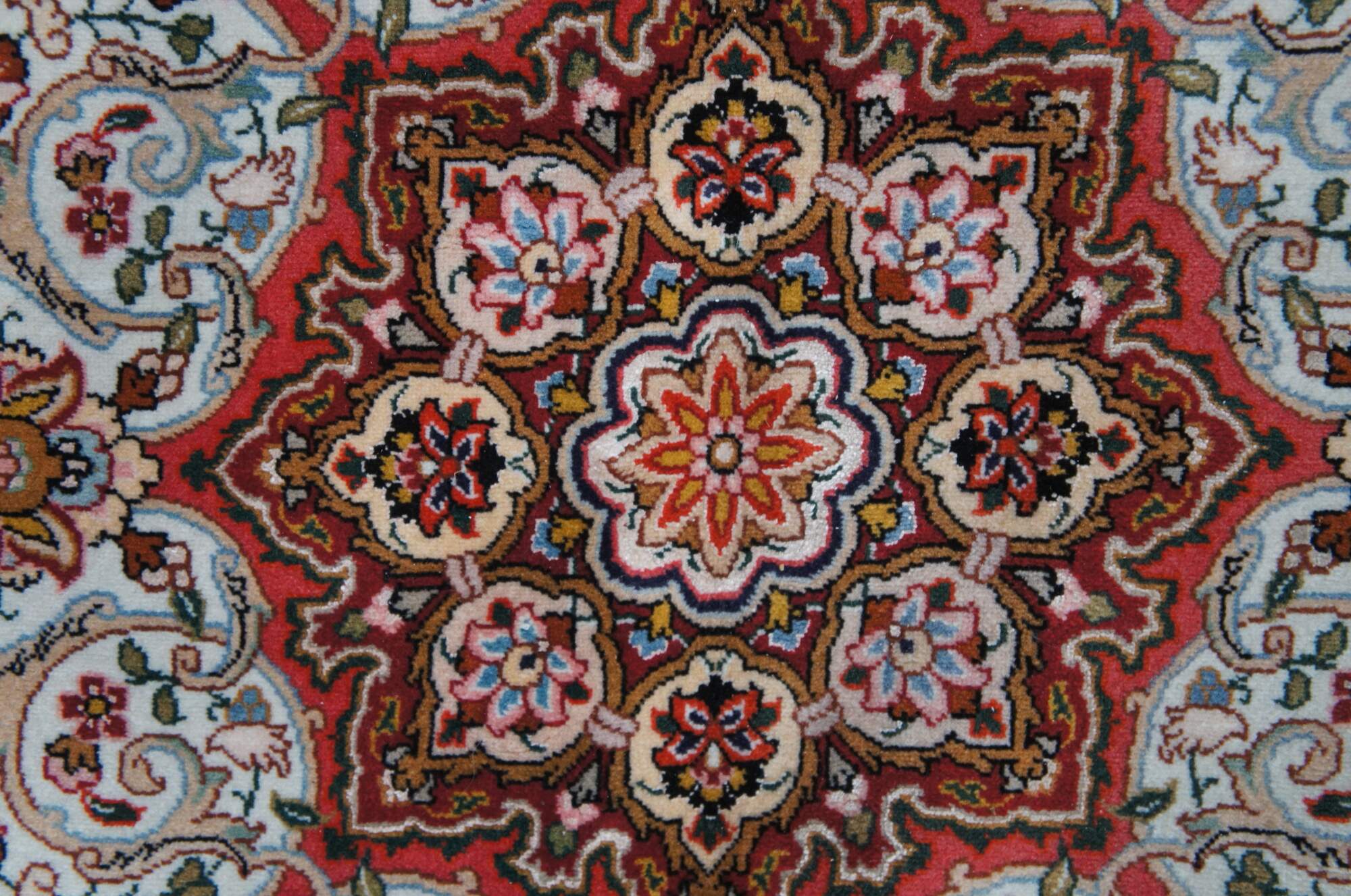 Very high quality vintage hand knotted Persian Tabriz. Features silk and wool pile featuring a red field with central medallion and floral all over design with birds. Reds, Blues, Tans, Creme, Pink, Greens, Yellows, Orange, Browns