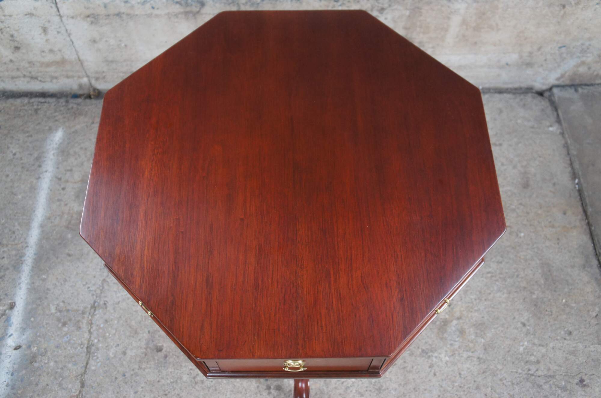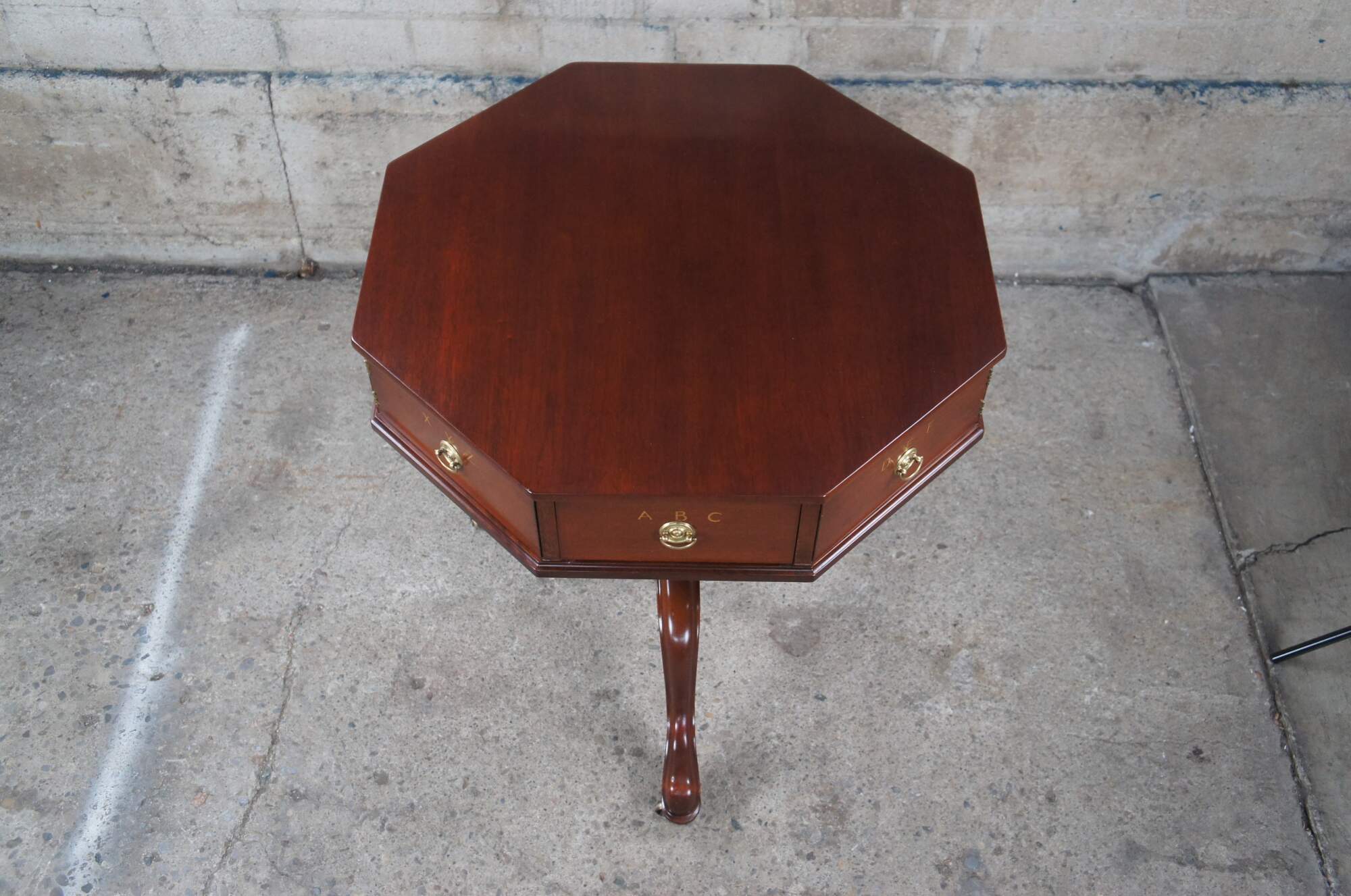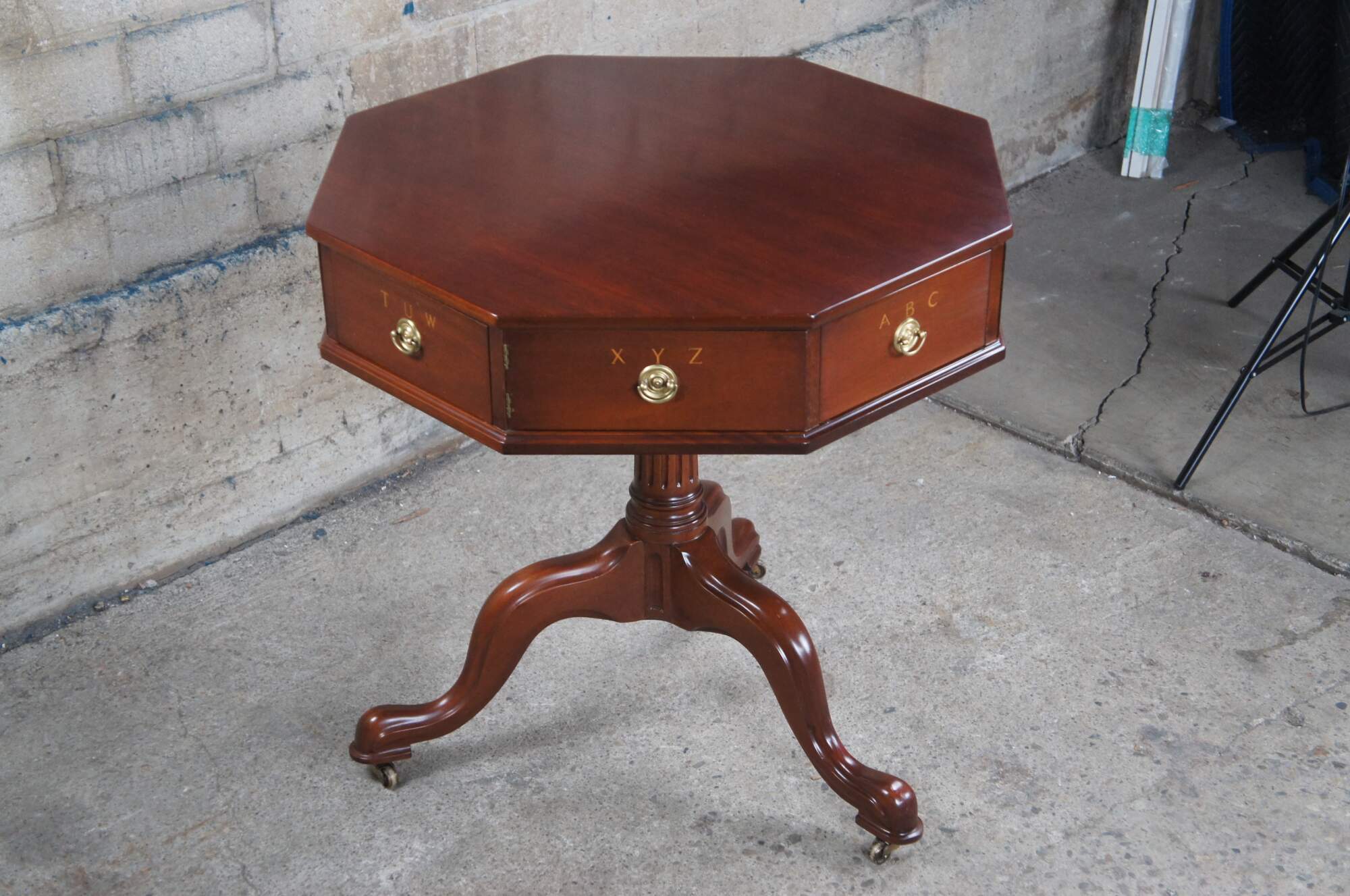 A beautiful mahogany File or Rent table by Kittinger. This table is part of the Thomas Jefferson collection that was authorized by the Thomas Jefferson Memorial Foundation. It is a reproduction of the original table which was used by Thomas Jefferson and is located in the Monticello Library today. It has an octagonal top with hand-turned/hand-carved fluted pedestal baseending in a hoof foot. The four dovetailed drawers and four hinged door compartments have inlaid boxwood alphabetical lettering. The top swivels 360 degrees. Originally Purchased from William W. Sauer Associates Ltd. Virginia Beach, VA in 1997.