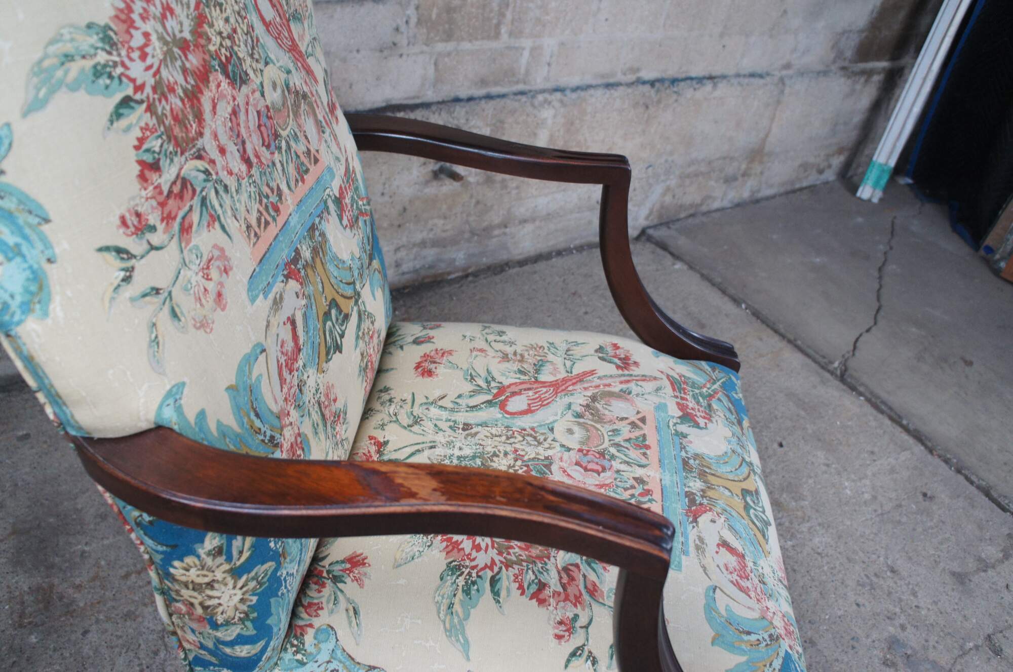 Pair of 20th Century Federal Style Martha Washington Lolling armchairs. Reminiscent of the Gainsborough chair that was made in England in the 18th century. Made of mahogany featuring traditional wide form with serpentine high back and open downswept arms. Upholstery features floral and bird chinoiserie motif with trophy urn centerpiece bouquet of flowers.